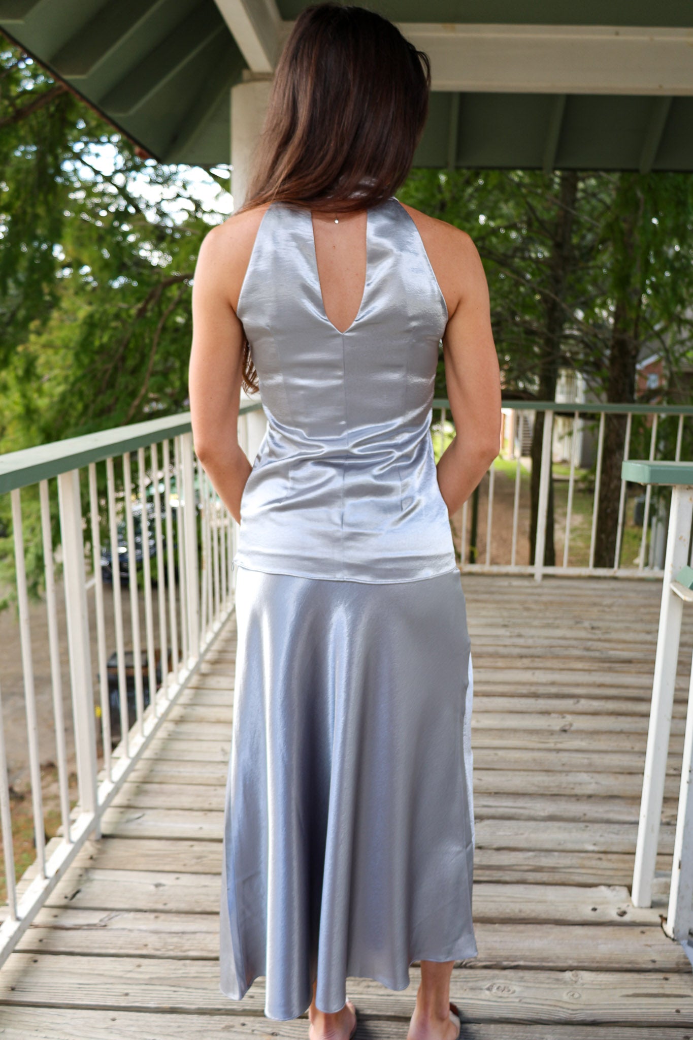 The Addison Halter Top is a total showstopper. Crafted from luxe satin-like fabric in a shimmering chrome shade, it features a stunning funnel neckline that flows into a subtle cowl. The halter design shows off your shoulders and back in the best way, while the relaxed fit keeps it comfy. Tie it at the neck and you're ready to turn heads.