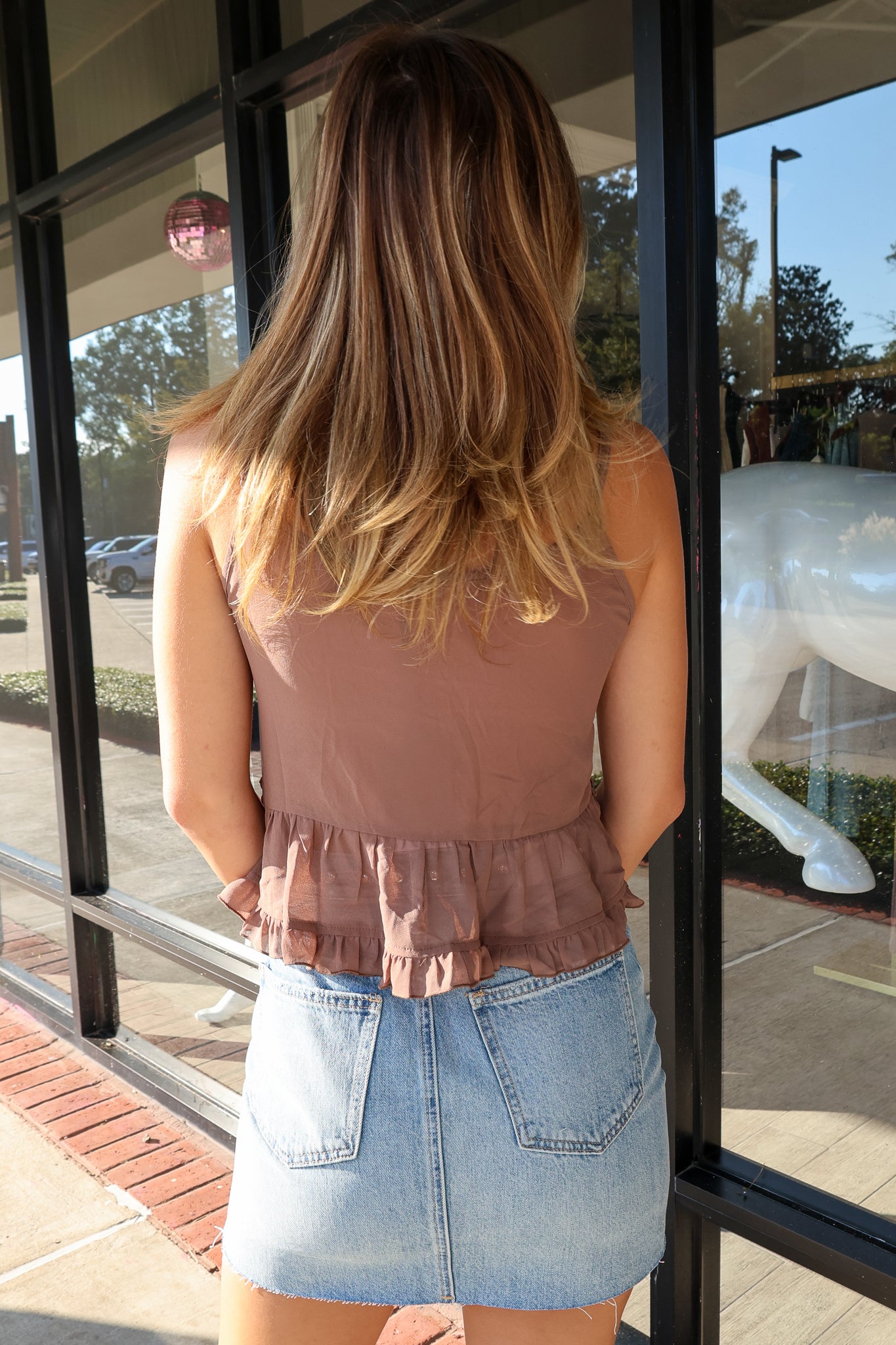 The Adrienne Top is a super cute, sheer brown sleeveless blouse with fun ruffles and a front tie closure for that casual, trendy vibe. It’s lined at the top to keep it comfy and avoid any see-through worries. Perfect for layering or rocking solo on warm days!