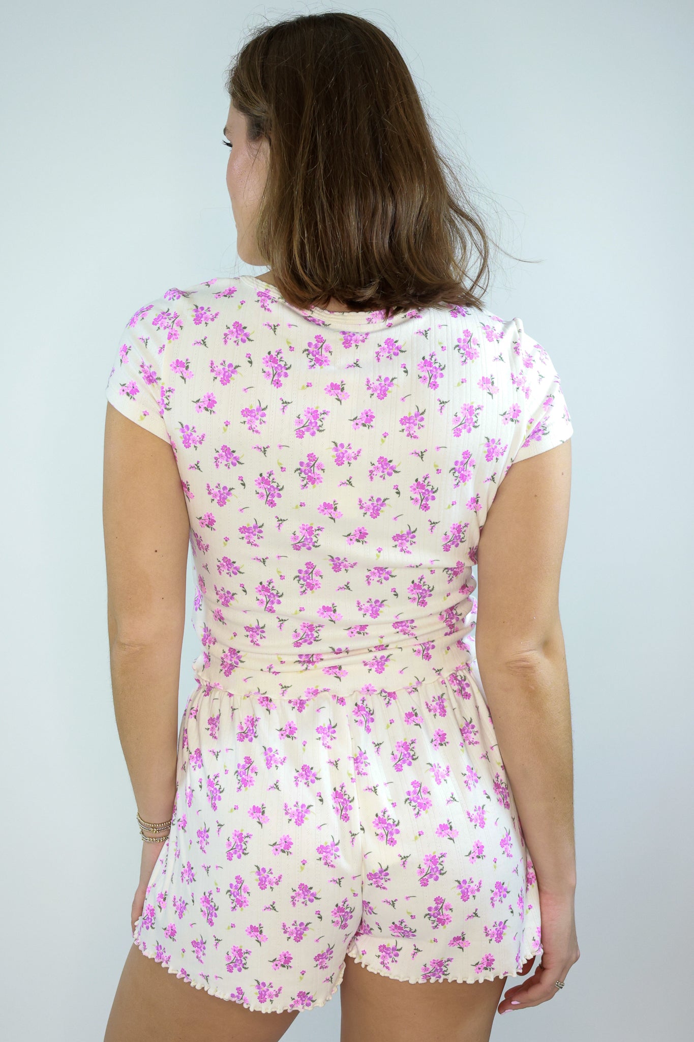 The Amour Short features a delicate pink and purple floral design, ideal for a comfortable and stylish lounge look. Simply pair it with our Flower Market Tee for a complete and charming outfit. Crafted with soft material, these shorts offer both fashion and comfort.