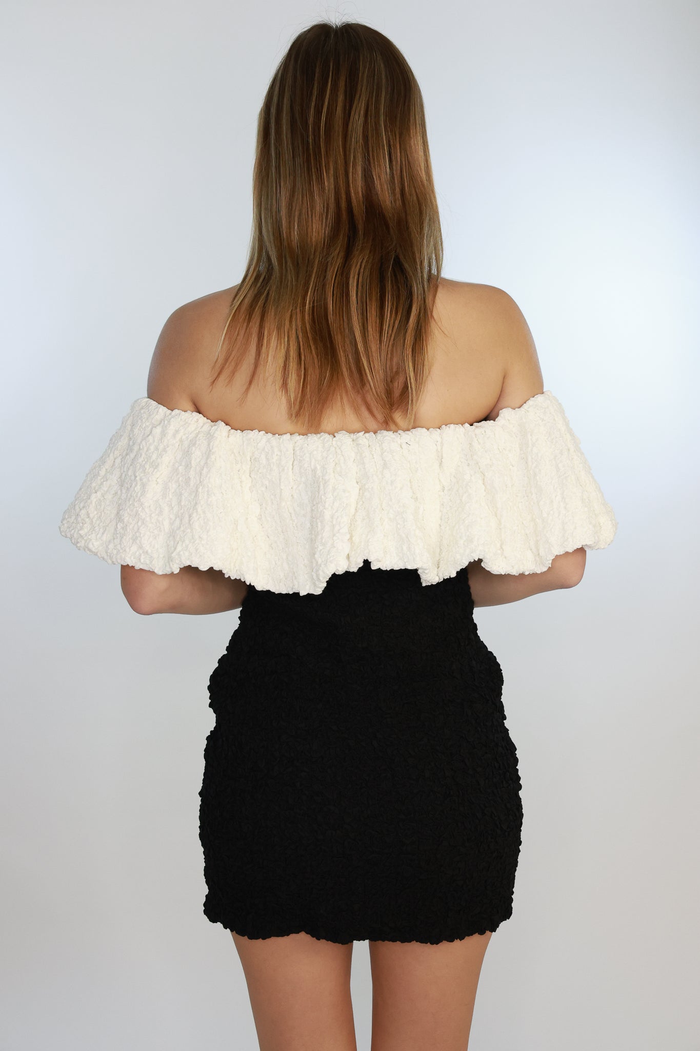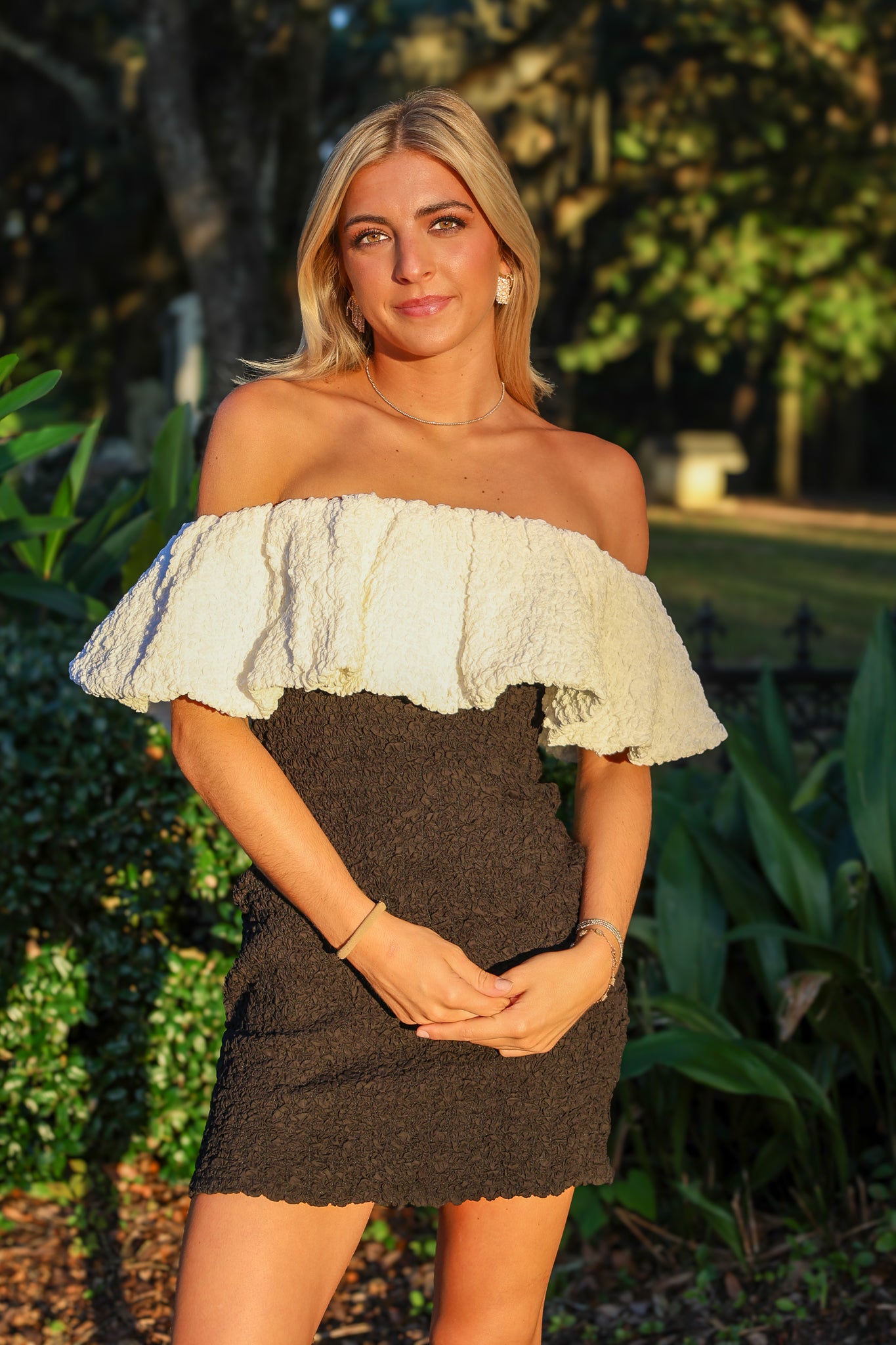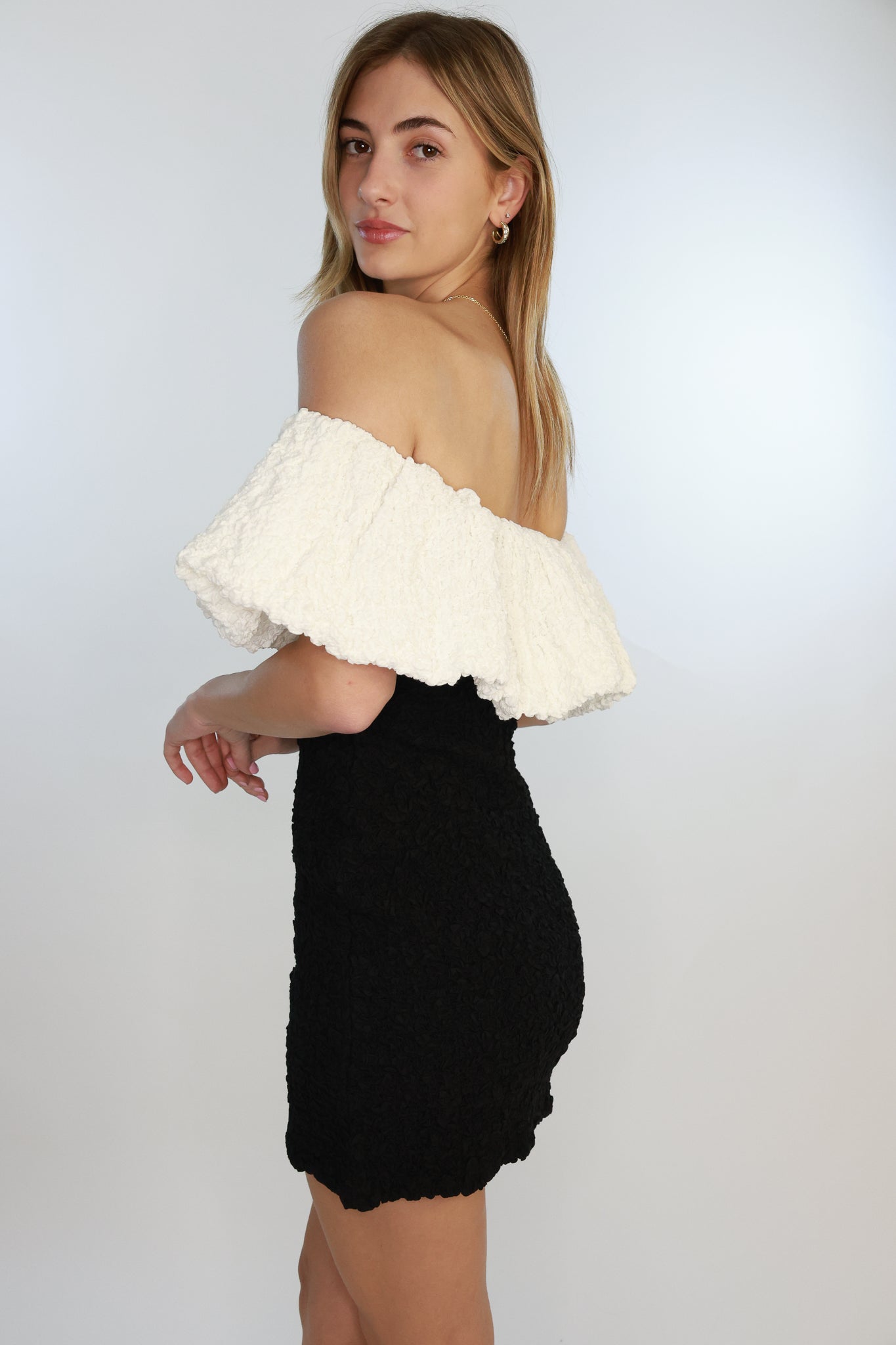 This textured off-the-shoulder mini dress features a stylish contrast color collar. Designed for comfort and style, it is perfect for any occasion. Its unique design and trendy color contrast make it a must-have piece for your wardrobe. Elevate your look and show off your fashion expertise with the Anita Mini Dress.