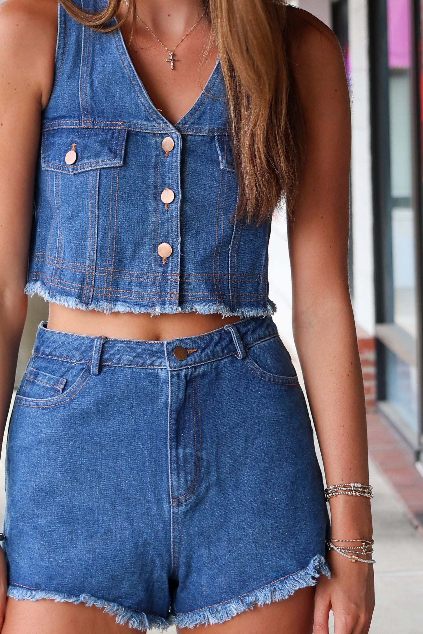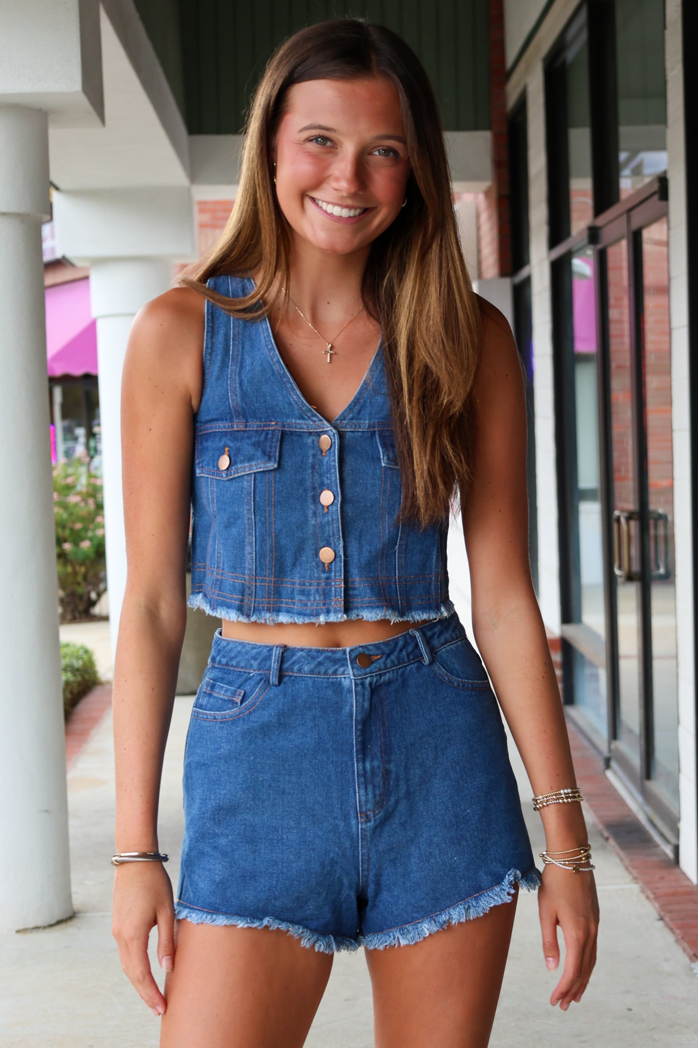 Get game day ready with the Anna Set, featuring a cropped denim vest and matching denim shorts, both with trendy frayed hems. This duo gives off chill, laid-back vibes while keeping your look fresh and stylish. Perfect for hanging out with friends or hitting up your favorite spots!