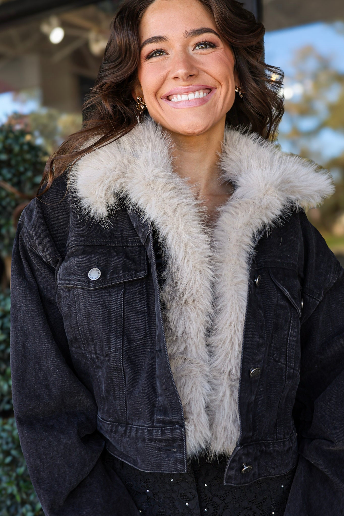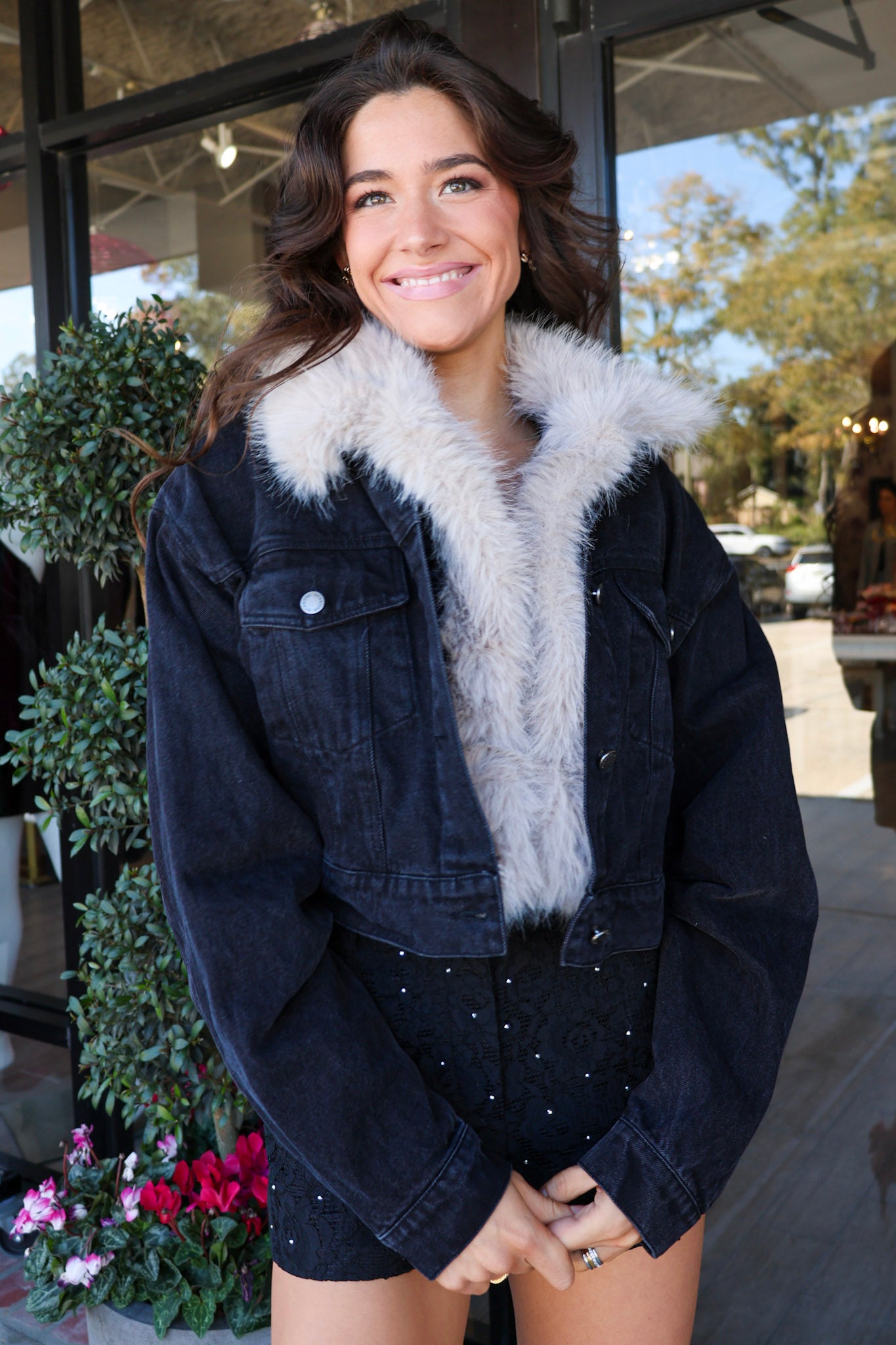 Edgy washed black denim jacket with a plush faux fur collar that hits different. Layer it over everything for that effortless cool-girl vibe. The distressed denim gives major attitude while the soft fur adds unexpected texture and warmth. Perfect for throwing on when you want to look put-together without trying too hard.