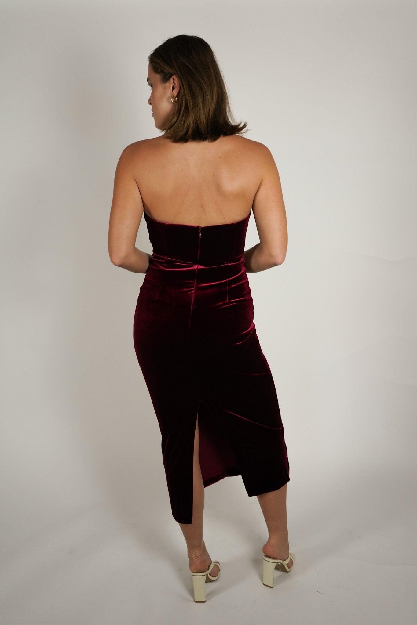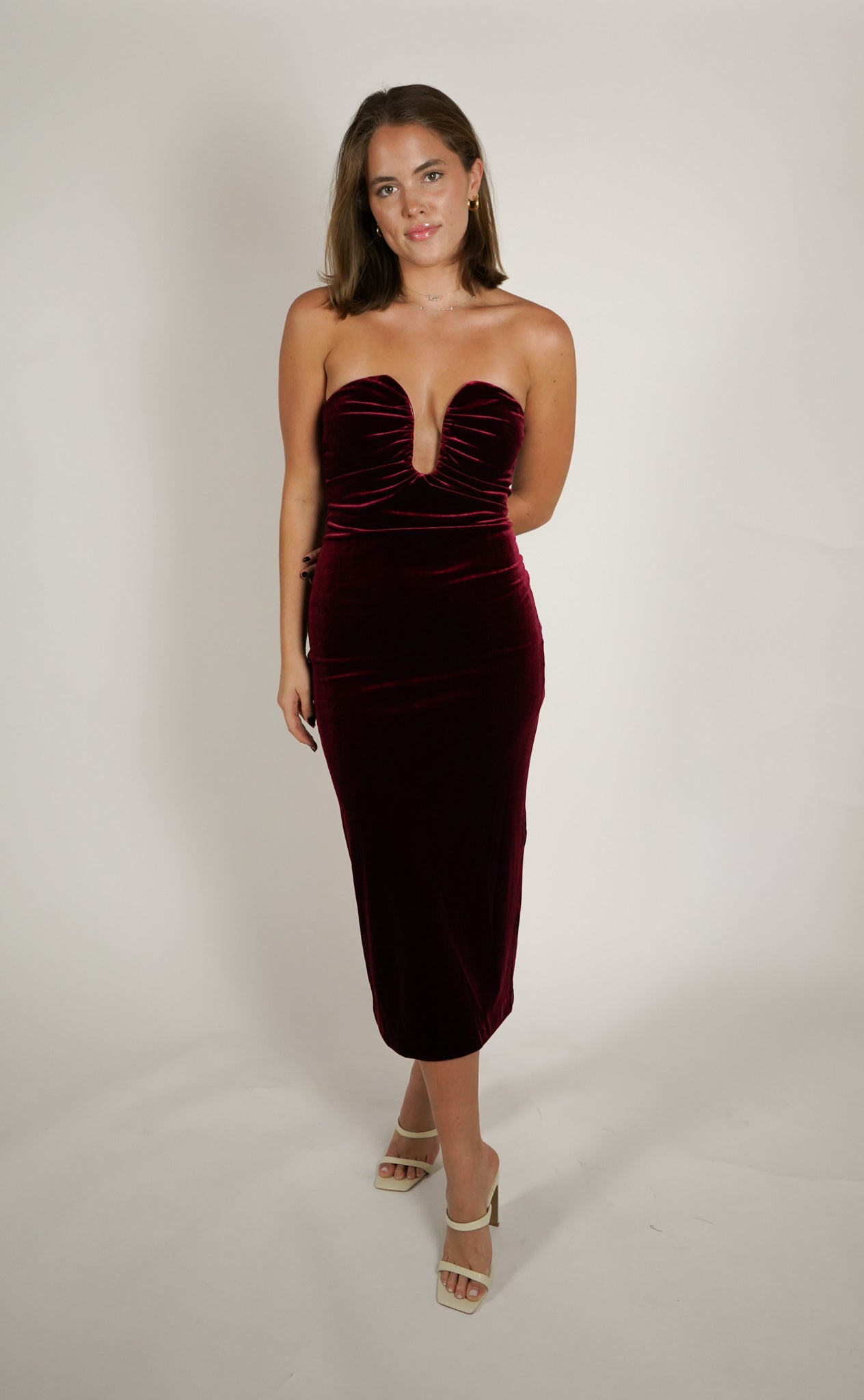Experience elegant style and luxurious comfort with the Arista Dress. Crafted from soft burgundy velvet, this midi dress boasts a flattering low cut neckline, perfect for showcasing your décolletage. Perfect for any occasion, this dress will make you stand out in the crowd with its sophisticated design.