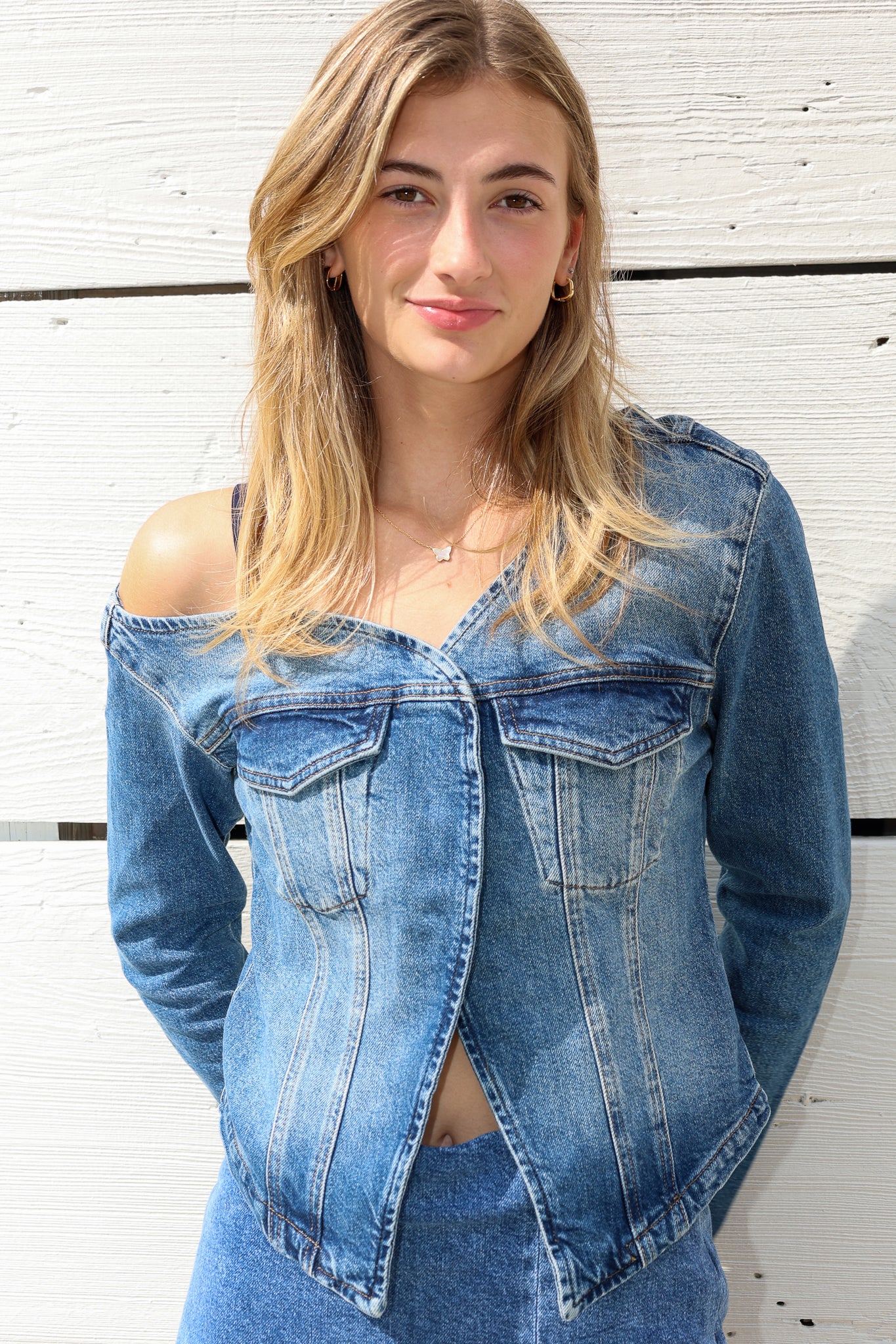 The Asymmetric Denim Shirt by Good American features a playful off-shoulder design and a unique asymmetric hem, perfect for showing off your fun side. With its long sleeves, this trendy shirt is both stylish and comfortable, making it a must-have addition to any wardrobe.