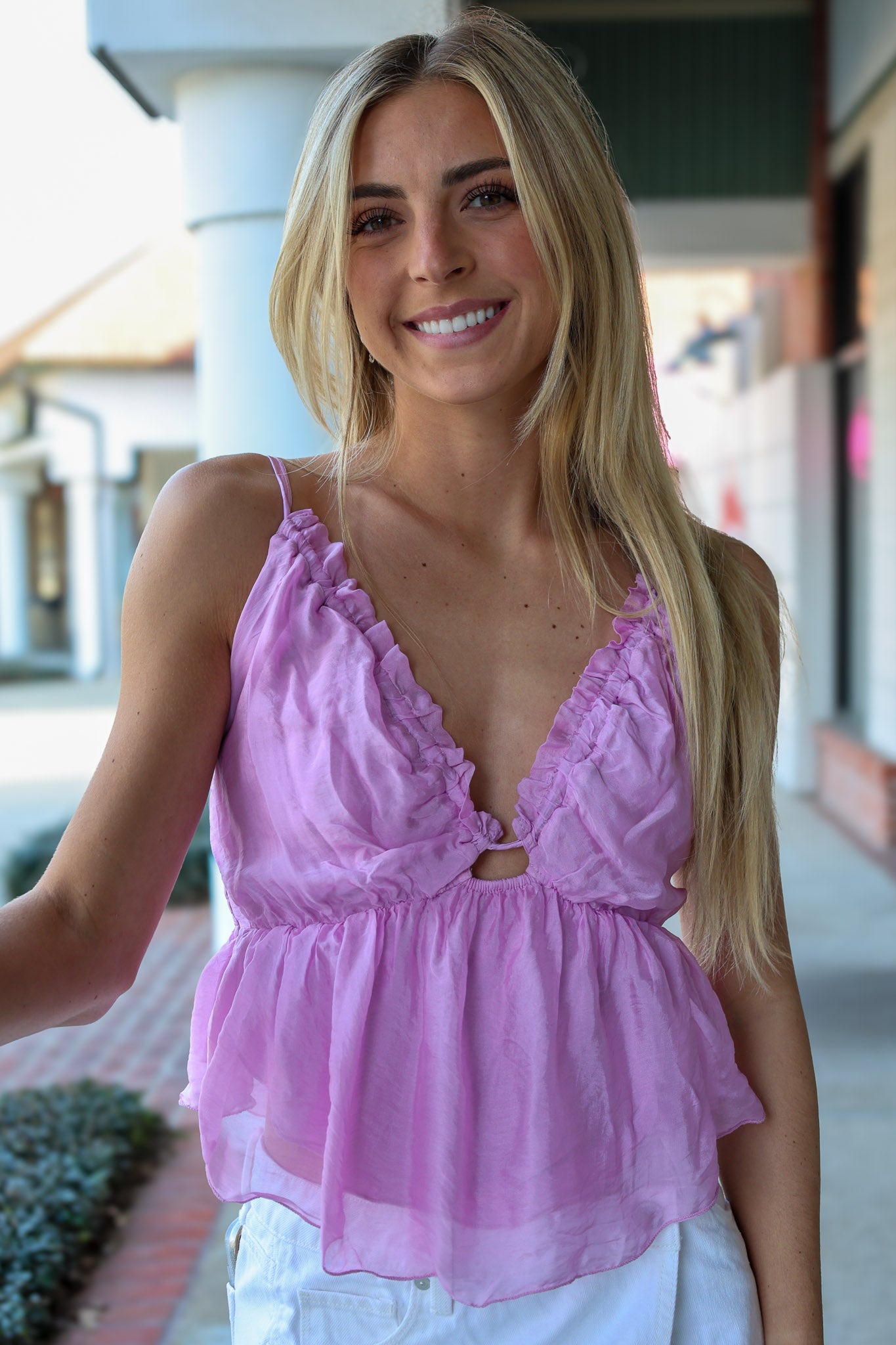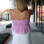 Crafted in Italy, this elegant silk blend Bacio Top combines effortless sophistication with vacation-ready style. The pinkish-lavender hue flatters every complexion, while the plunging neckline and sleeveless cut create an alluring silhouette perfect for date nights and getaways. A smocked waist adds refined texture and gentle shaping, making this piece as comfortable as it is stunning.