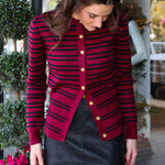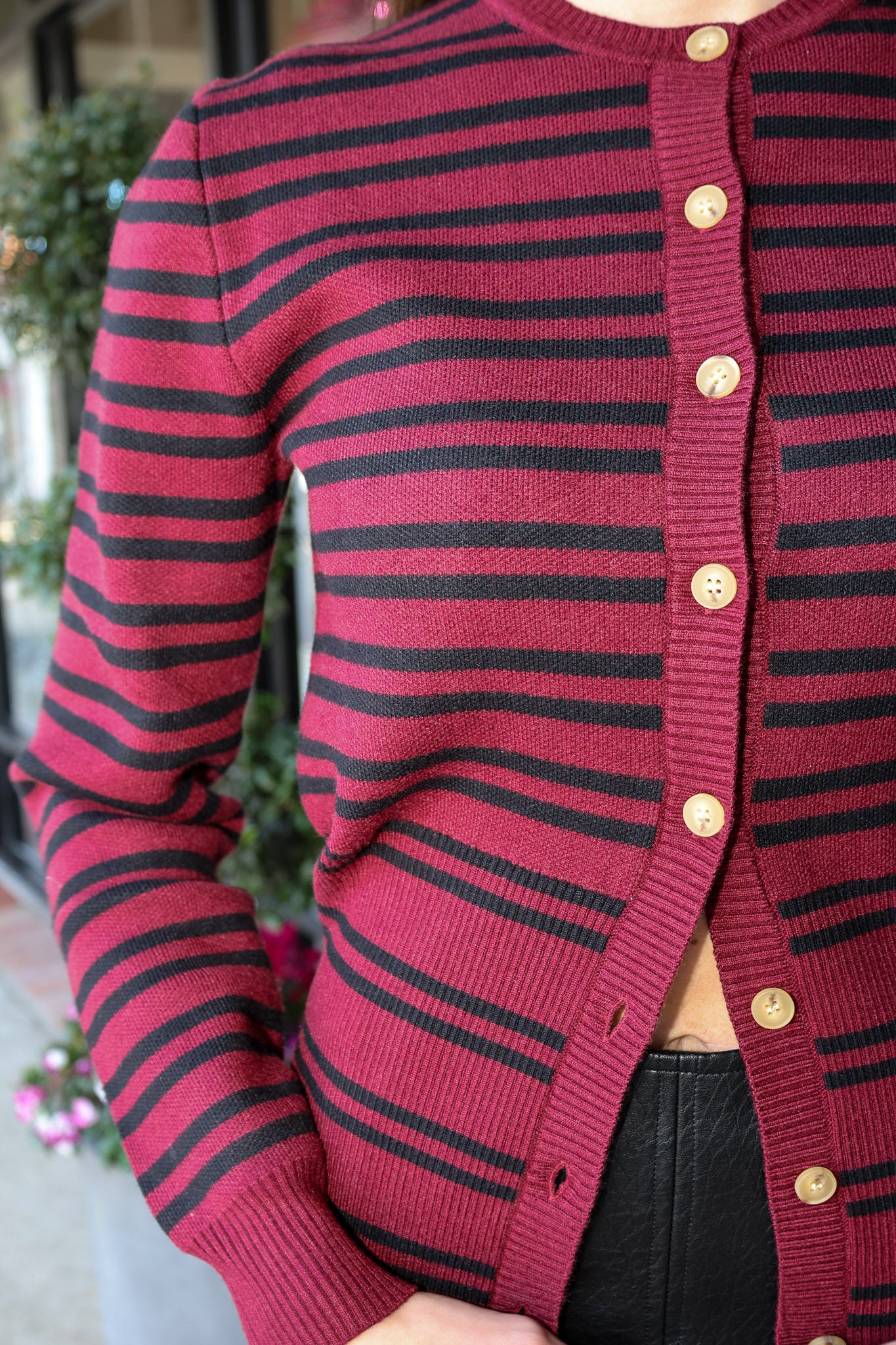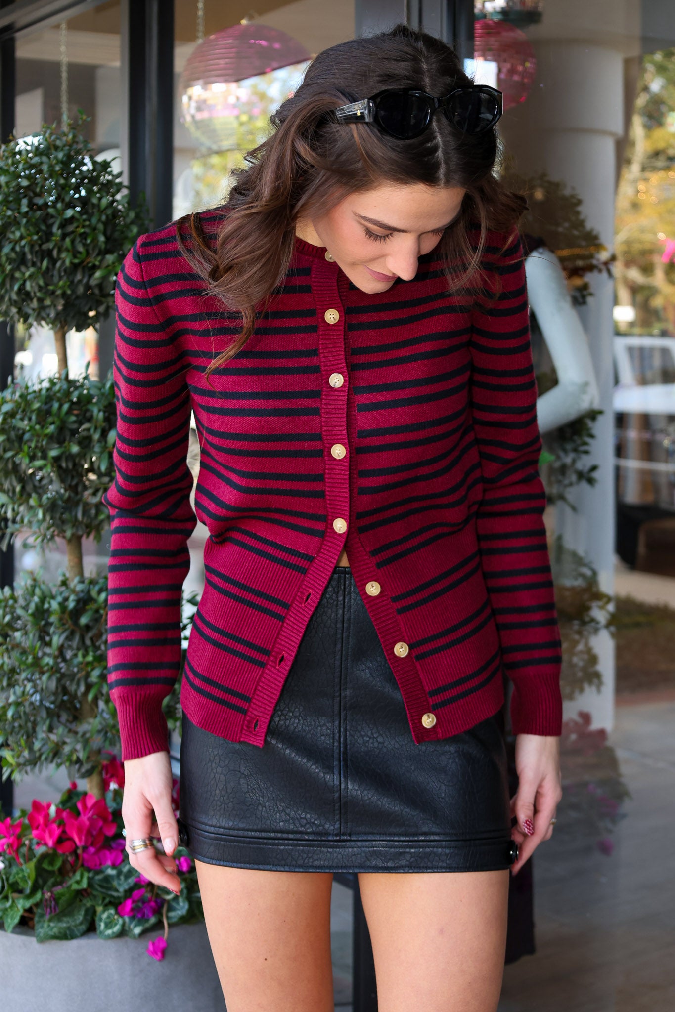 The Baxter Cardigan is the ultimate layering essential. Crafted from thick, cozy knit fabric, this piece features a bold oxblood and black stripe pattern that adds serious style to any outfit. Throw it over a tee, dress it up with a slip dress, or wear it solo—this cardigan works for literally everything. Soft, warm, and undeniably cool.