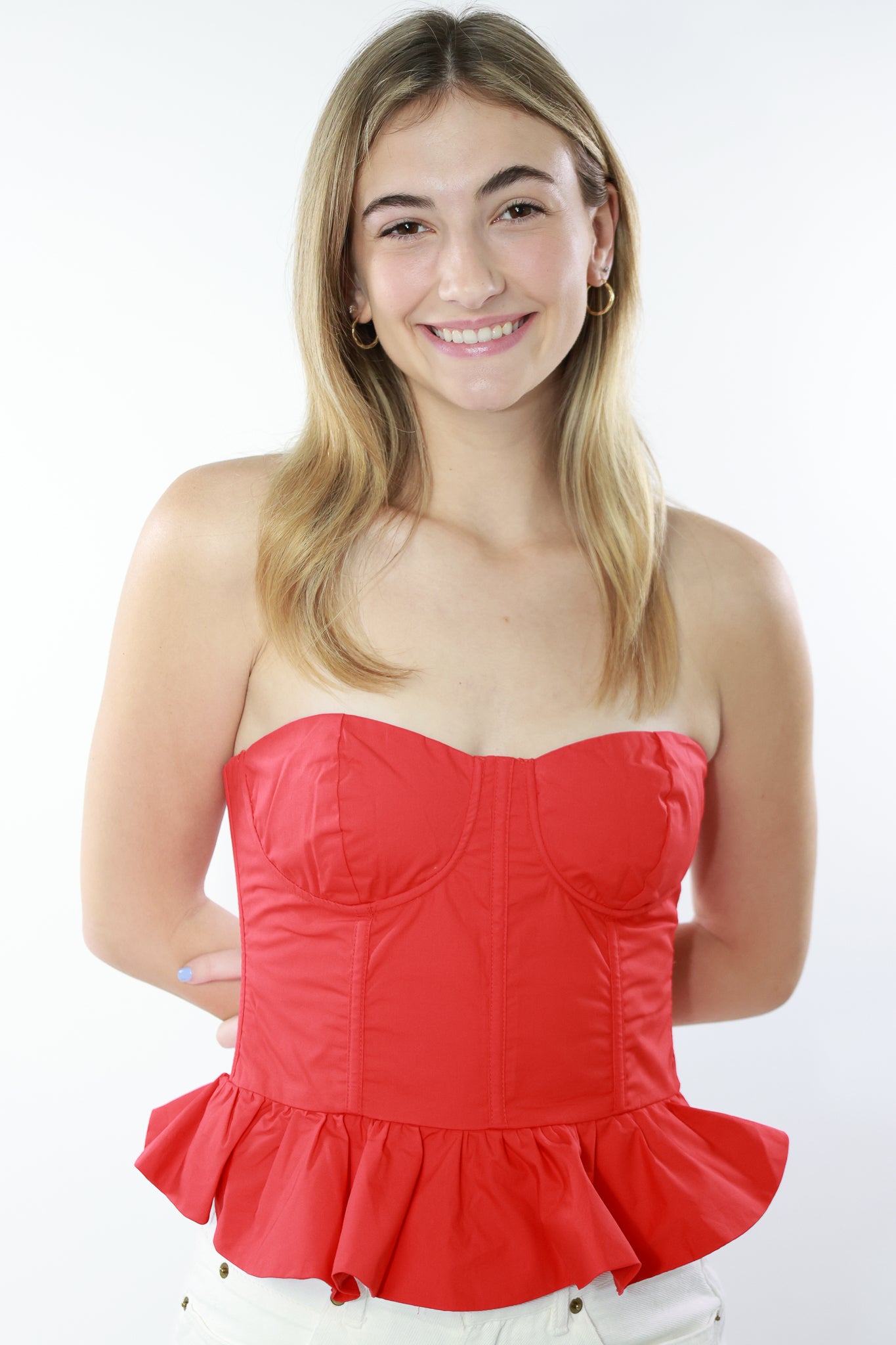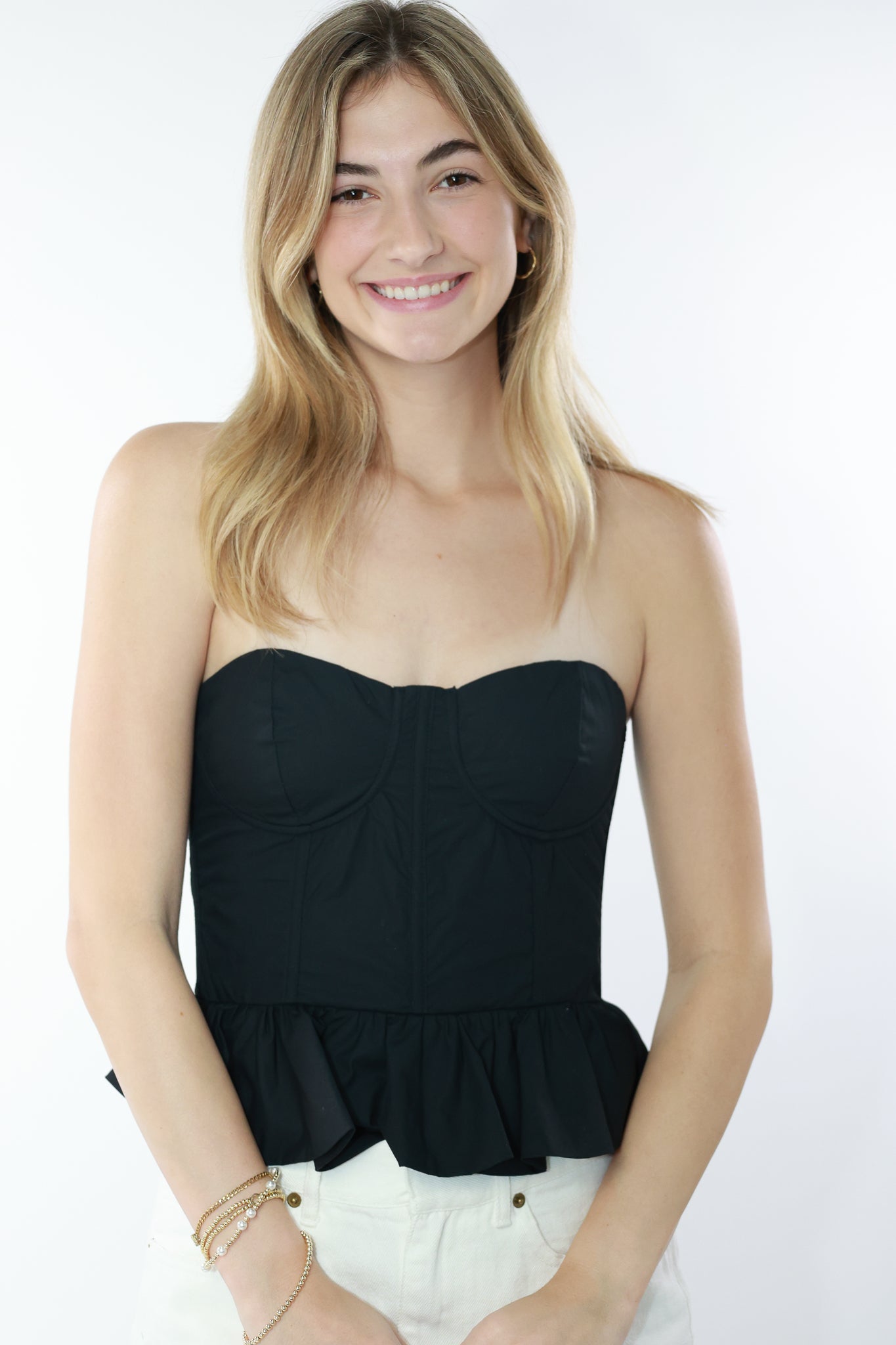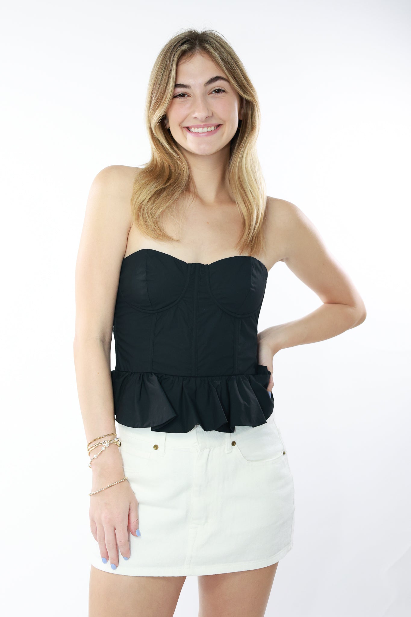 The Bella Bustier Top offers stylish support with a corset design, ruffle hem, back zipper, and 4 color options. Perfect for enhancing your figure and adding a touch of elegance to any outfit.