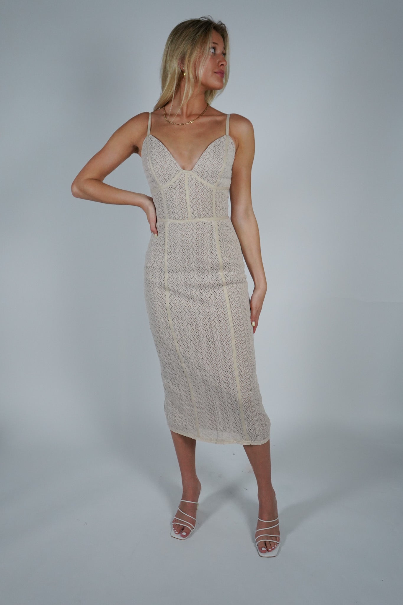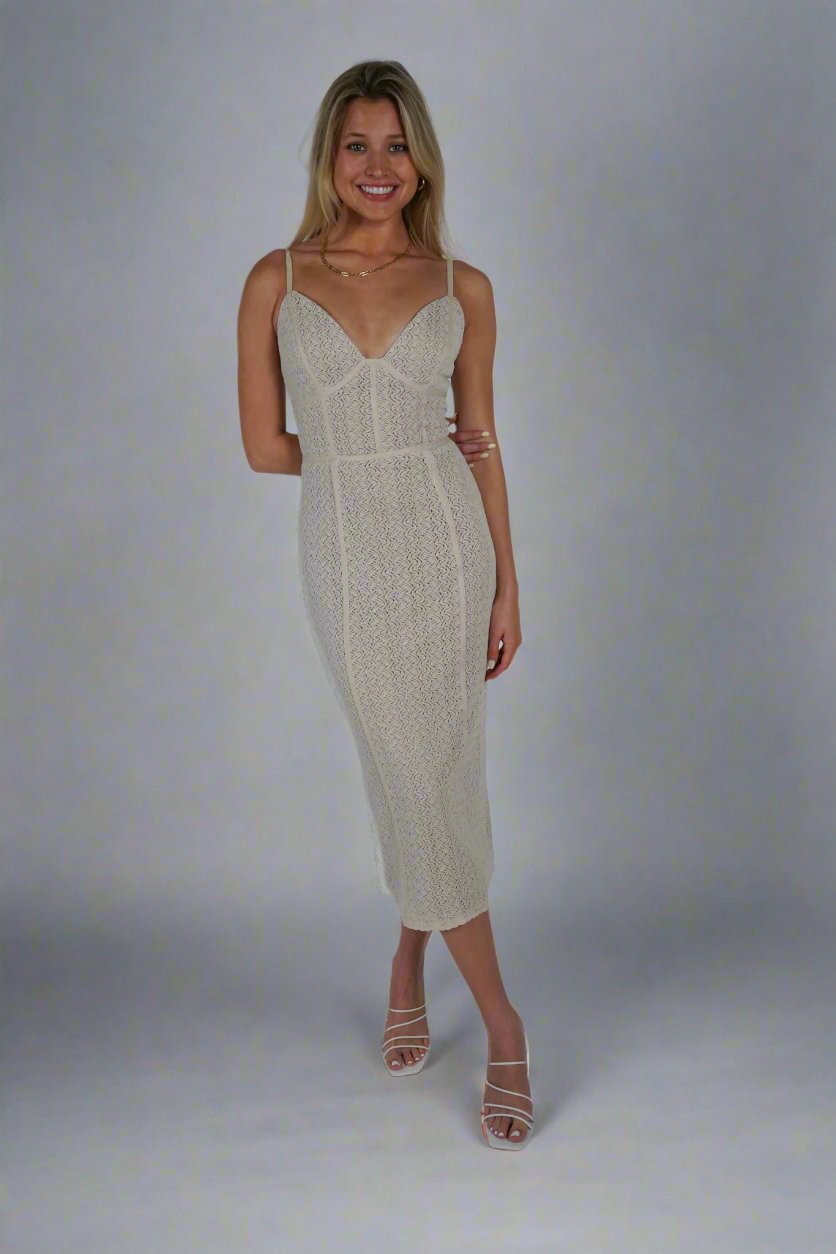 Expertly crafted with delicate lace and a midi length, the Bella Cocktail Dress exudes elegant femininity. The nude lining adds a touch of allure while providing coverage. Perfect for special occasions, this dress is a must-have for a sophisticated and stylish wardrobe.