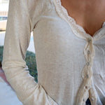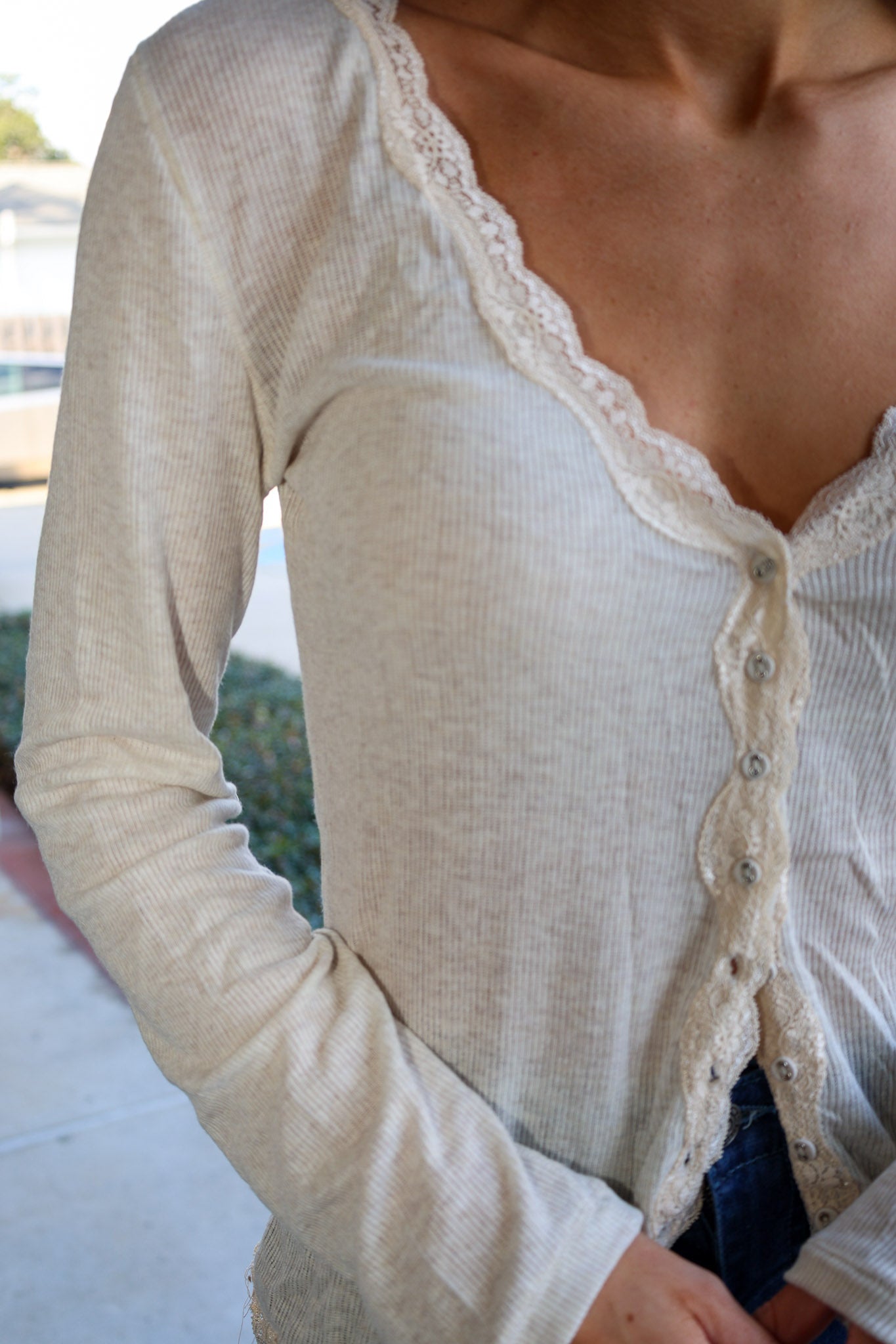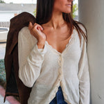 Layer up in this cozy ribbed cardigan that's giving all the right vibes. The soft fabric feels amazing against your skin, while the V-neckline and delicate lace trim add a touch of feminine charm. Button it up over your favorite tee or dress it down as a standalone piece—either way, you're serving looks. Perfect for those days when you want comfort without sacrificing style.