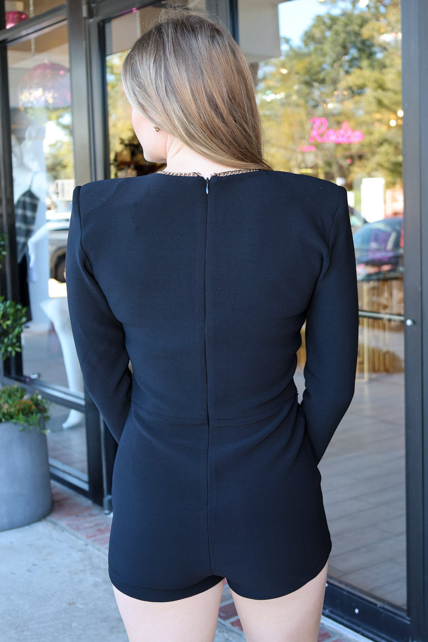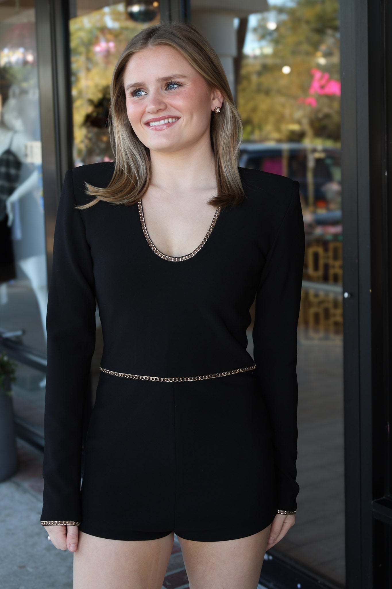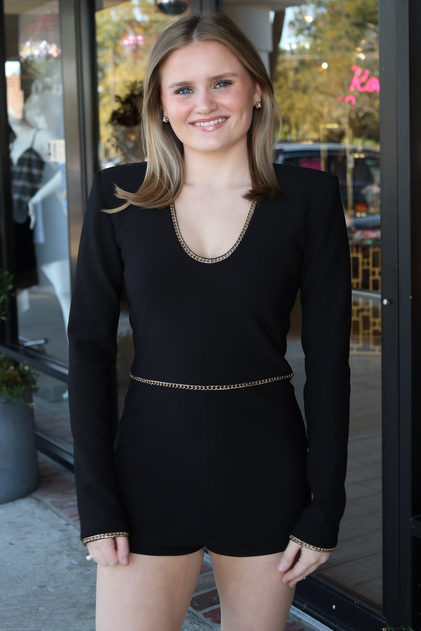 Elevate your wardrobe with our Boheme Romper. Made with luxury fabric and adorned with gold chain trim, this v-neck micro romper features long sleeves for a chic and stylish look. Perfect for any occasion, this black romper is a must-have for any fashion-forward individual.