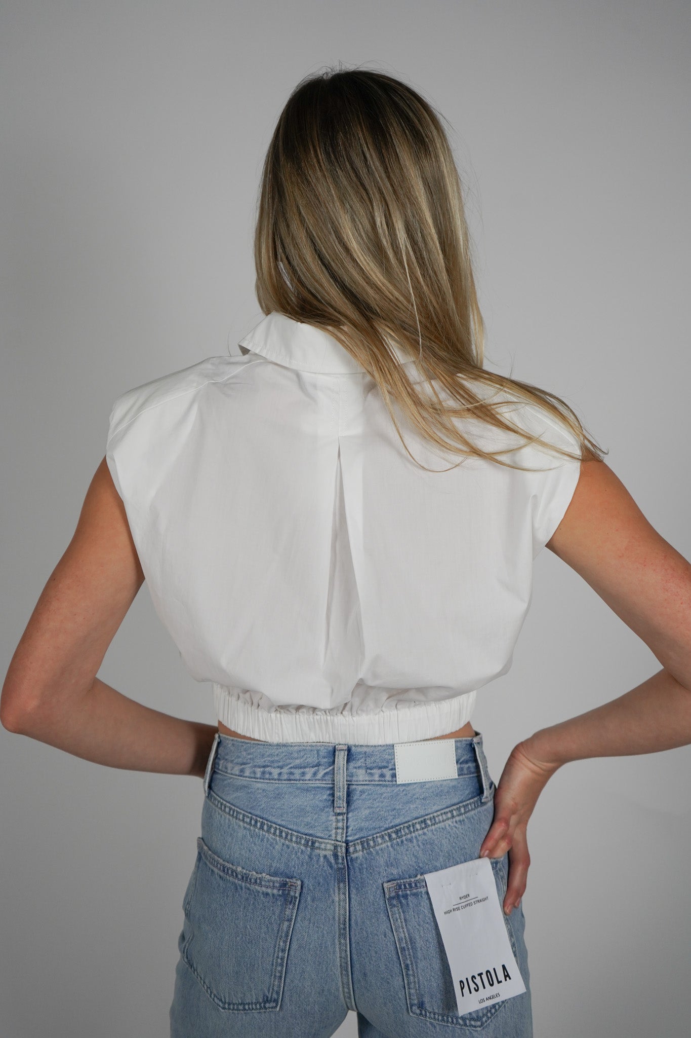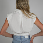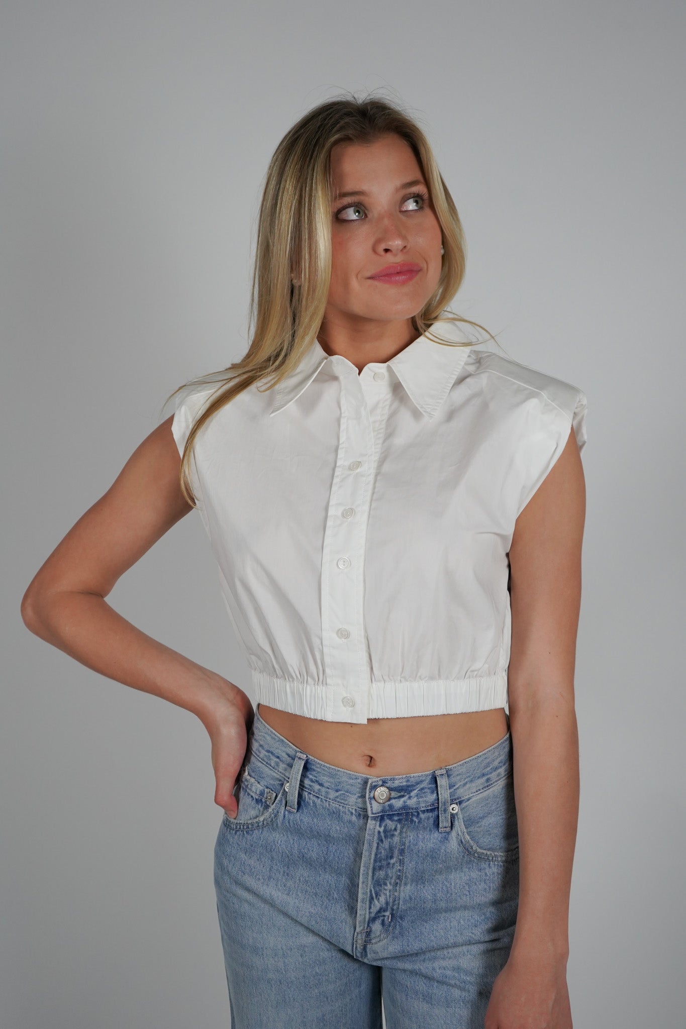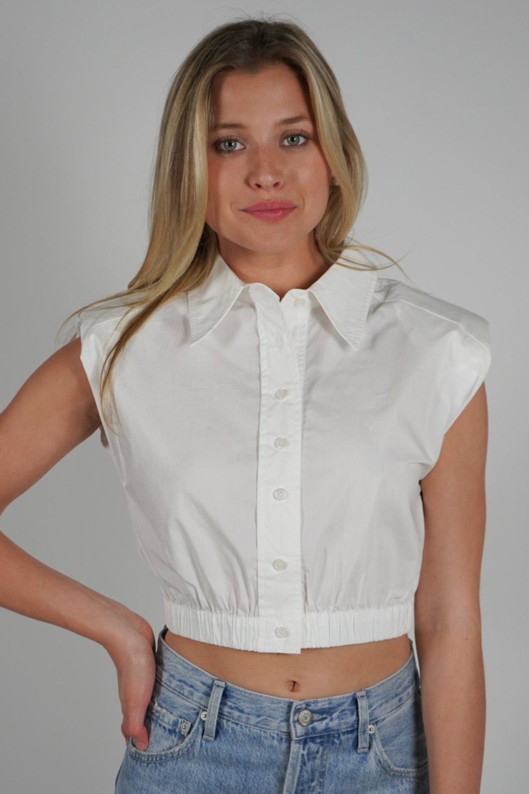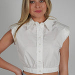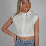Elevate your wardrobe with the Bysen Padded Top. This cropped button down features padded shoulders for a fashionable touch and an elastic bottom for comfortable wear. Perfect for any occasion, this top will be a staple in your closet.