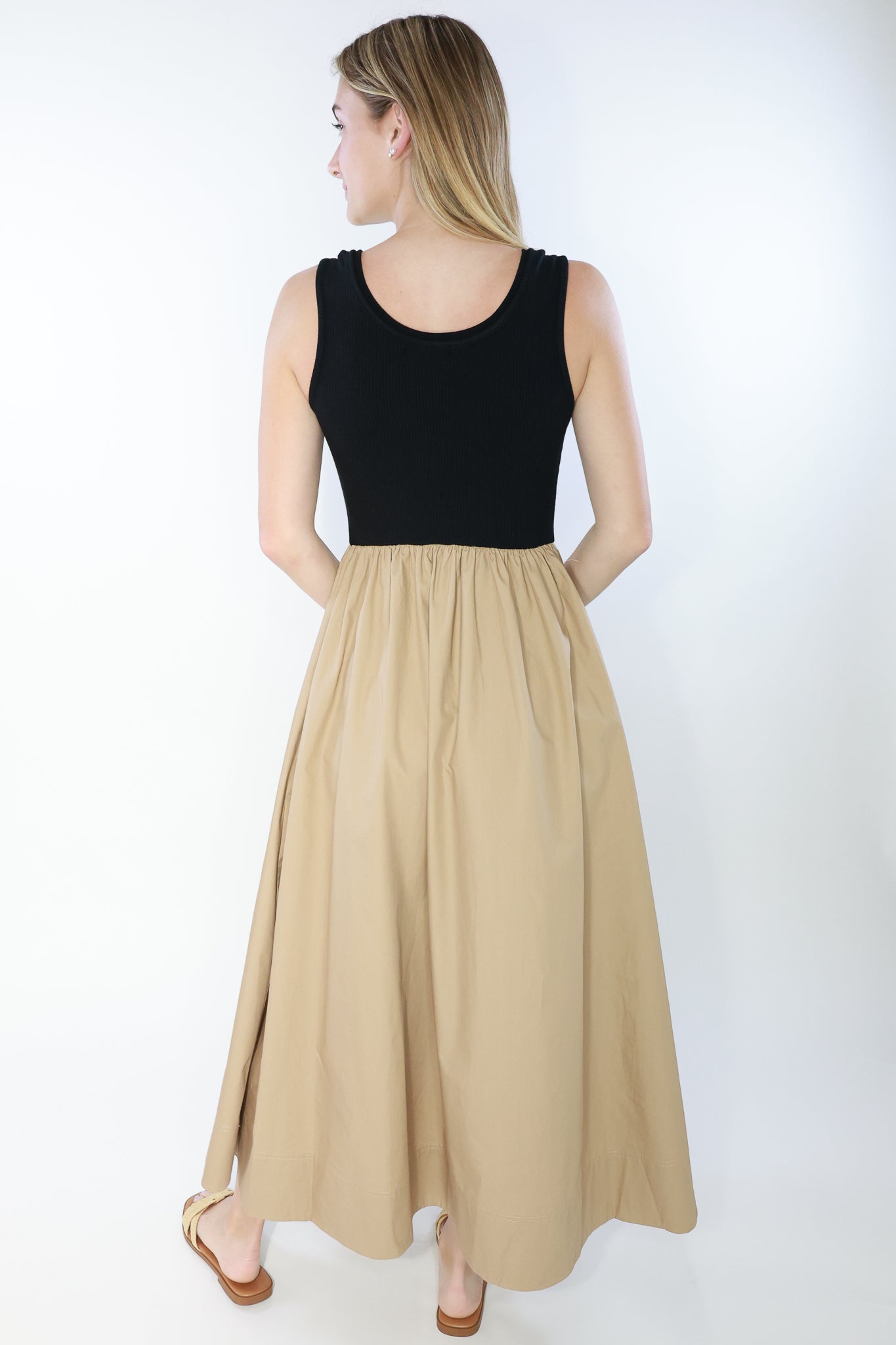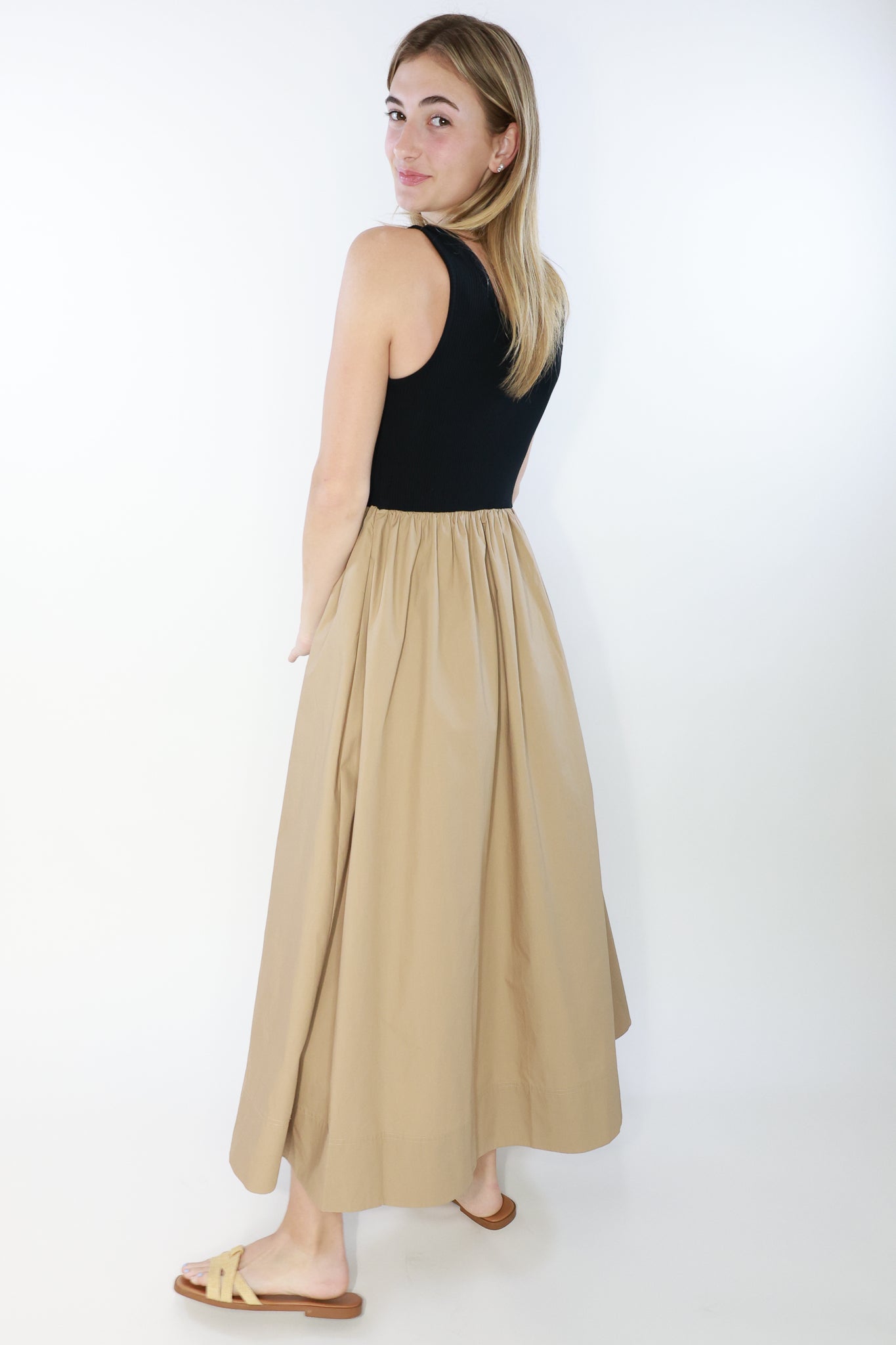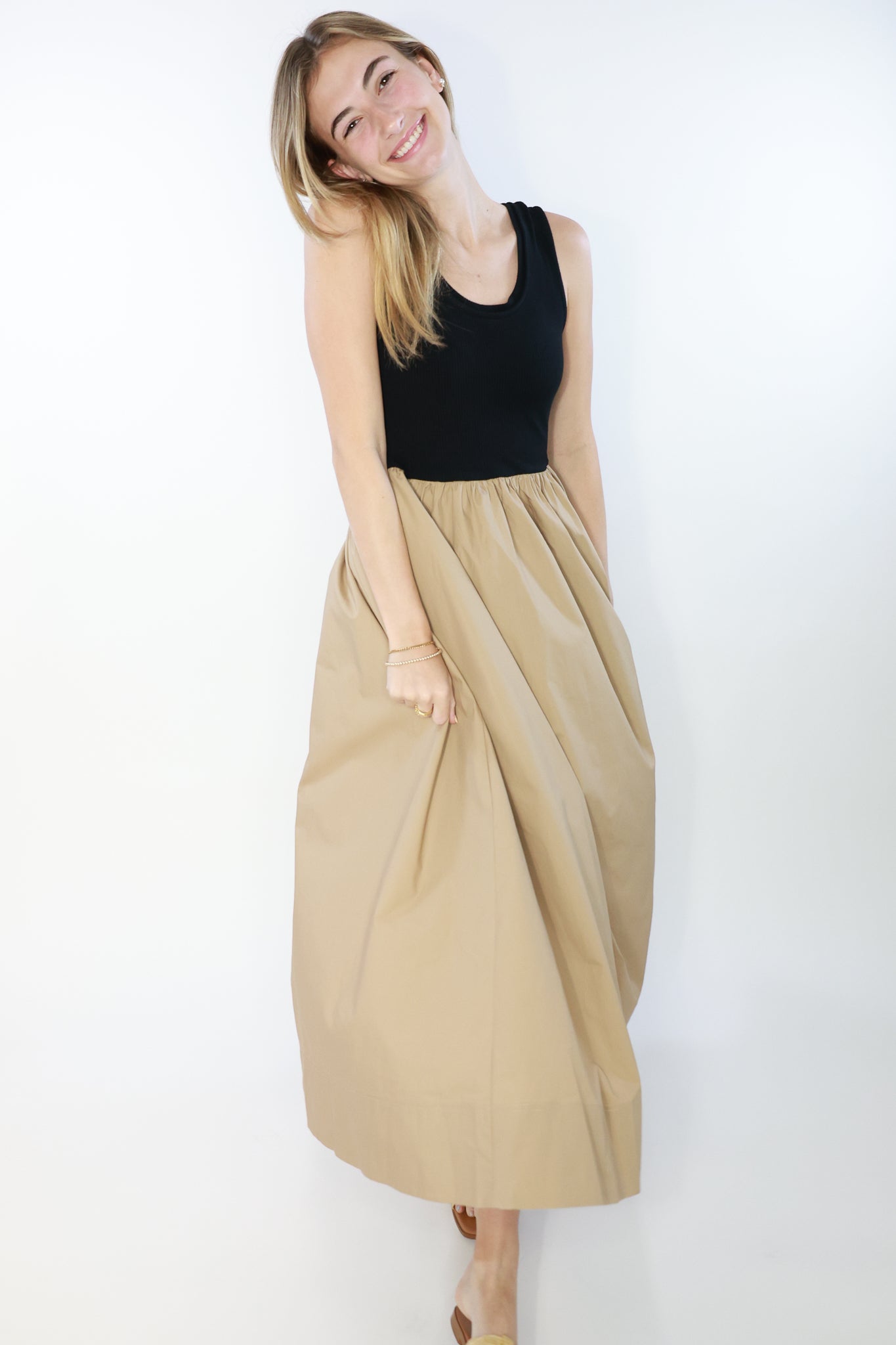 Introducing the Camilla Dress, a versatile piece that seamlessly blends style and functionality. Crafted with a mixed media design and ribbed tank top, this midi dress features an elegant A-line skirt with pockets. Perfect for any occasion, stay comfortable and fashionable all day long.