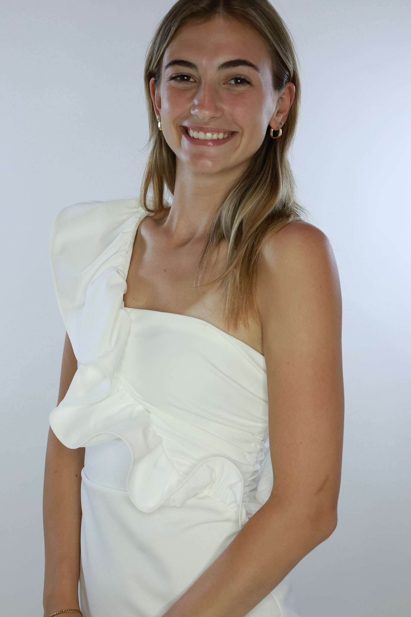 Get ready to ruffle some feathers with the Camilla Dress. This mini dress features a playful, asymmetrical ruffle shoulder design that is sure to catch some attention. Perfect for a fun night out or a special event, this dress is both stylish and unique!