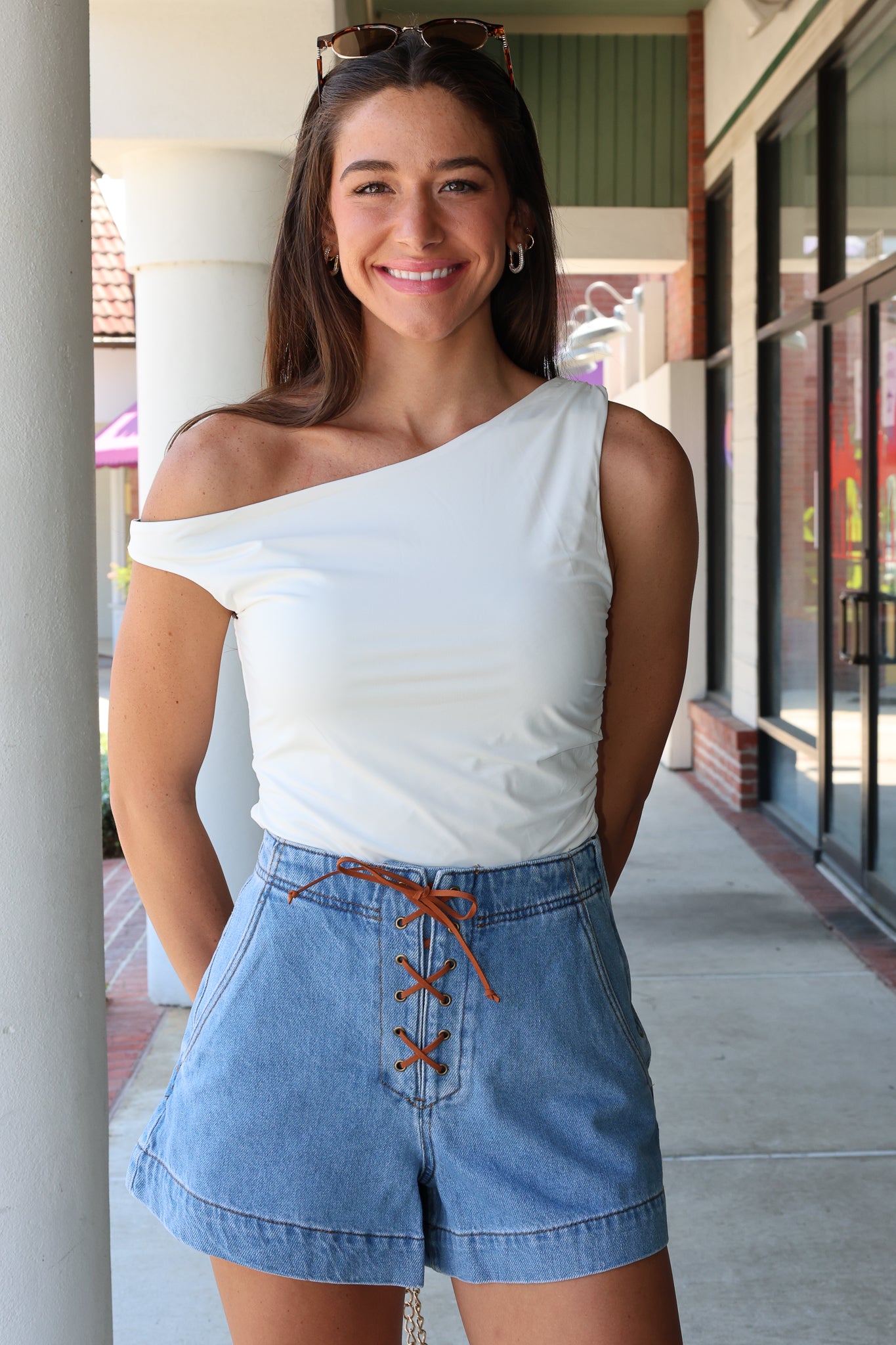The Candace Shorts are all about cool summer style with a denim look and a trendy lace-up fly. Perfect for hanging out, they give you a fresh, edgy vibe while keeping things comfy and easy to wear. Side zipper.