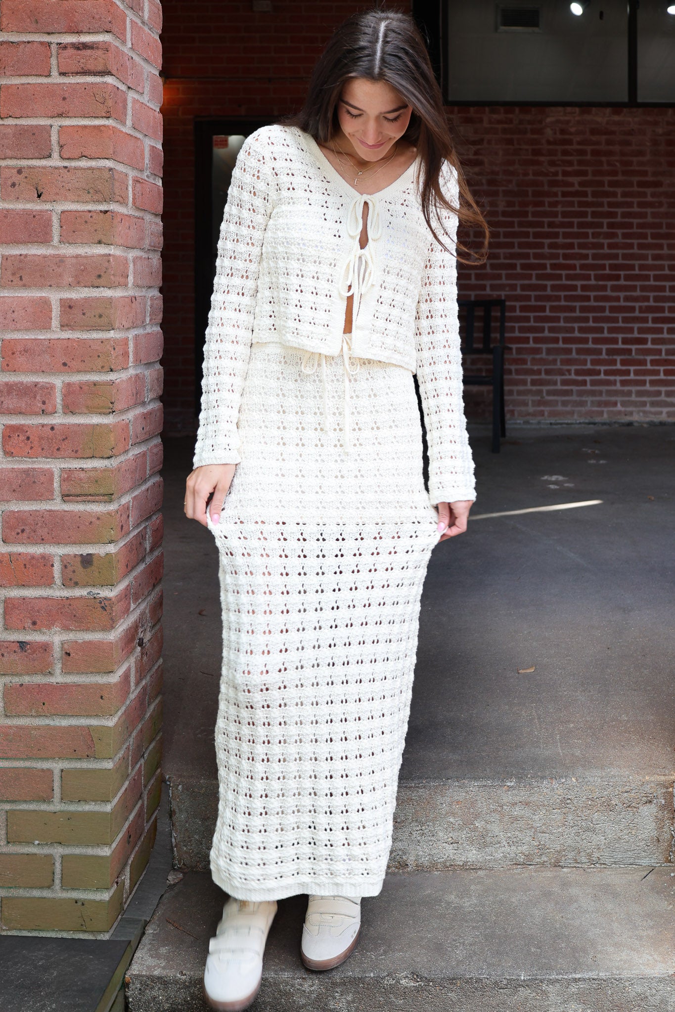 The Carley Set combines a crochet long sleeve top with adjustable front ties and a flowing midi skirt that's partially lined for comfort and coverage. This coordinated two-piece delivers effortless bohemian style perfect for layering or wearing as a complete look.