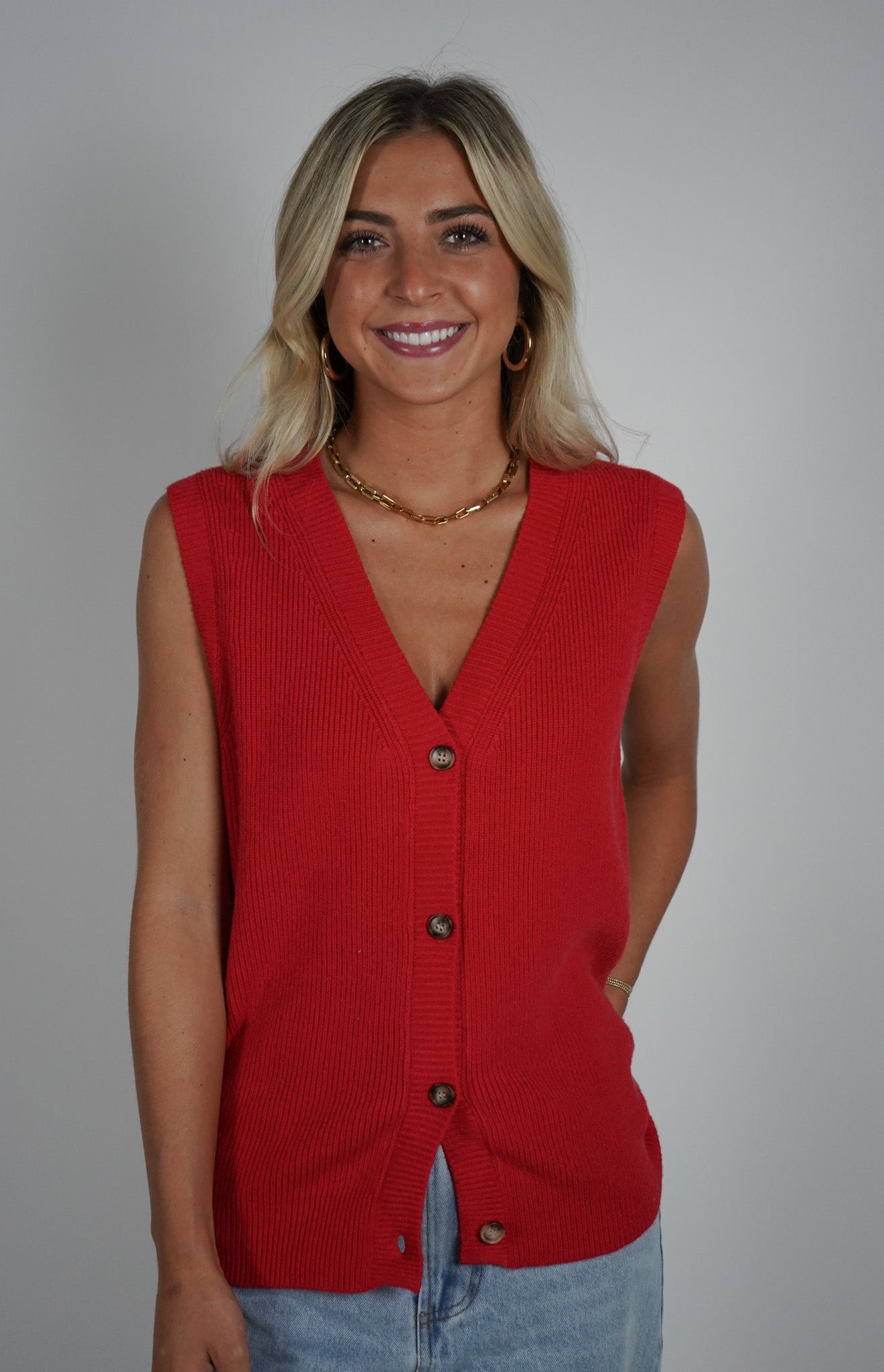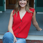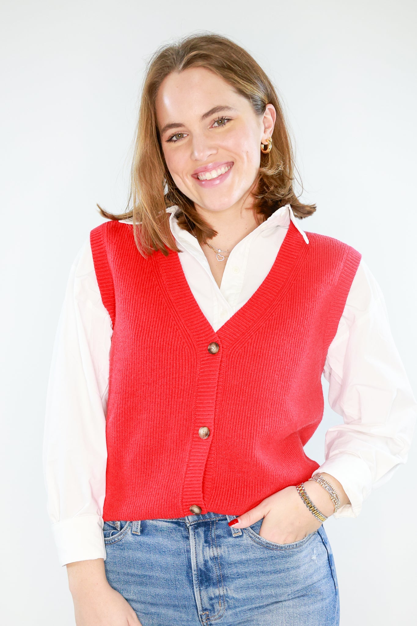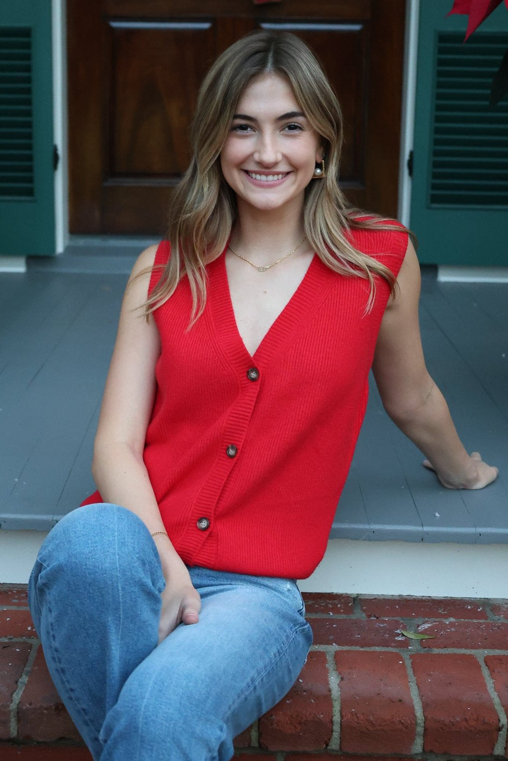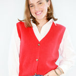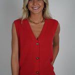 The Carson Cardigan: a sweater vest that adds a pop of color to any outfit. Stay warm and stylish with this playful red piece.