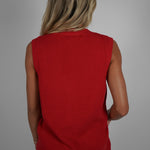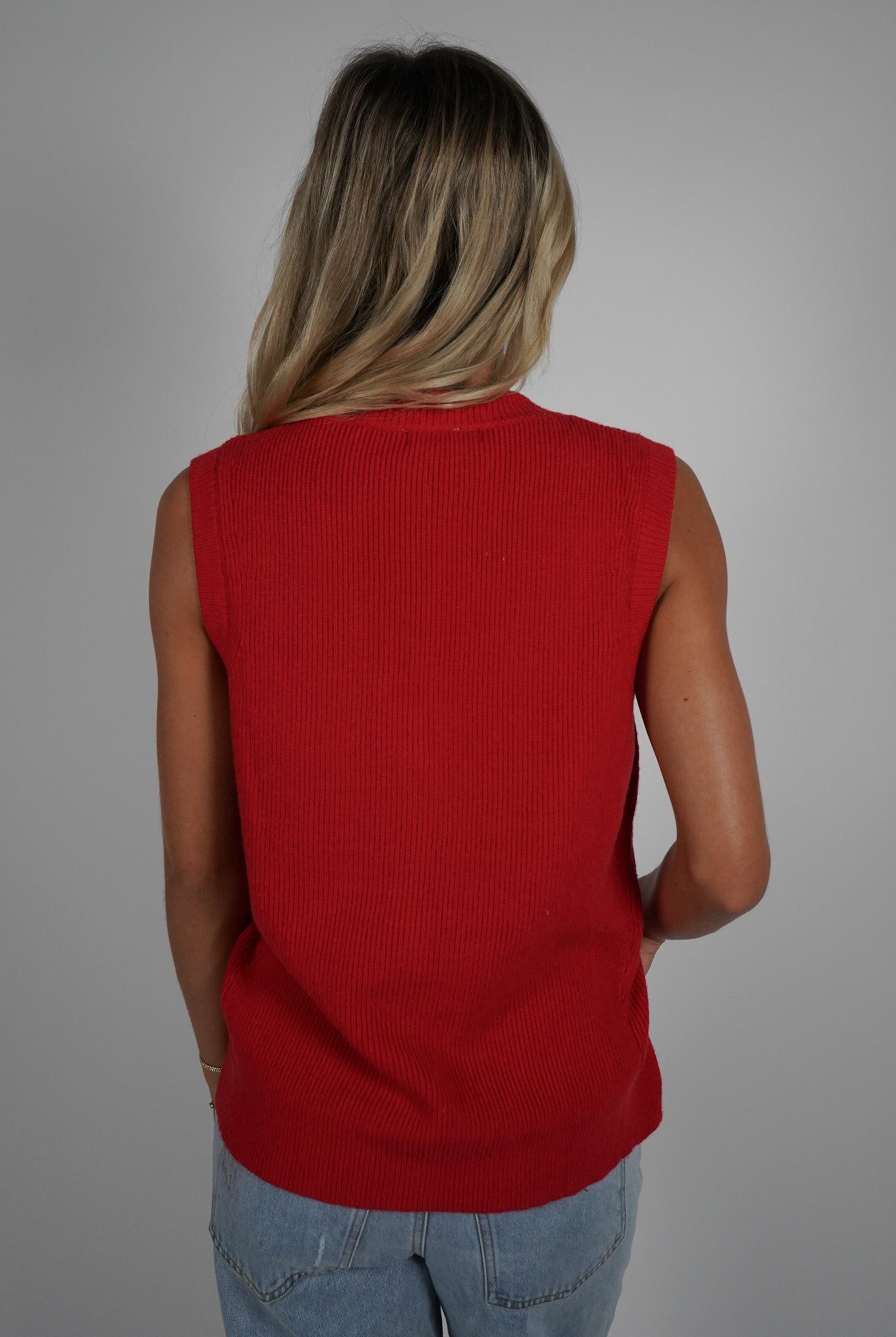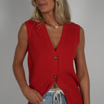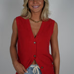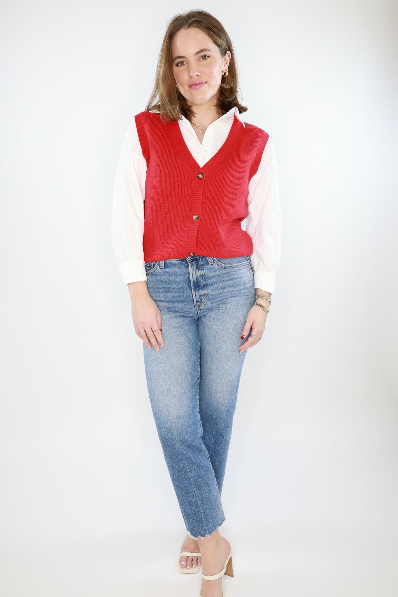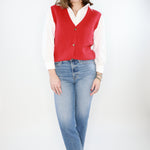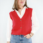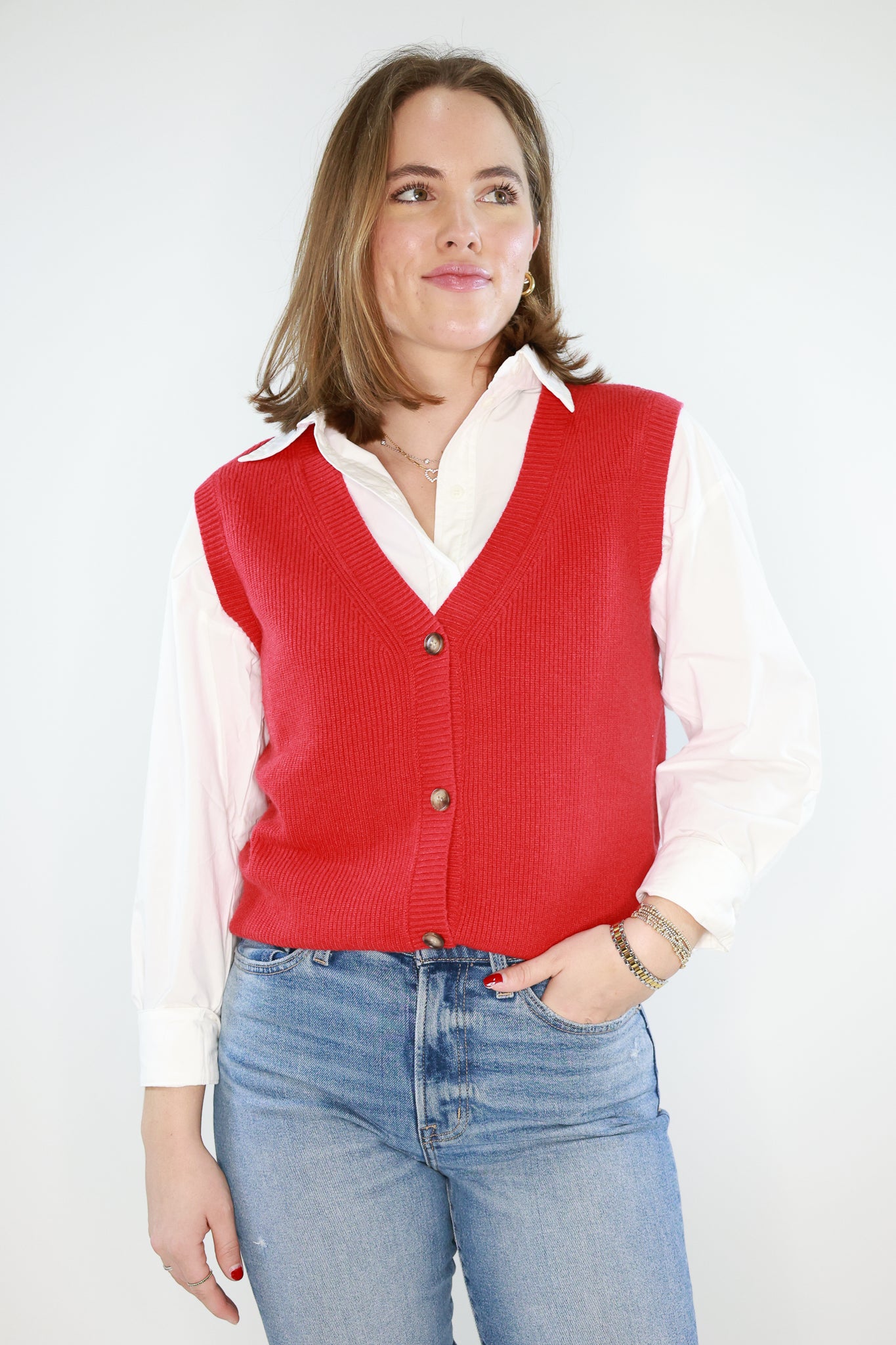 The Carson Cardigan: a sweater vest that adds a pop of color to any outfit. Stay warm and stylish with this playful red piece.