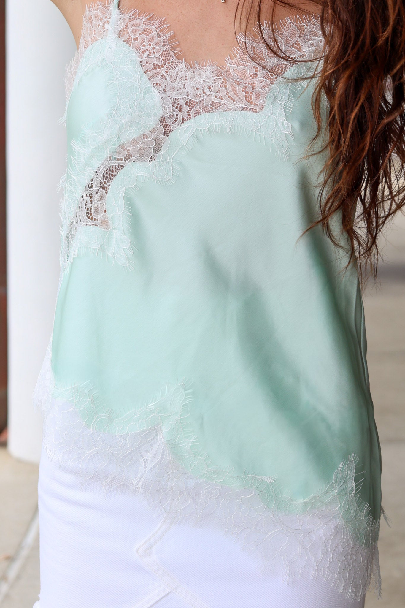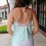 Elevate your wardrobe with the Cassie Top, a sophisticated satin cami in soft mint green. The asymmetric hem creates an effortlessly chic silhouette, while delicate lace trim add feminine elegance. Perfect for layering or wearing solo, this versatile piece transitions seamlessly from day to evening.