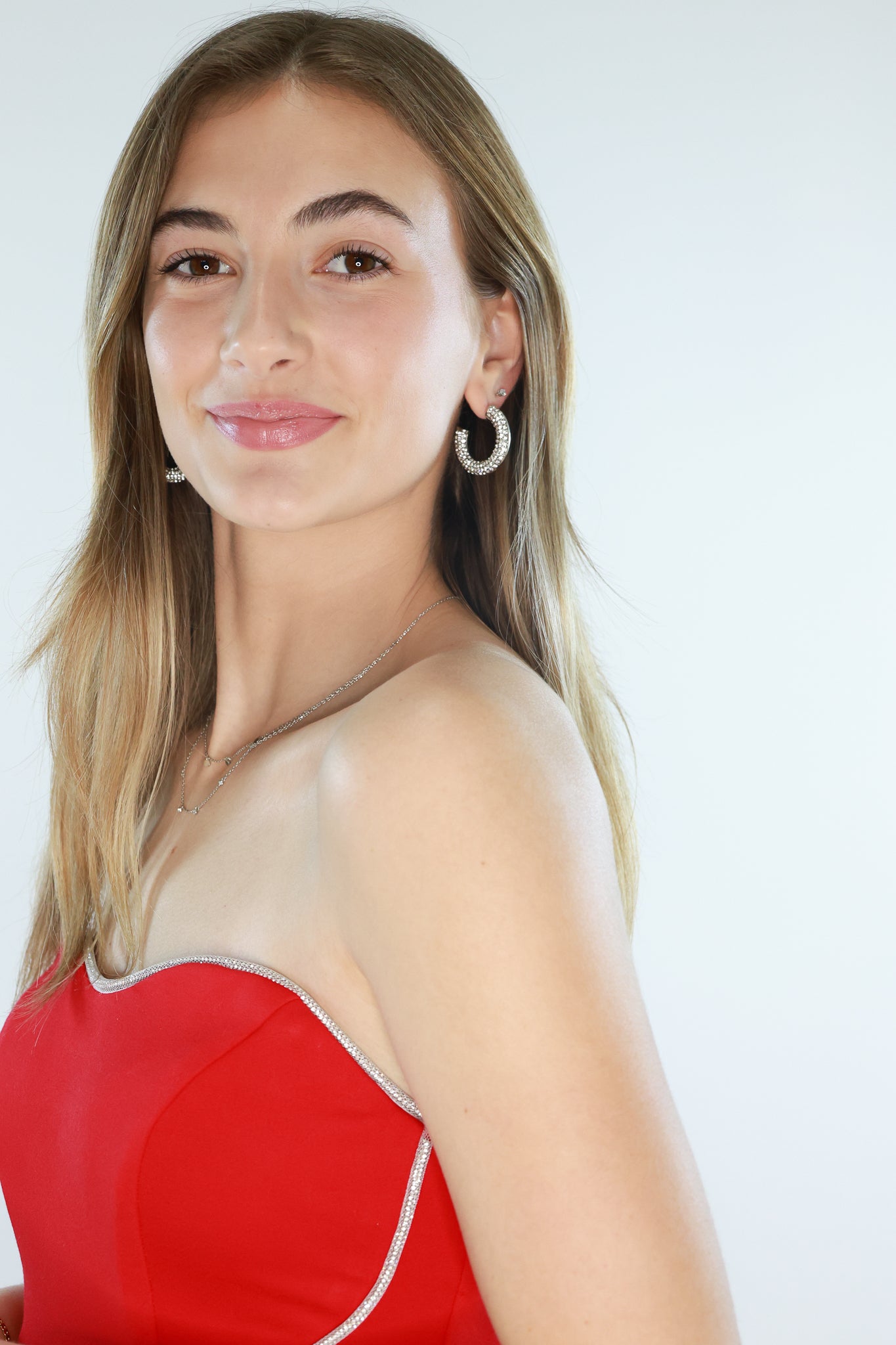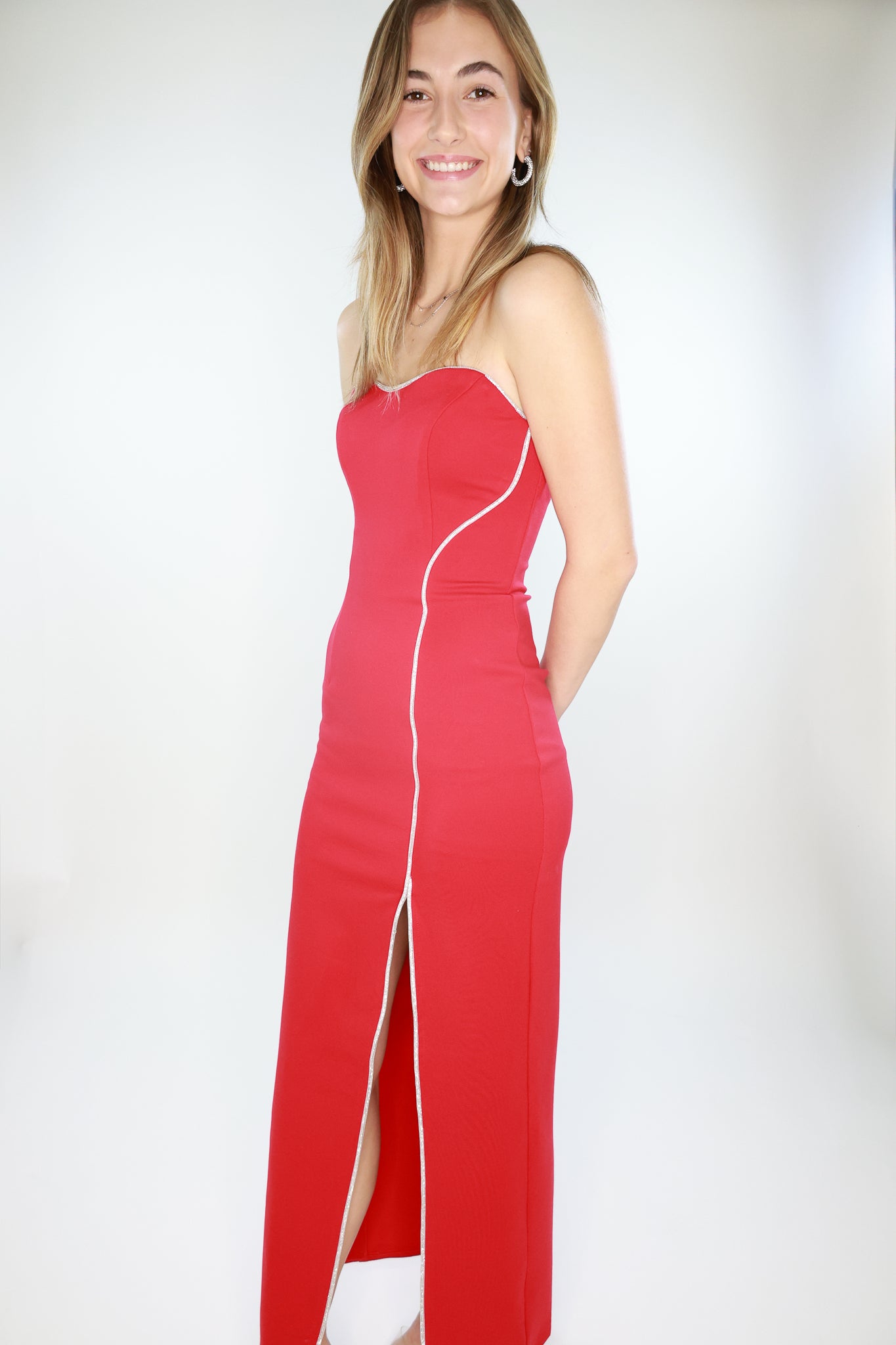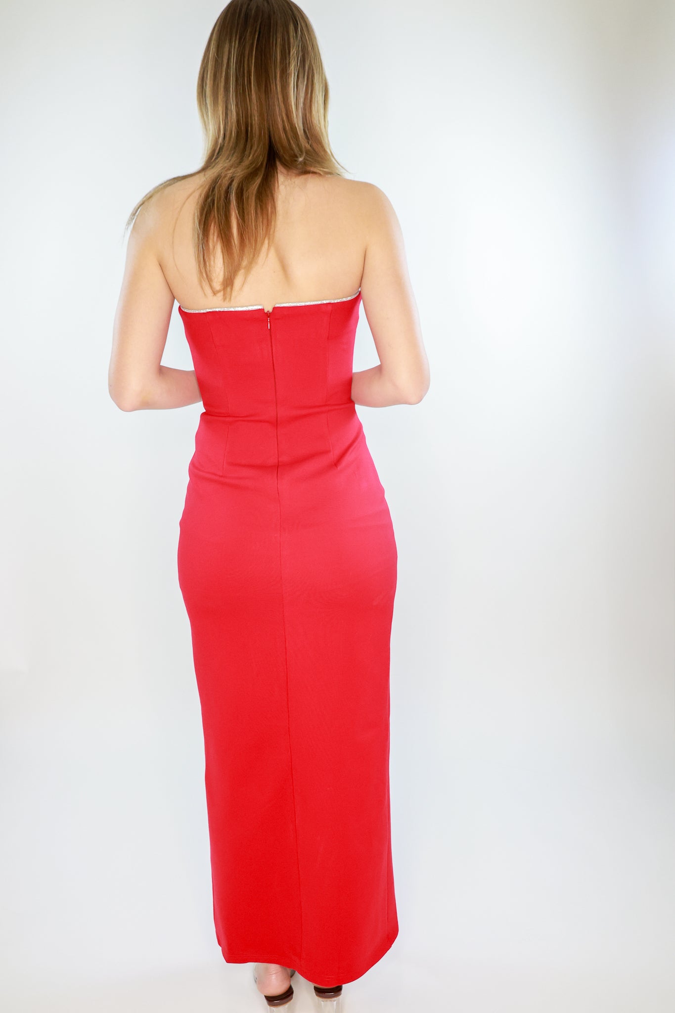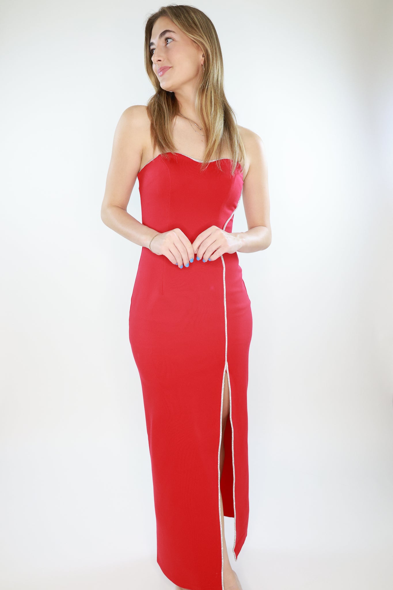 Expertly designed to make a statement, the Cherie Midi Dress is a stunning addition to any wardrobe. Its strapless design and vibrant red color will turn heads, while the rhinestone trim adds a touch of elegance. The left front slit adds a subtle hint of allure. Perfect for any occasion.