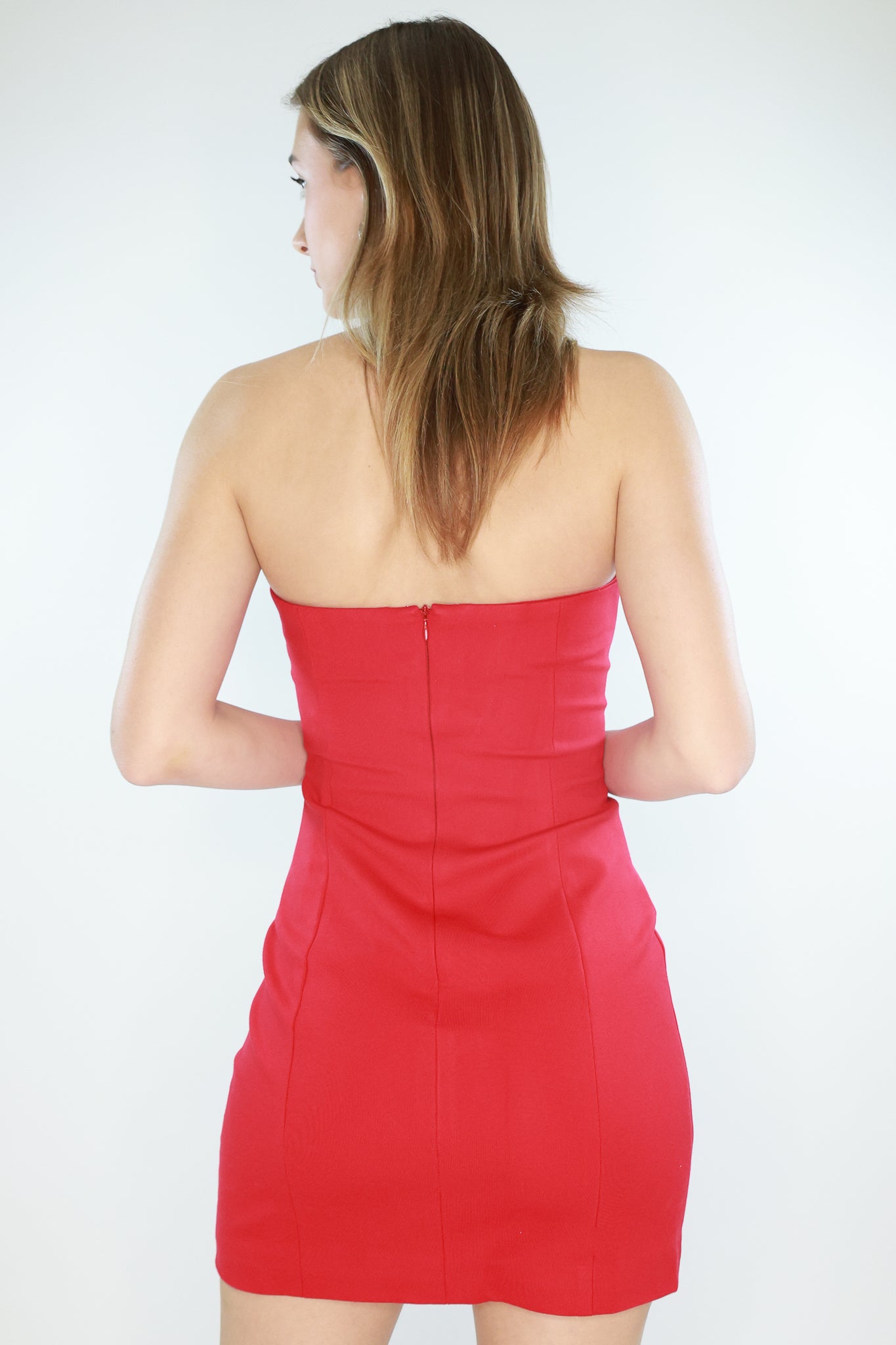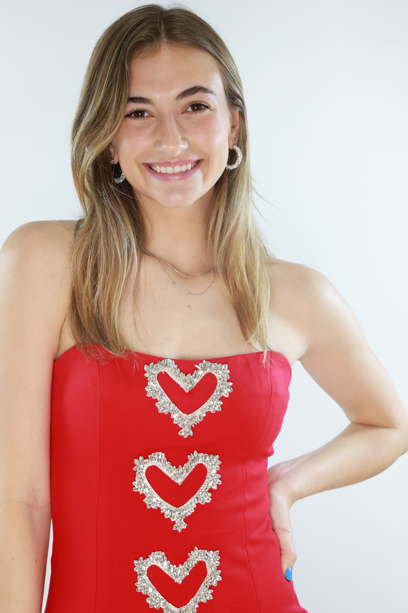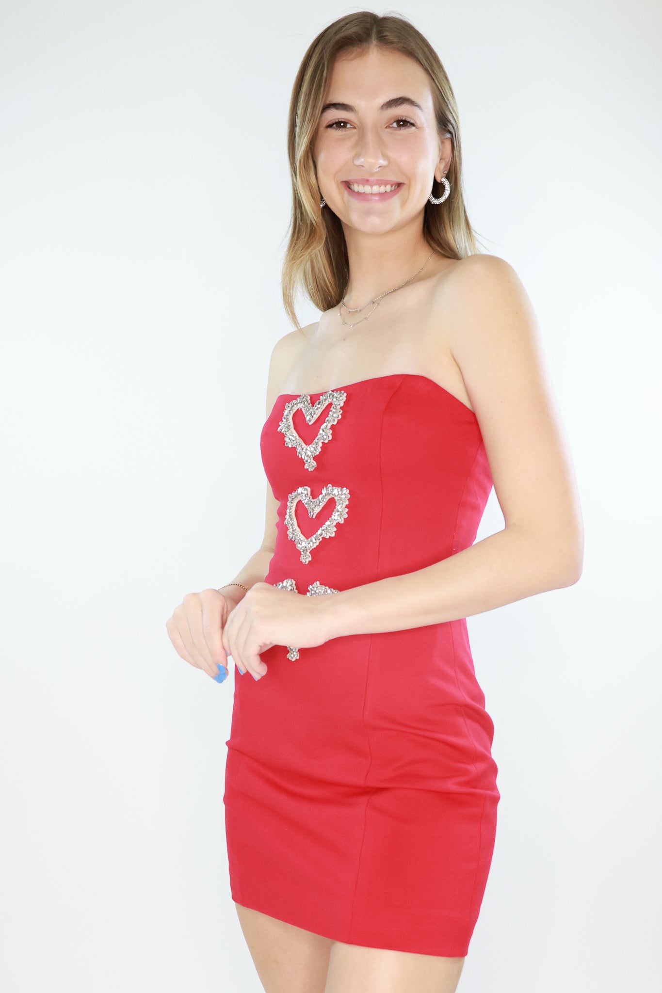 Fall in love with the Cherie Party Dress. This stunning strapless red mini dress features three dazzling rhinestone heart accents, adding a touch of glamour to any occasion. Made with high-quality materials for a comfortable and stylish fit. Perfect for dancing the night away.