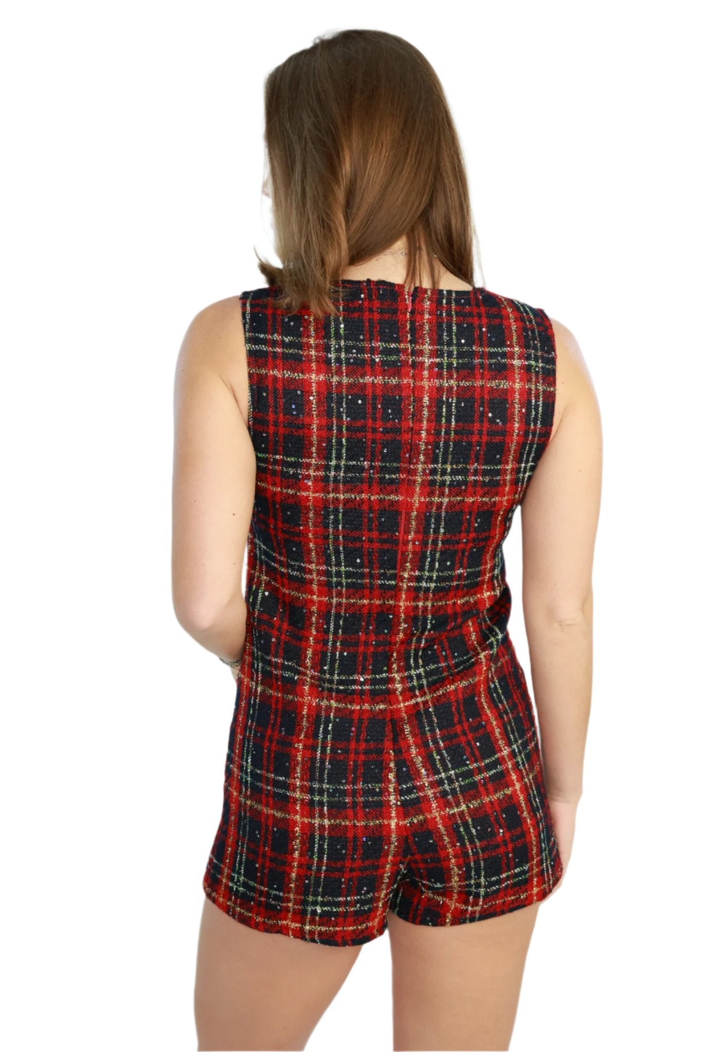 The Christine Plaid Romper features a festive holiday plaid design and gold buttons on the pockets for a touch of elegance. Perfect for any holiday occasion, add a touch of style and sophistication to your wardrobe.
