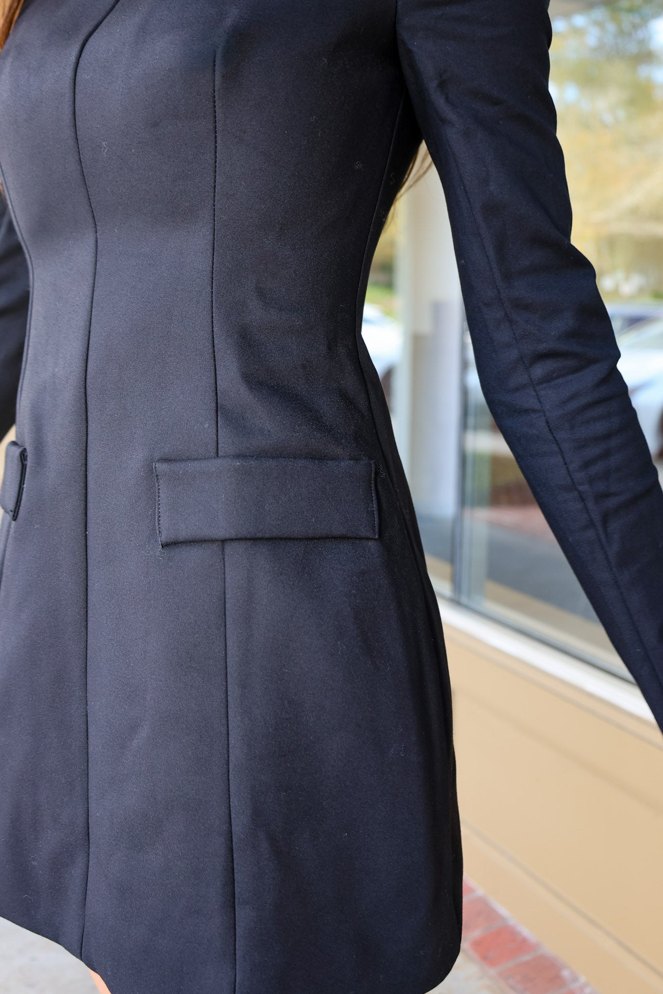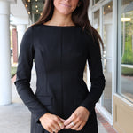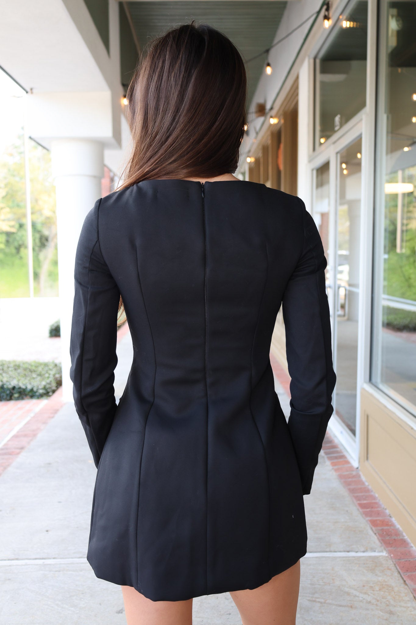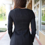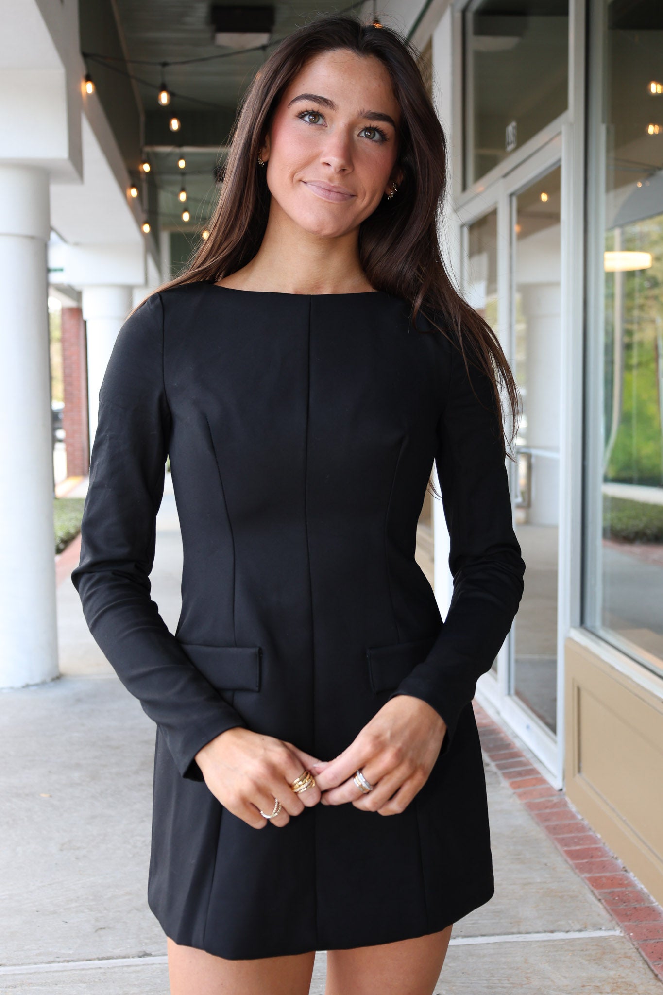 The Coco Dress brings vintage charm to your everyday rotation. This long-sleeve mini features a rounded skirt silhouette with front pocket flaps that add character. The back zipper makes it easy to slip on and off, while the classic design keeps it timeless. This little black dress delivers that effortless glam look. Fully lined.