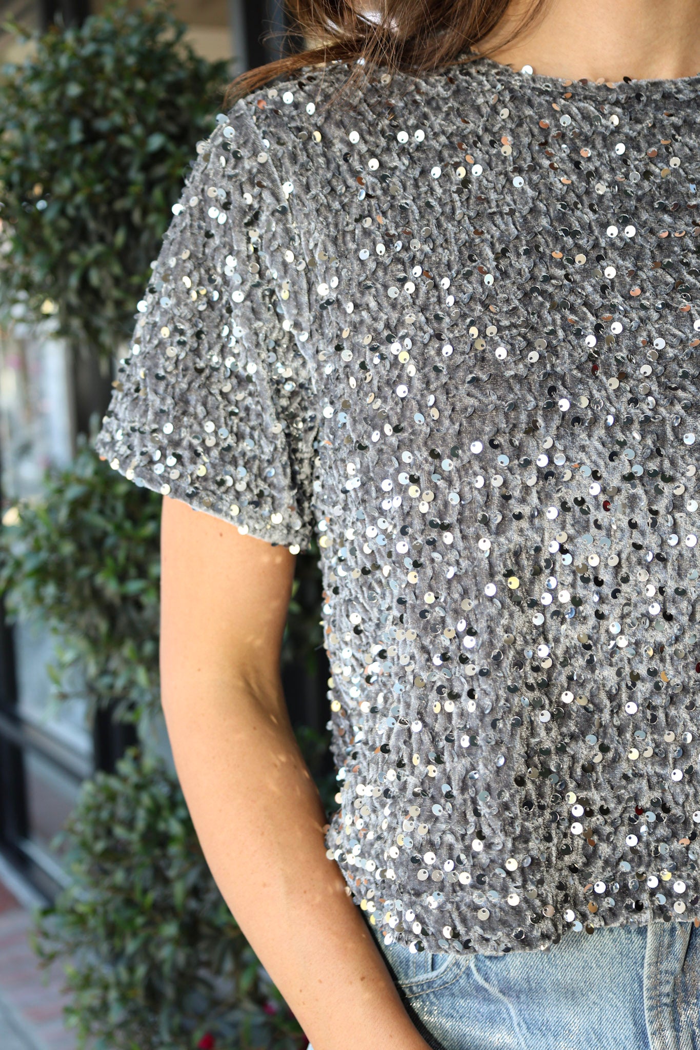 Introducing the Cressa Top by Steve Madden, a stylish and sophisticated addition to your wardrobe. Made with luxurious gray velvet and adorned with silver sequins, this short sleeve top exudes elegance and glamor. Perfect for any occasion, its combination of materials will make you stand out while still feeling comfortable. Upgrade your style with the Cressa top.