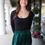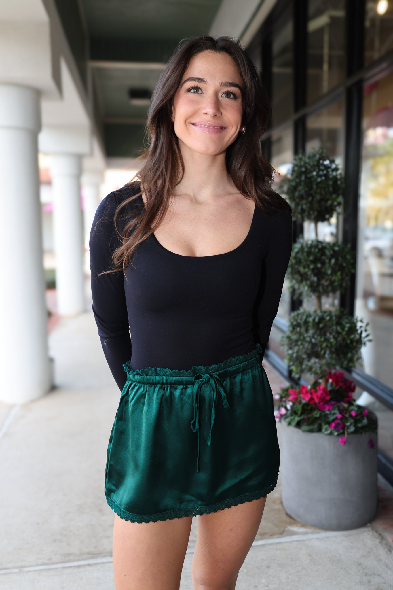 The Crystal Micro Mini in green is the ultimate grab-and-go skirt. Pull it on and you're set—no zipping, no adjusting. Built-in boy shorts keep you covered and comfortable so you can focus on having fun, not fidgeting.
