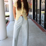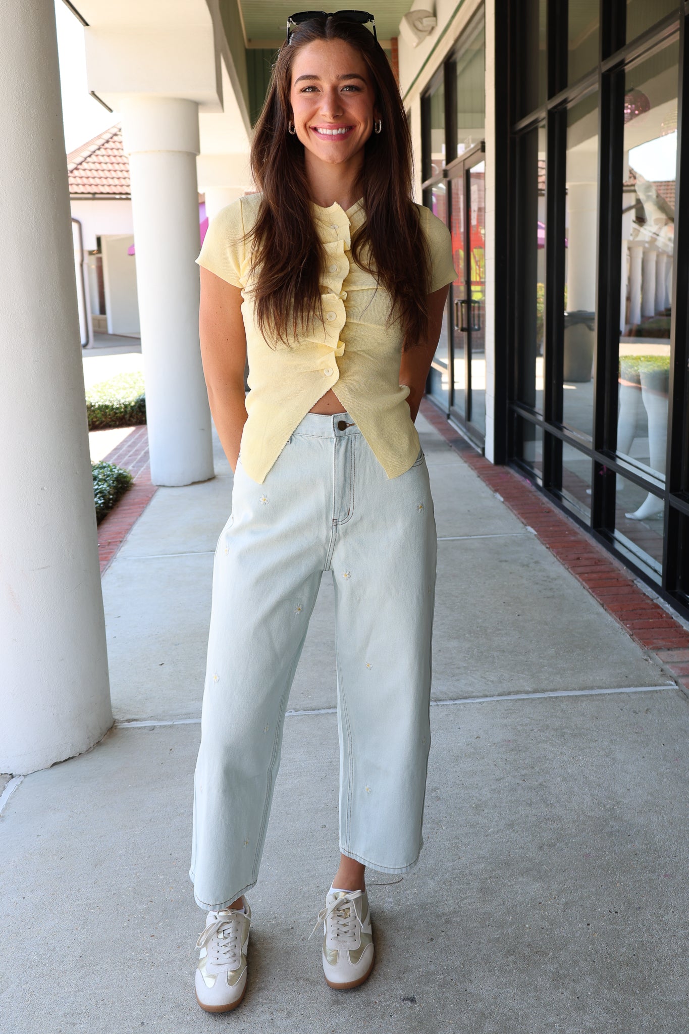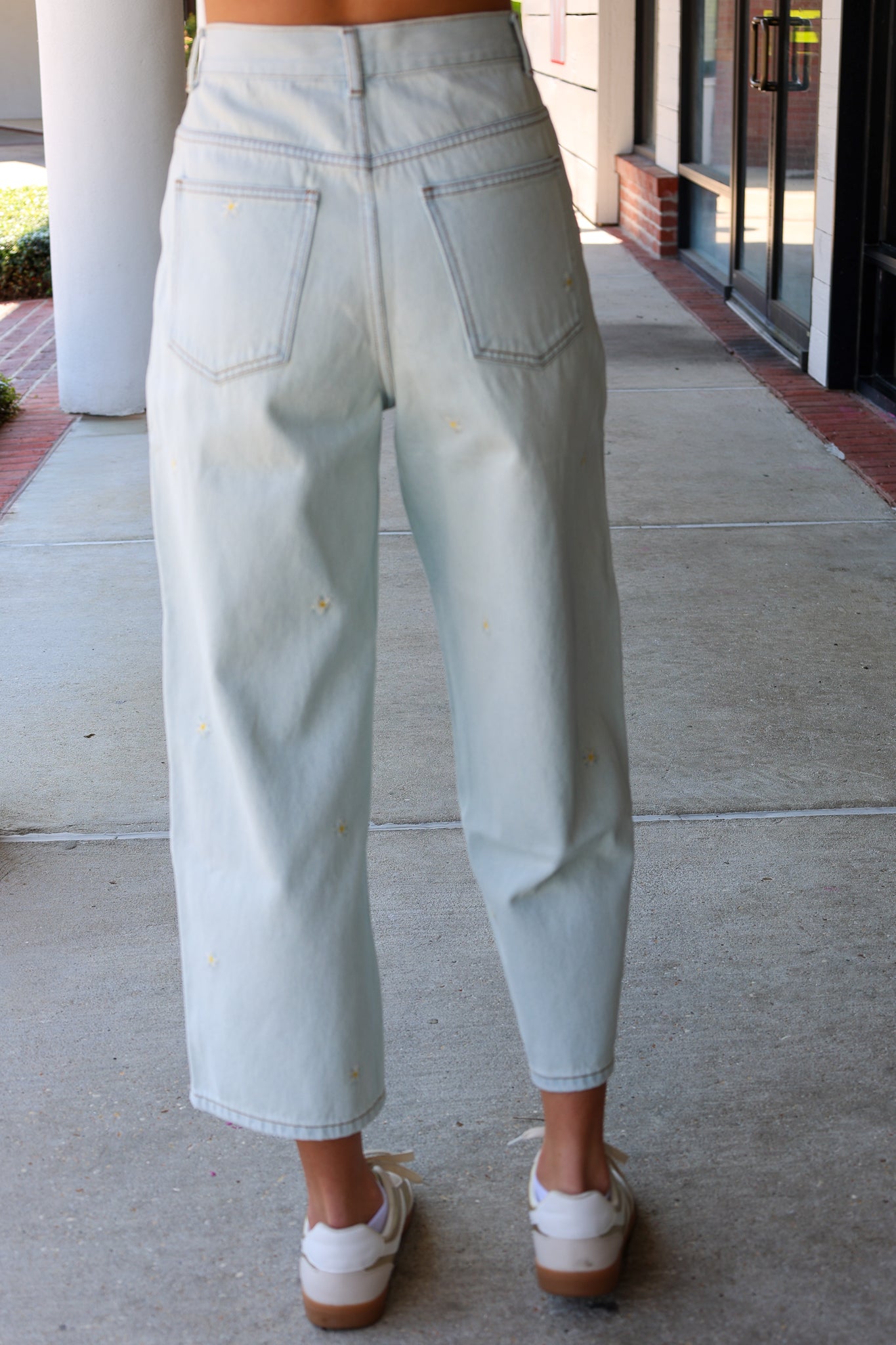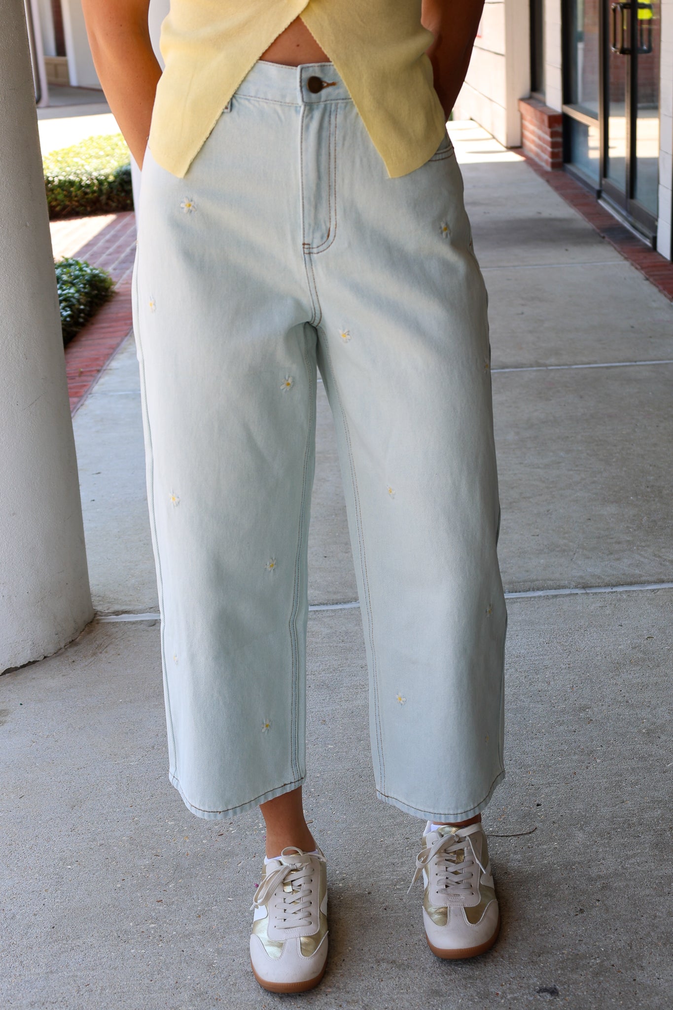 Bring some fresh vibes with the Daisy Jeans, featuring a light wash and cute daisy embroidery accents. These cropped jeans are perfect for showing off your favorite kicks and adding a fun, floral touch to any outfit. They’re comfy and stylish, making them a go-to for chill days or hanging out with friends.