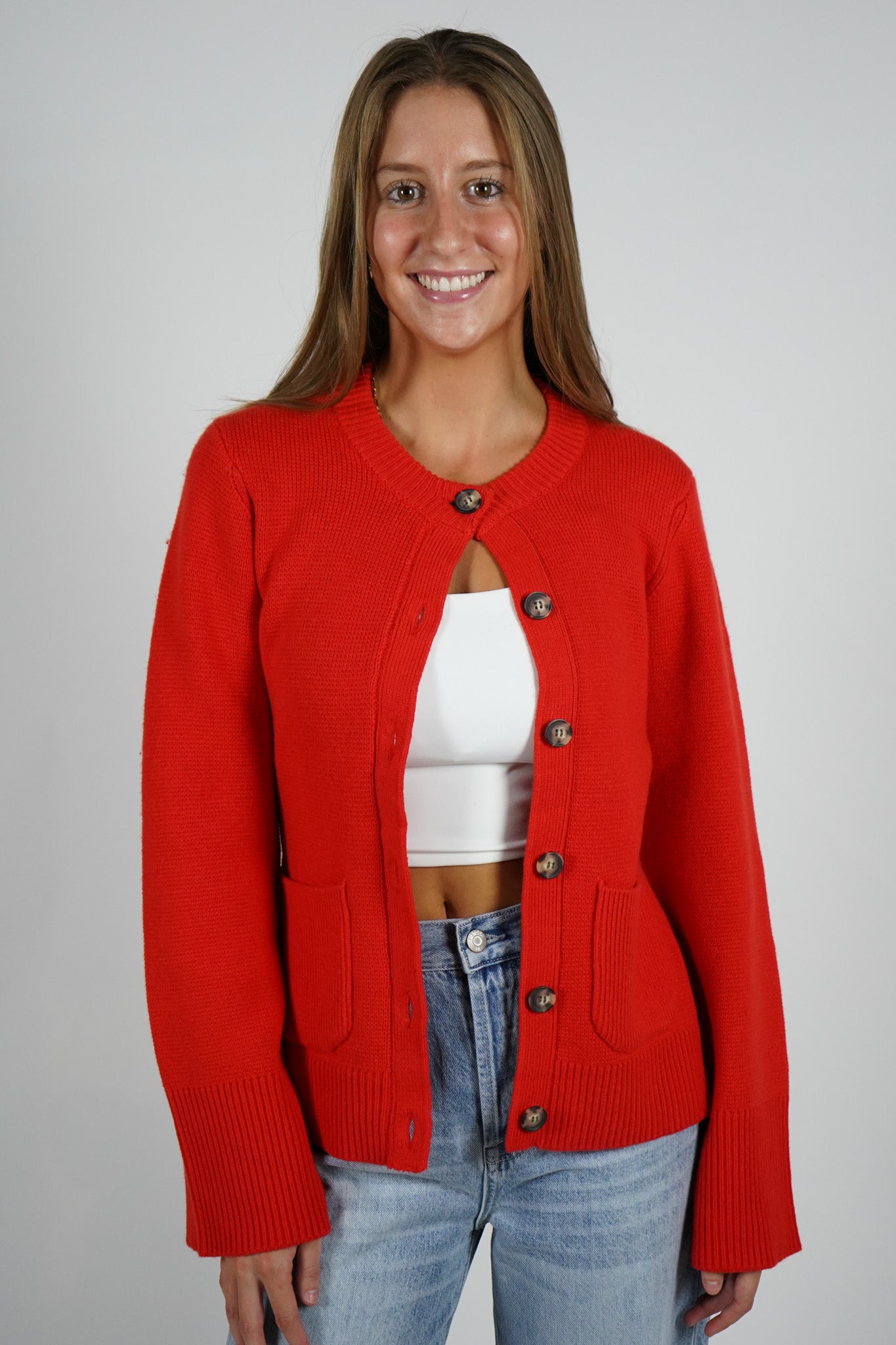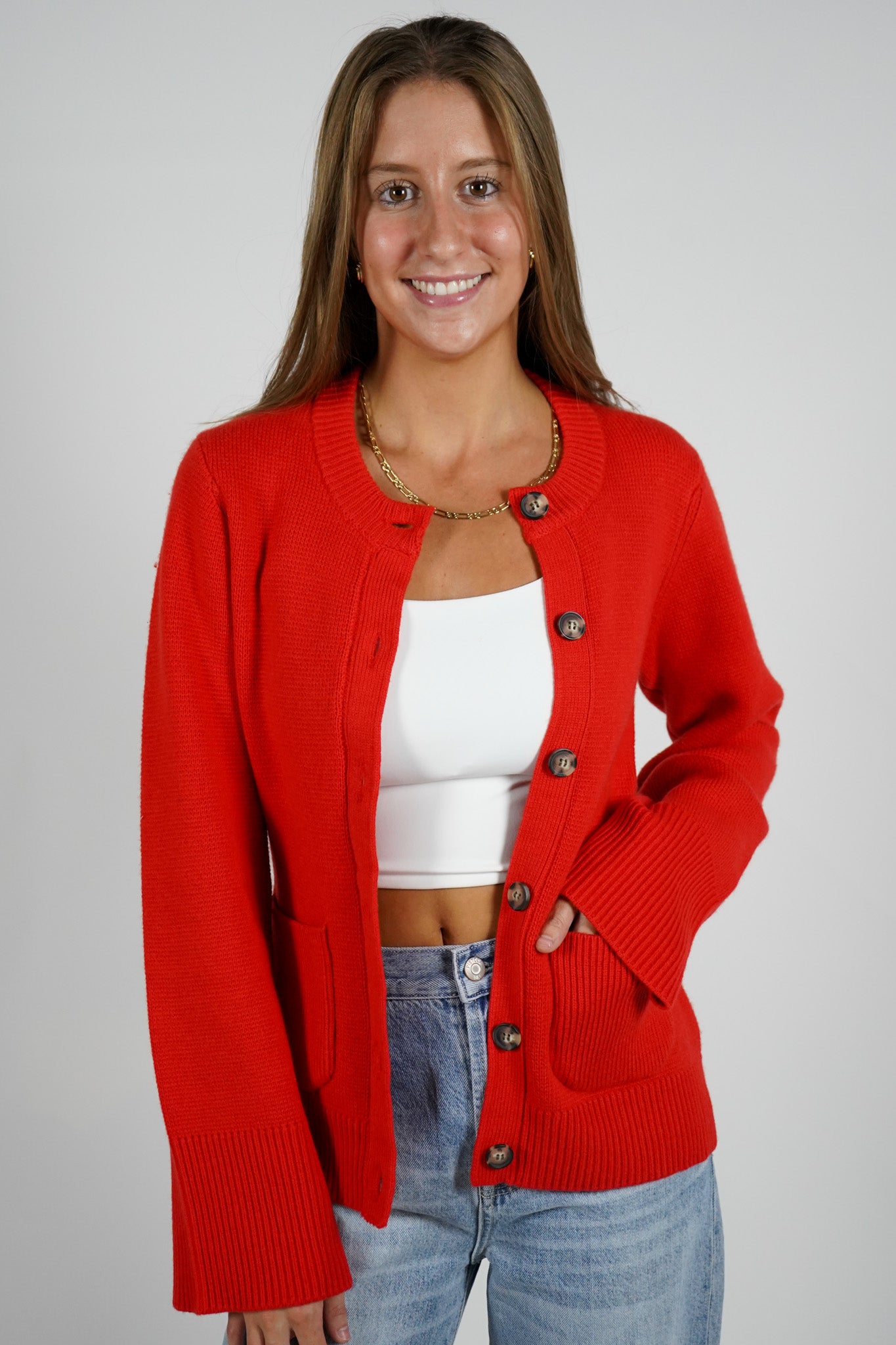 The Dani Cinched Cardigan is expertly designed with long sleeves and front pockets for added functionality. The bold red color adds a touch of style to any outfit. Stay cozy and chic with this versatile addition to your wardrobe.