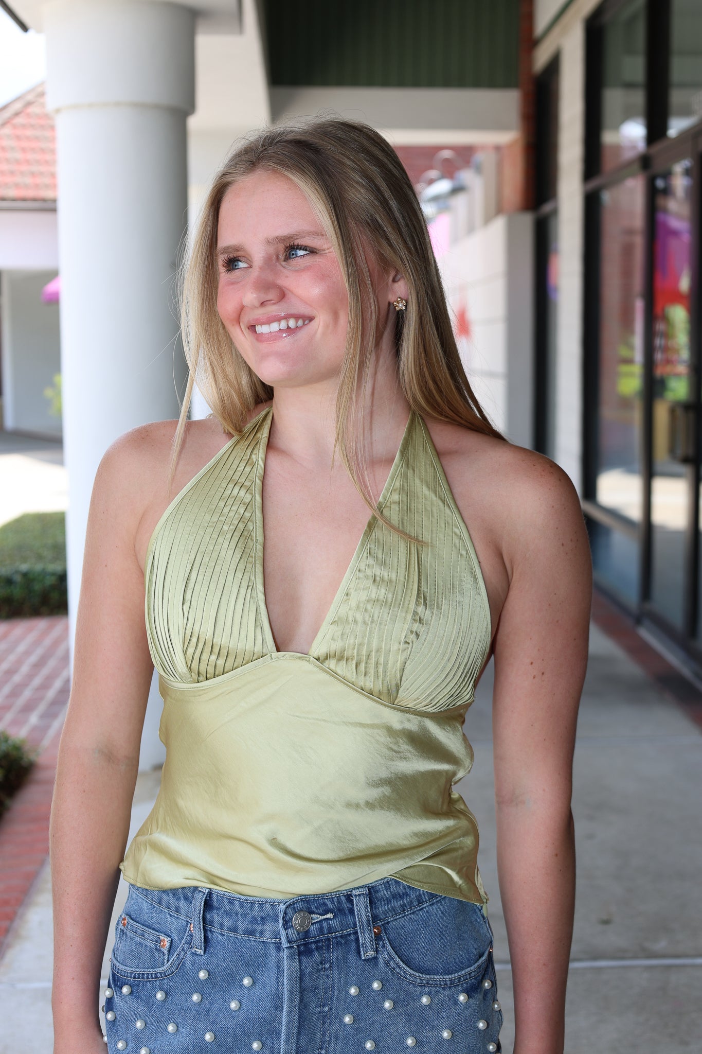 The Devon Top is a super cute satin halter with pleats that add a fun texture. It ties at the neck and waist, giving you a flattering fit that’s perfect for hanging out or going out. Stylish and comfy, it’s a must-have for your summer wardrobe!