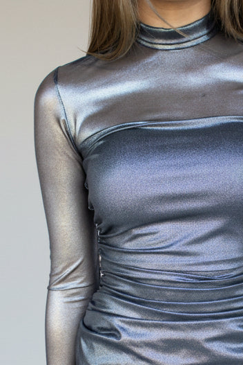 The Dominique Mini Dress is a silver long-sleeve bodycon that’s perfect for making a statement. Its shiny finish and snug fit highlight your curves while keeping you cozy with full sleeves. Ideal for parties or nights out when you want to shine and feel confident!