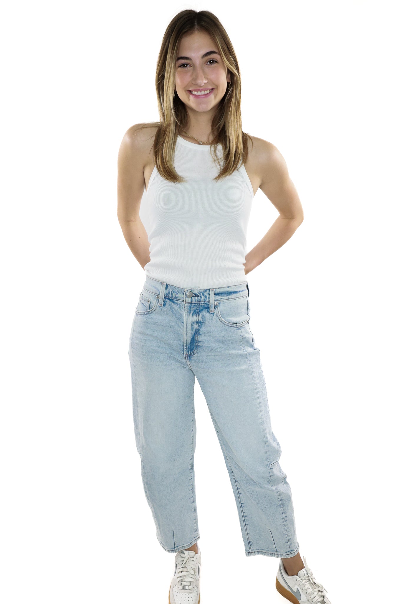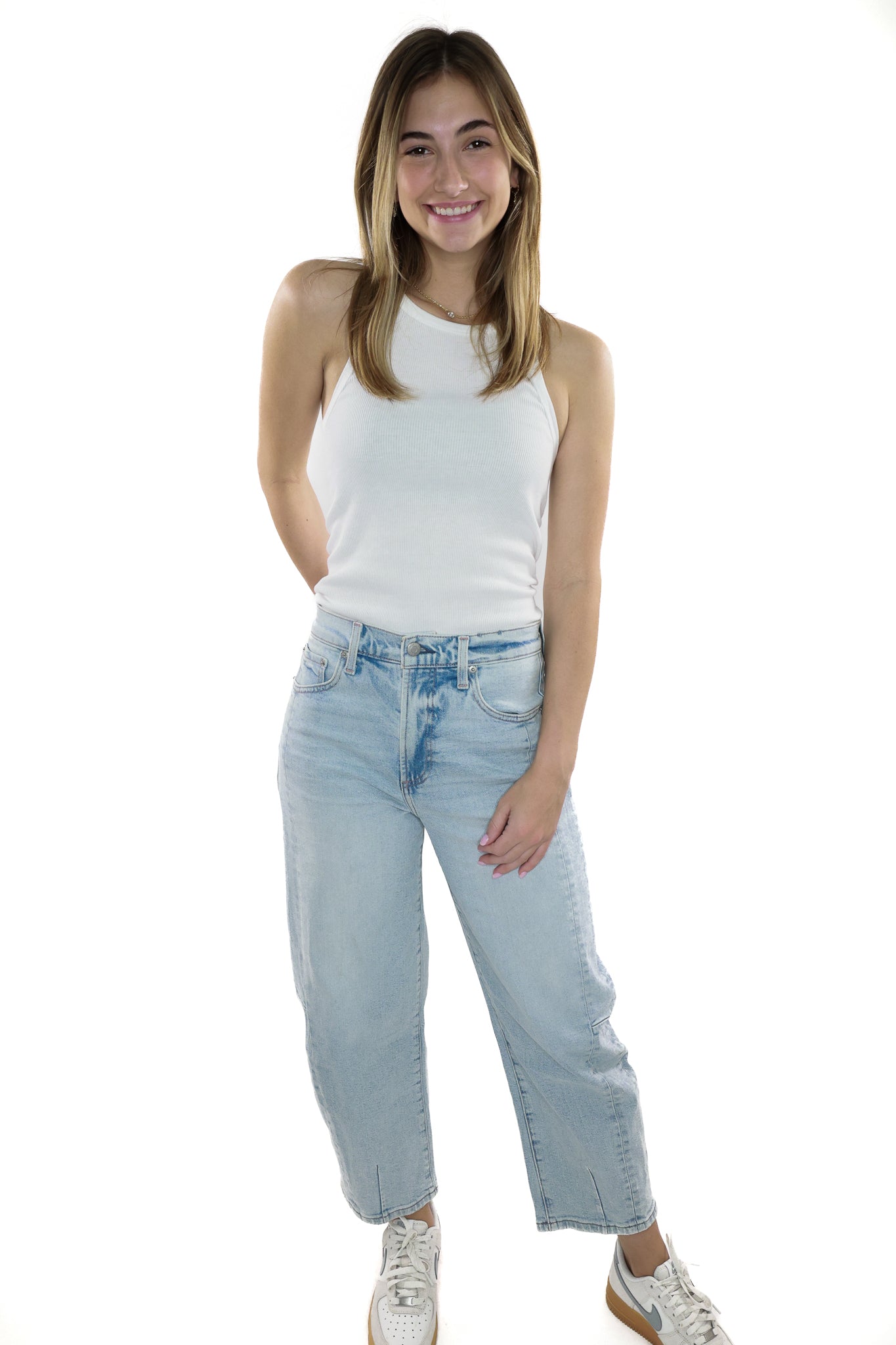 Crafted with a light wash denim and a flattering high rise cut, the Eli High Rise Jeans are a must-have for any wardrobe. The side seam detail adds a touch of uniqueness to these stylish jeans.