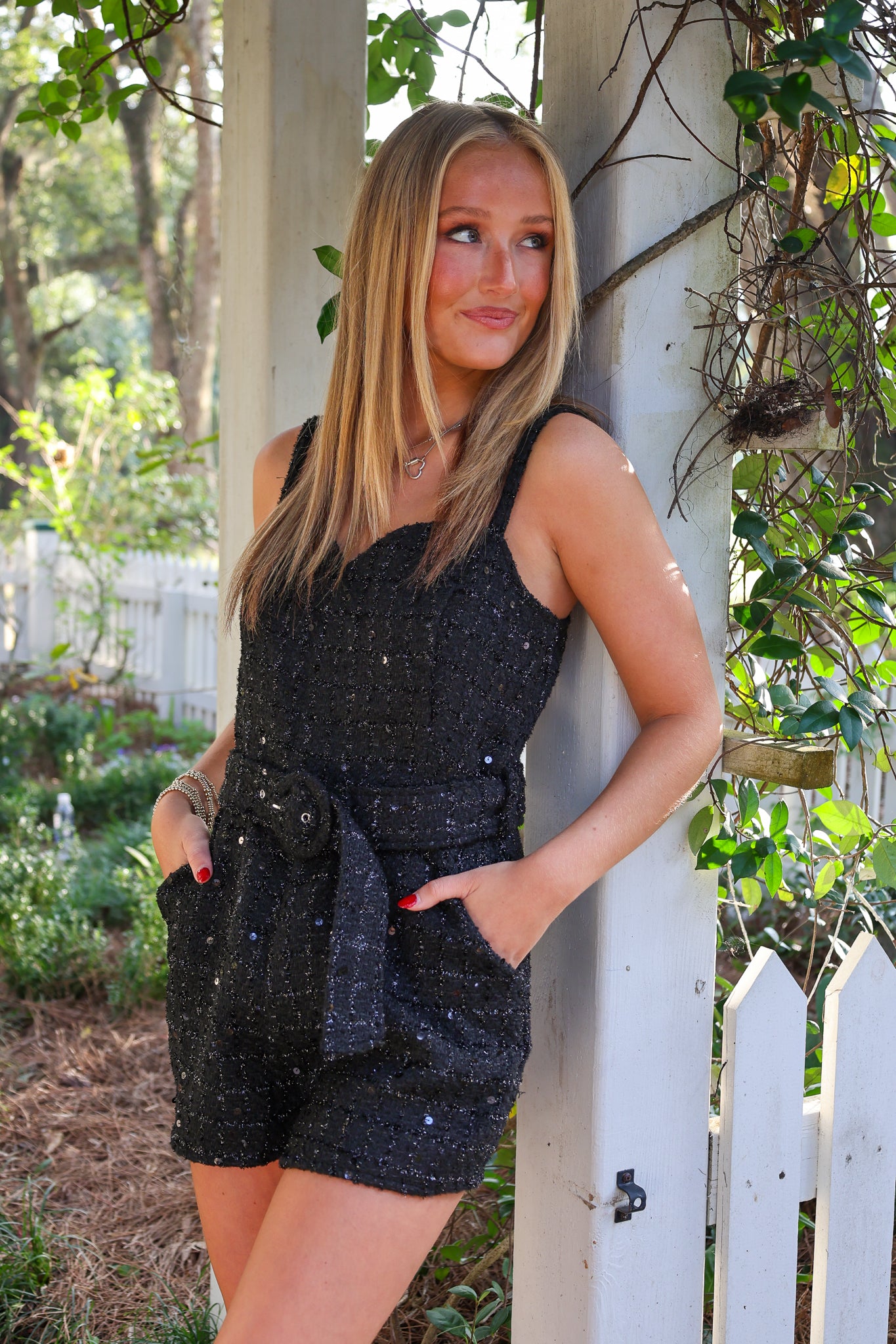 Elevate your style with the Eliza Tweed Romper. Crafted from black tweed and adorned with sequins, this sleeveless romper features a belted waist for a flattering silhouette. With convenient pockets, it's the perfect blend of fashion and function. Expertly designed for a chic, sophisticated look.