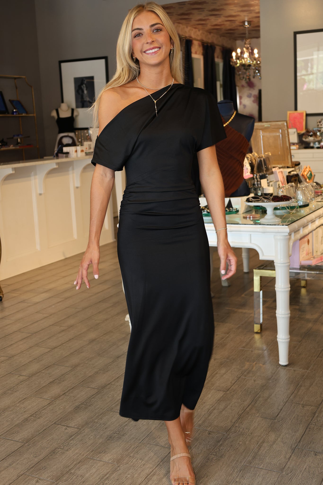 Turn heads in the Elizabeth Anne Dress, featuring a sleek black one-shoulder design and ruched sides that add a flattering, trendy touch. This midi dress hugs your curves just right, making it perfect for parties or nights out with friends. Dress it up with your favorite heels and accessories for a look that’s effortlessly cool and confident.
