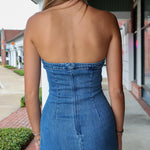 This Ella Stud Dress is a super cool strapless, bodycon mini dress made from denim. It’s got edgy silver stud accents that really make it pop, plus a back zipper for easy wear. Perfect for making a bold statement at your next party or night out!