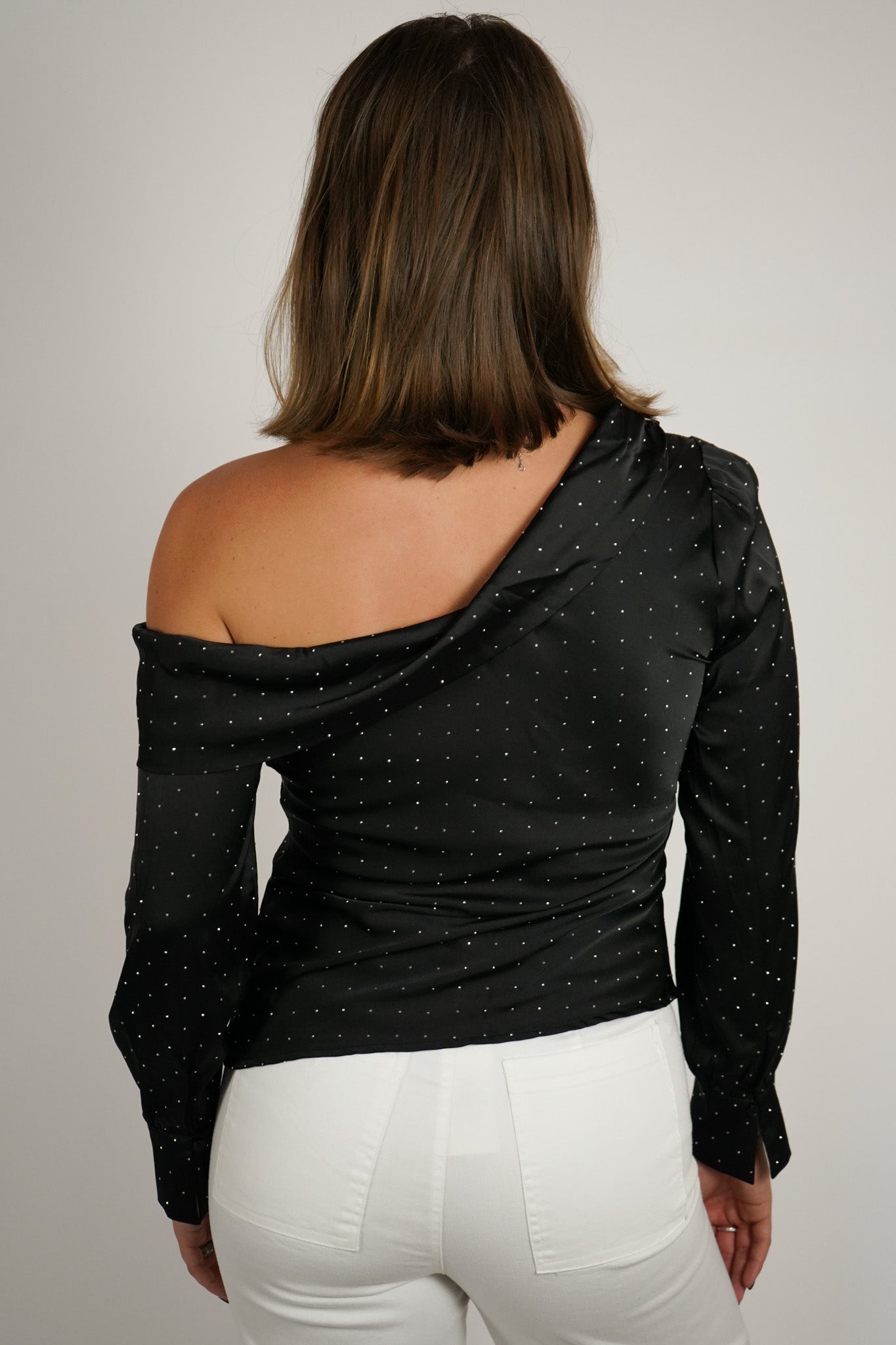Expertly crafted from luxurious black satin, the Ellen Top is a versatile addition to any wardrobe. Its long sleeves offer warmth and style, while the off the shoulder design adds a touch of elegance. Adorned with rhinestones, this top is perfect for any formal occasion.