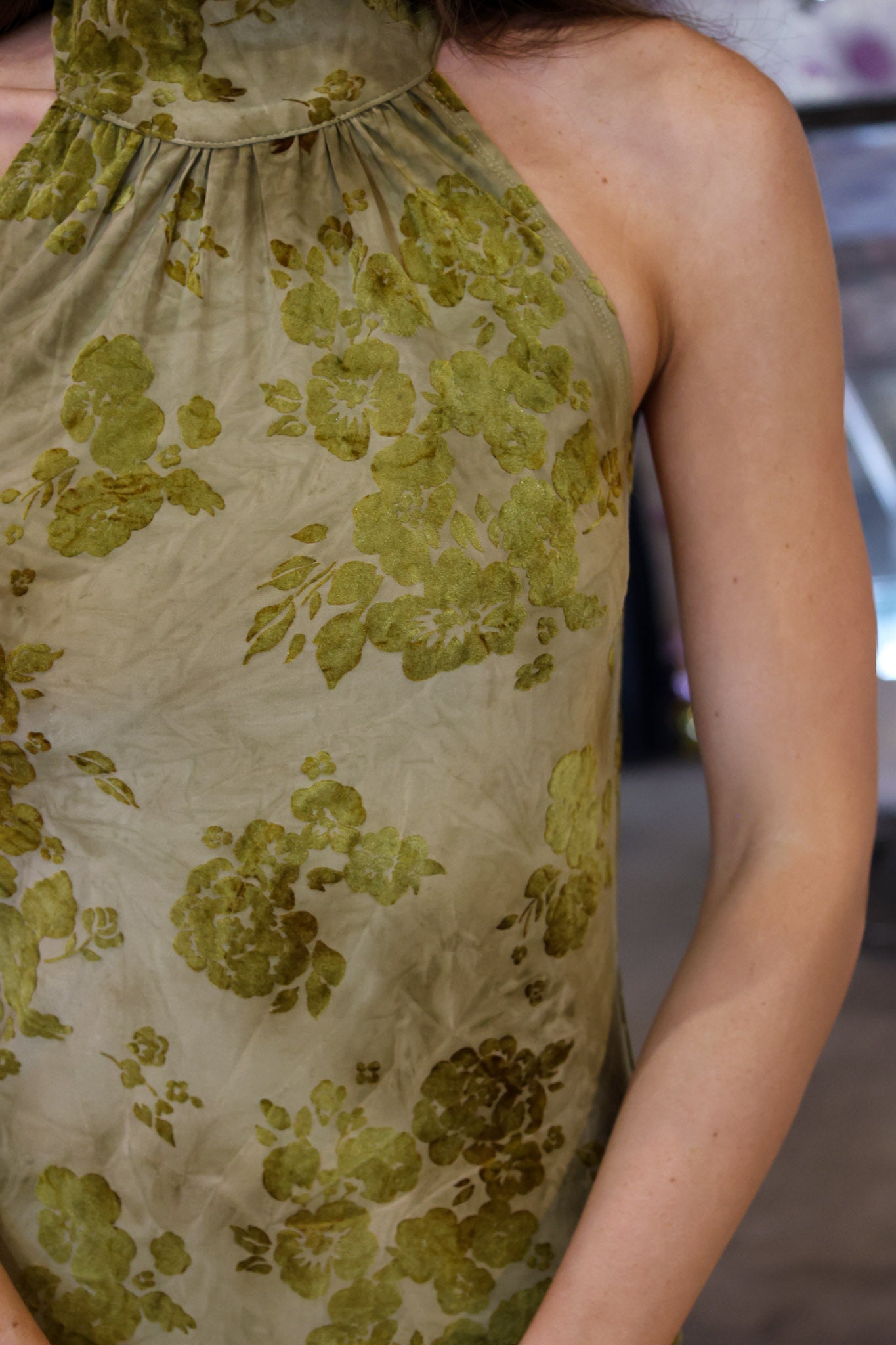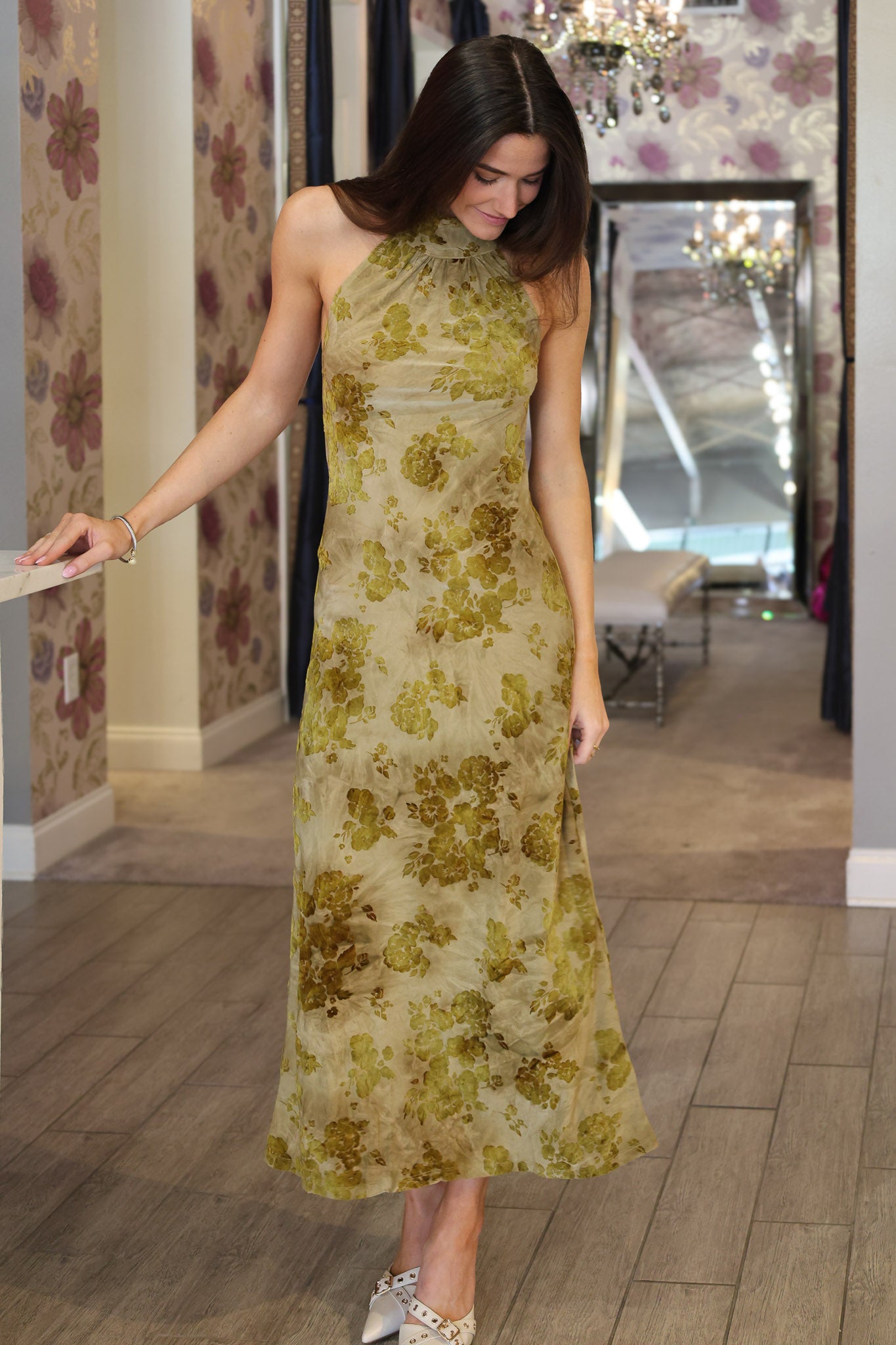 The Ellie Dress is a stunning velvet jacquard halter maxi in rich olive green shades—perfect for making a sophisticated statement at any occasion. Its luxe fabric and elegant silhouette deliver timeless glamour with modern edge.