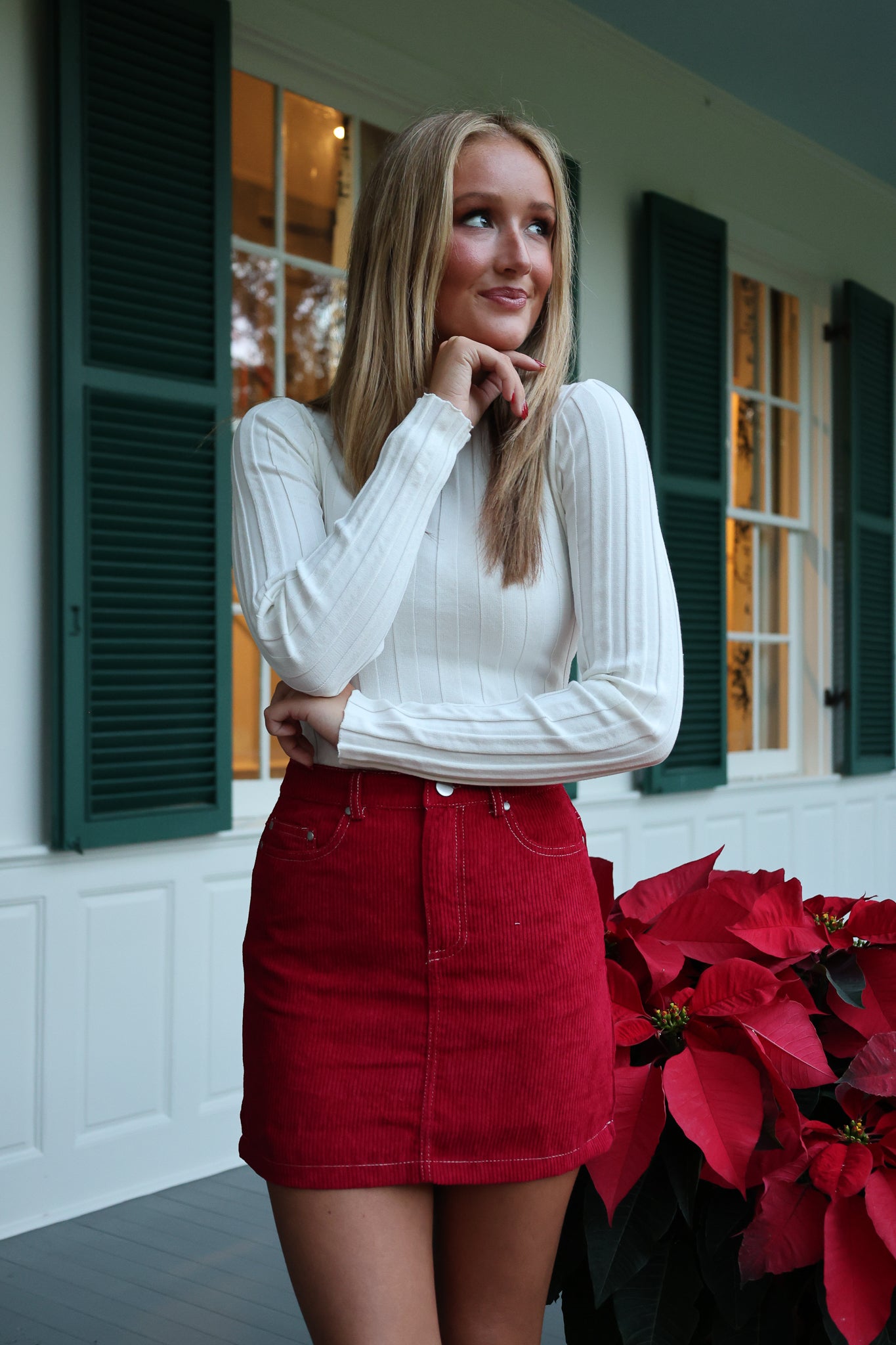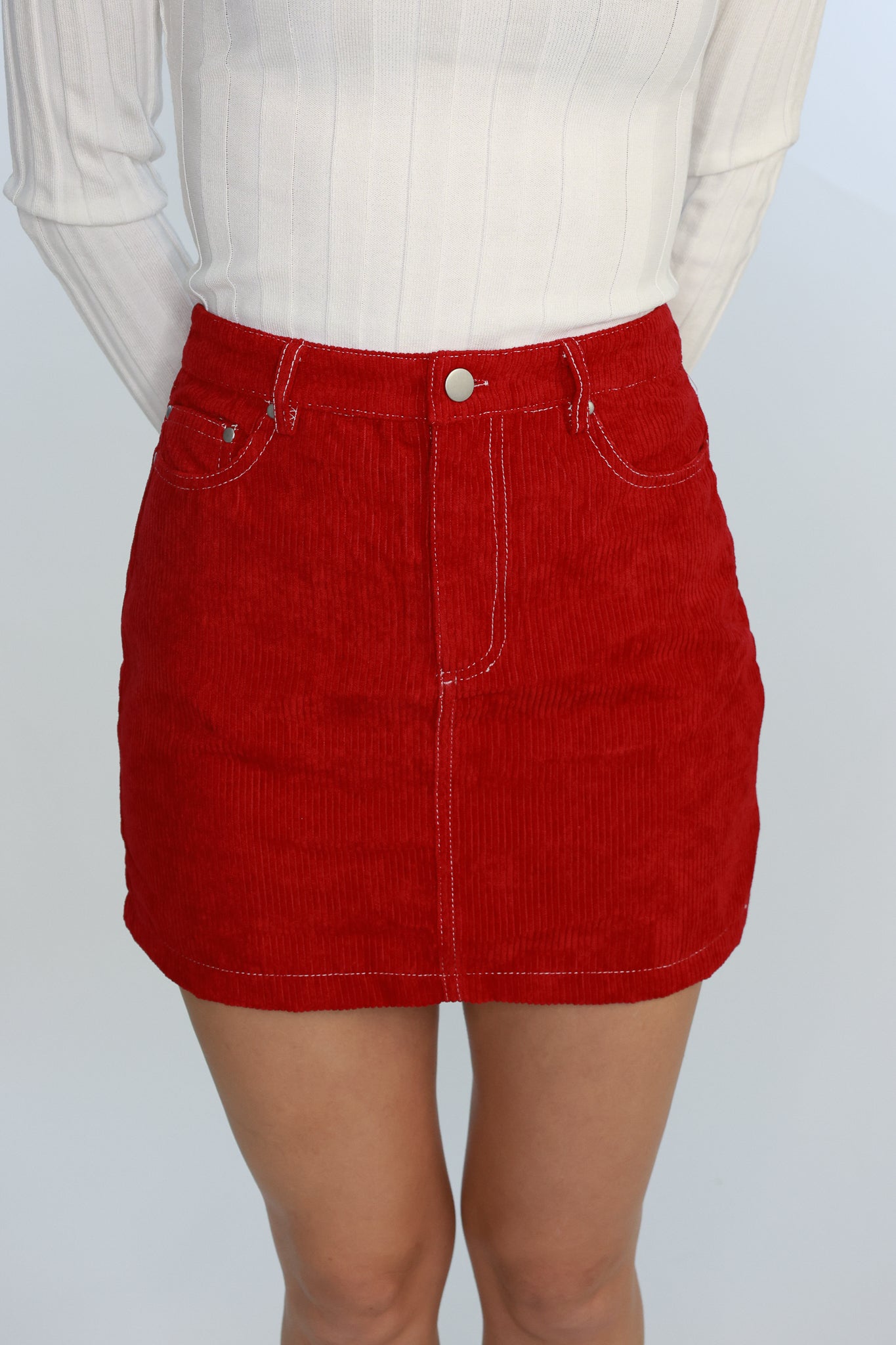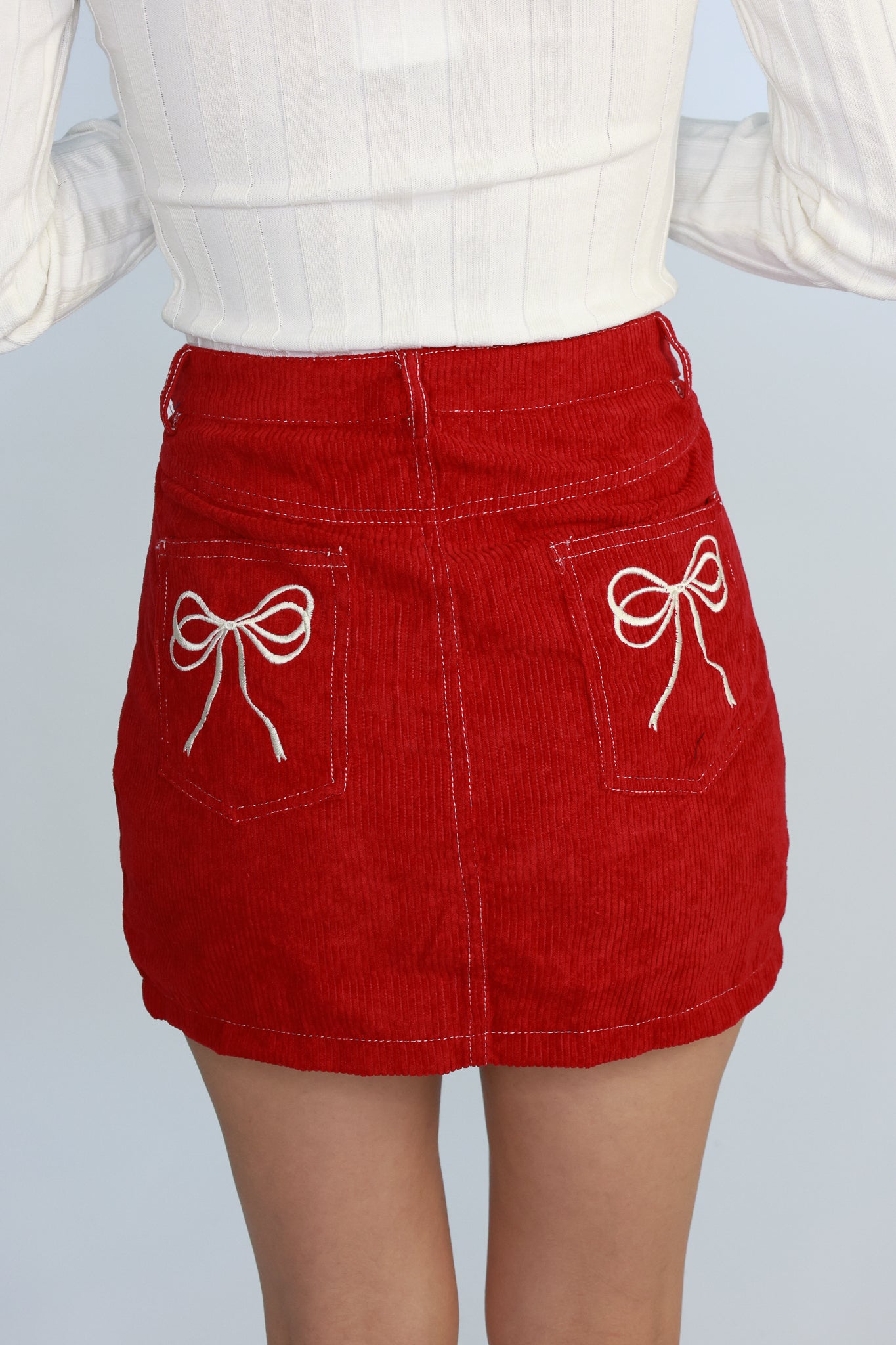 Add a playful touch to your wardrobe with the Emily Claire Mini Skirt. This corduroy red mini skirt features a unique monogram on the back pockets and a charming bow detail. Perfect for adding a pop of personality to any outfit.