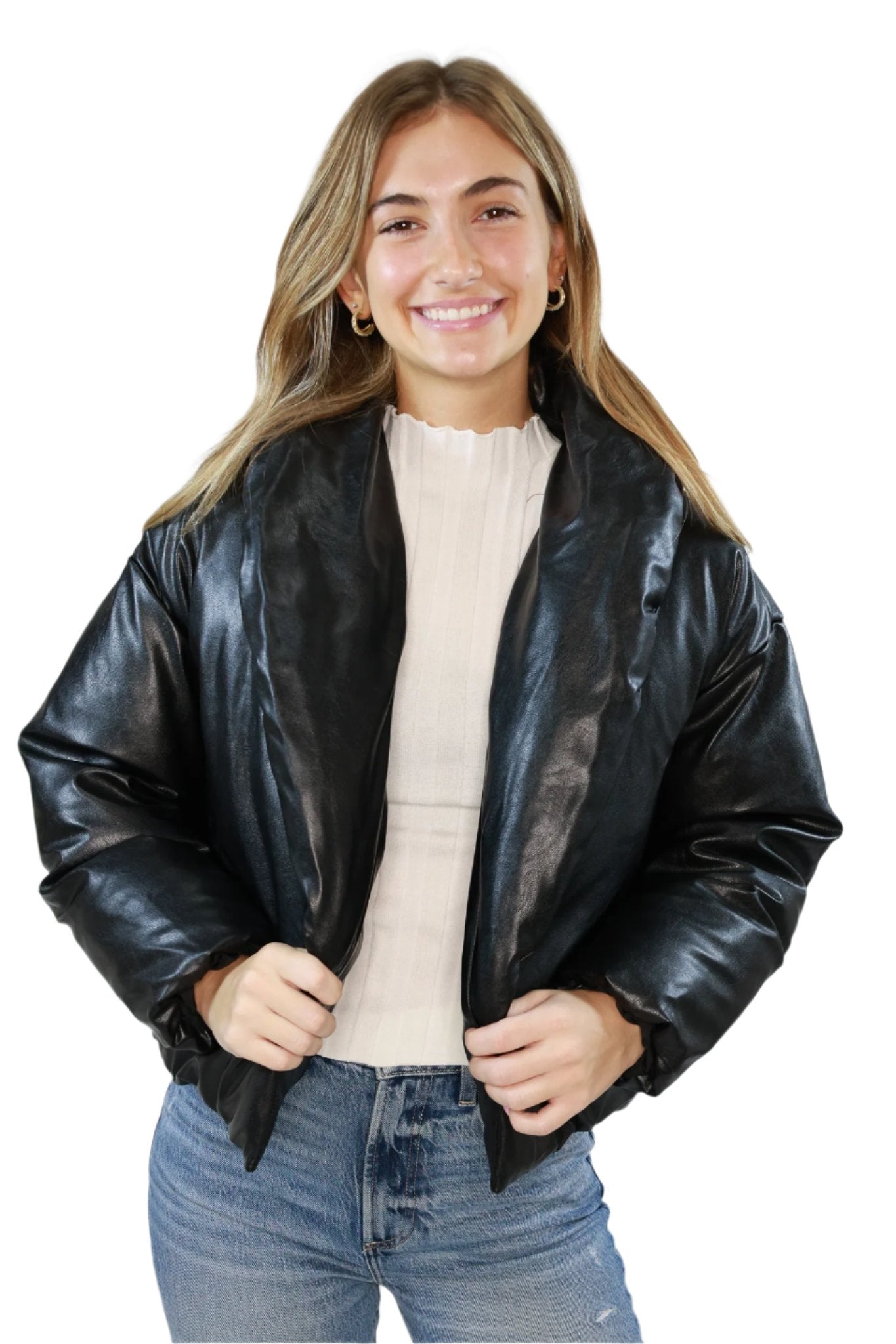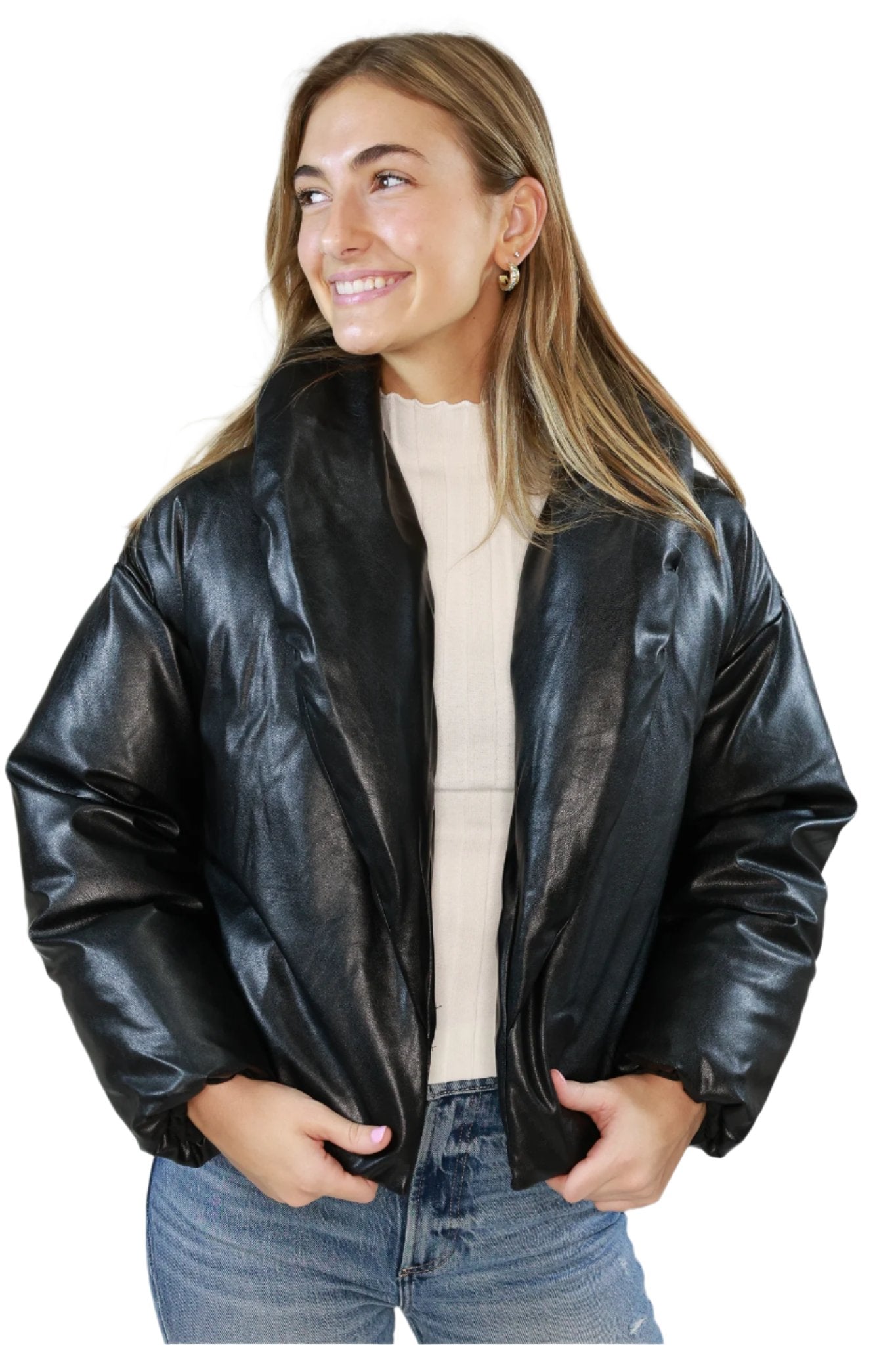 Introducing the Evy Jacket, the ultimate statement piece for any fashion-forward individual. Made with high-quality black faux leather, this puffer jacket not only offers a sleek and stylish look but also provides superior warmth and comfort. Stay on-trend and cozy with the Evy Jacket.