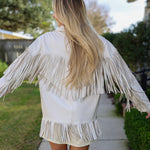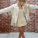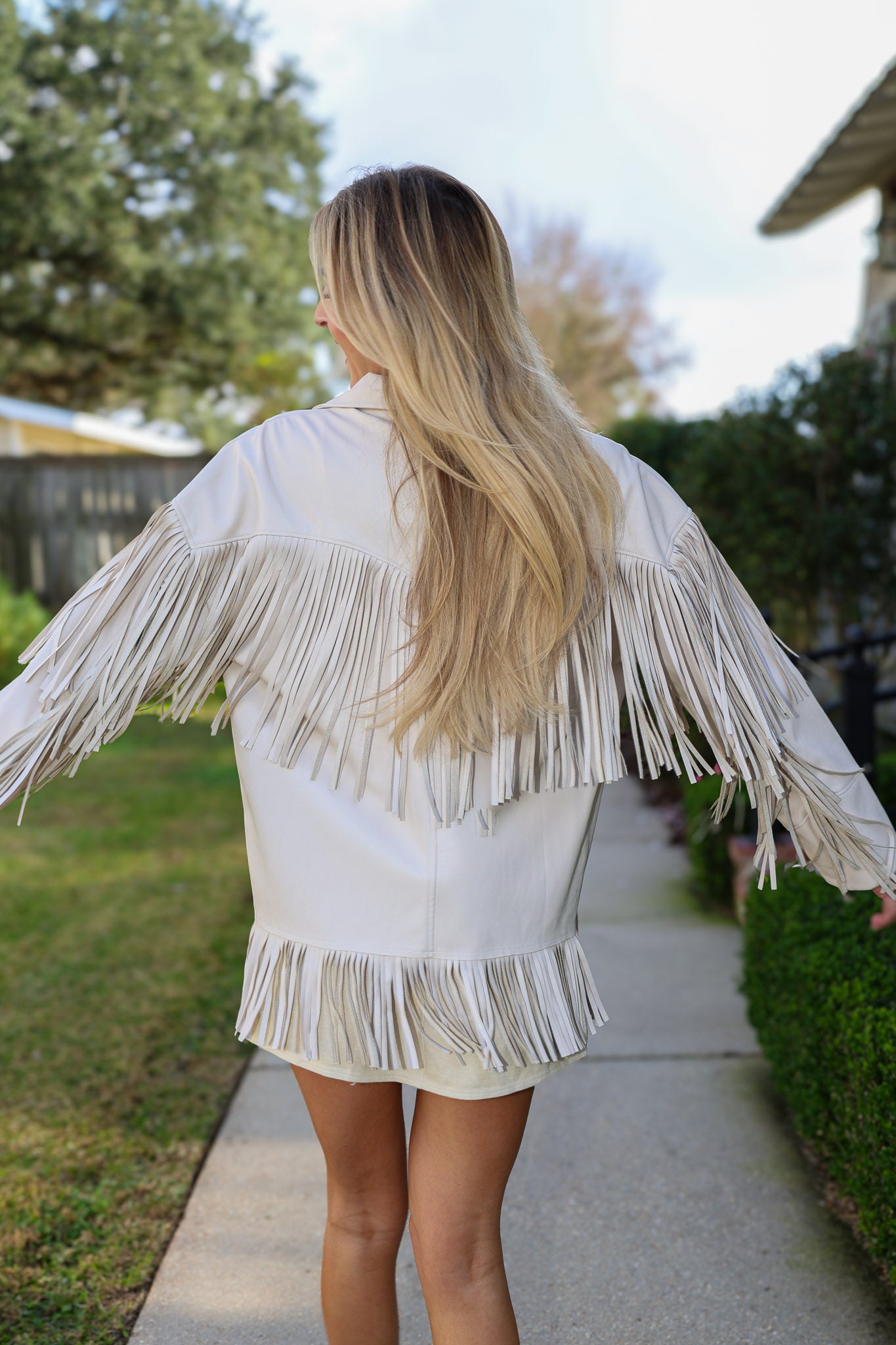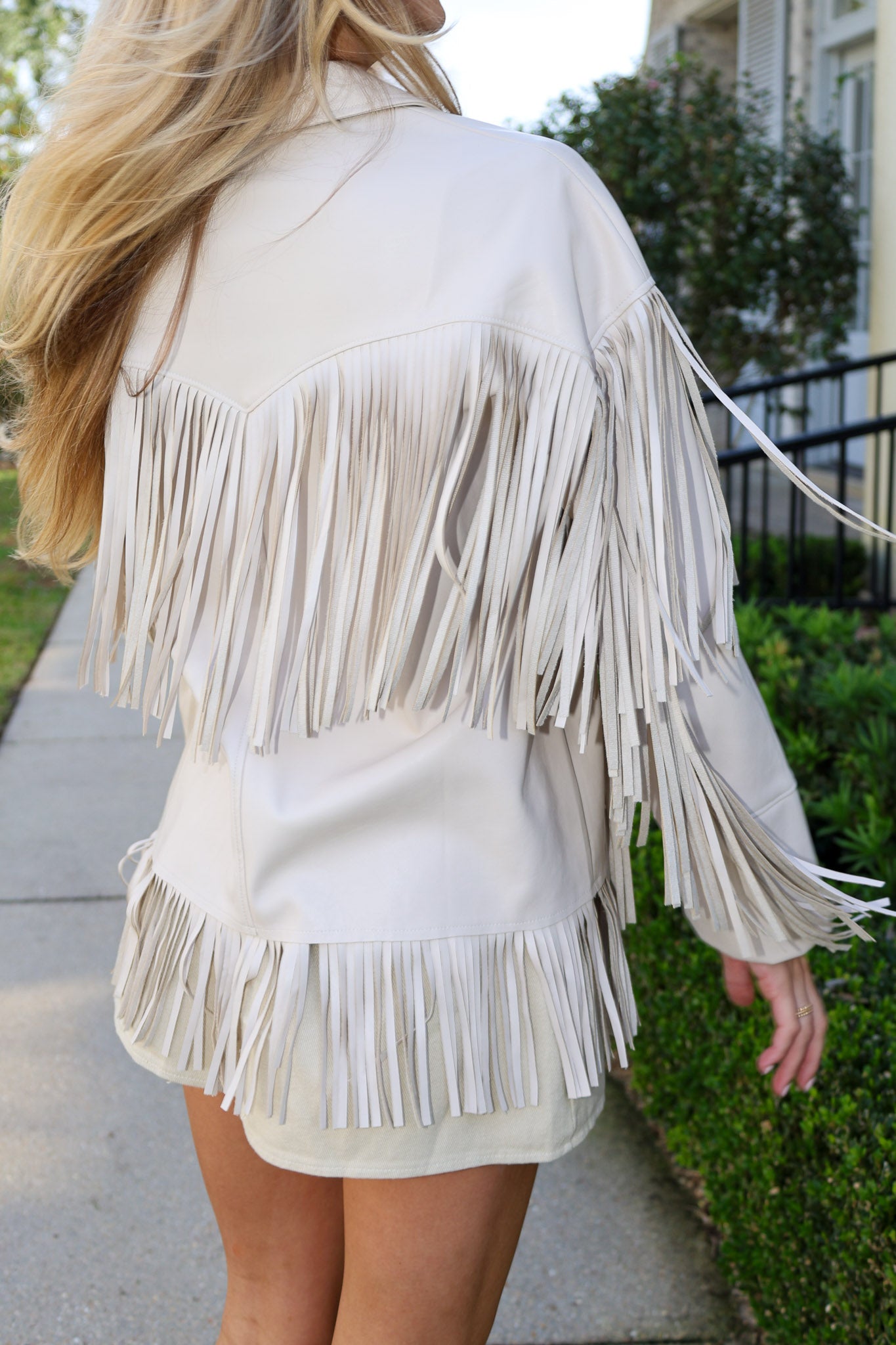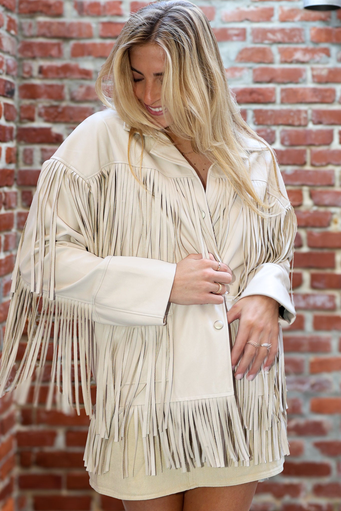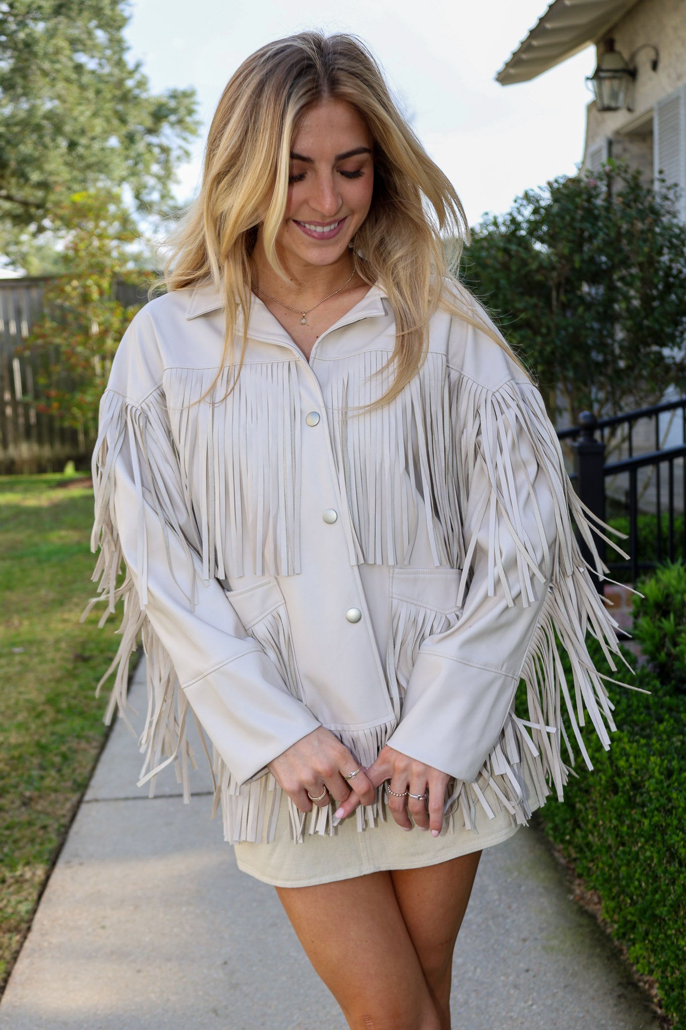 The Farrah Fringe Jacket is the edgy layer you've been waiting for. Made from vegan leather, it's got that cool factor without the guilt. The front snap closure makes it easy to throw on, while the fringe detail adds texture and movement that keeps things interesting. Perfect for staying on-trend while keeping it real.