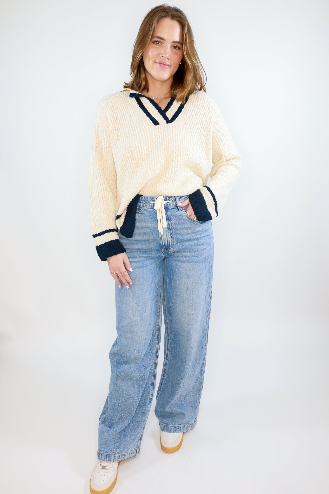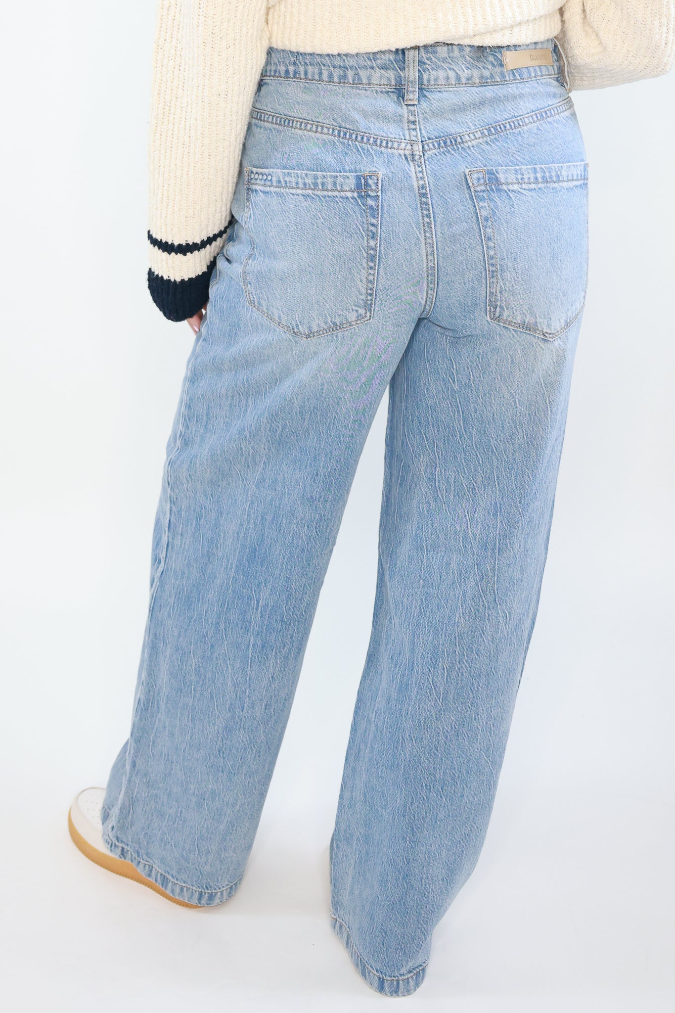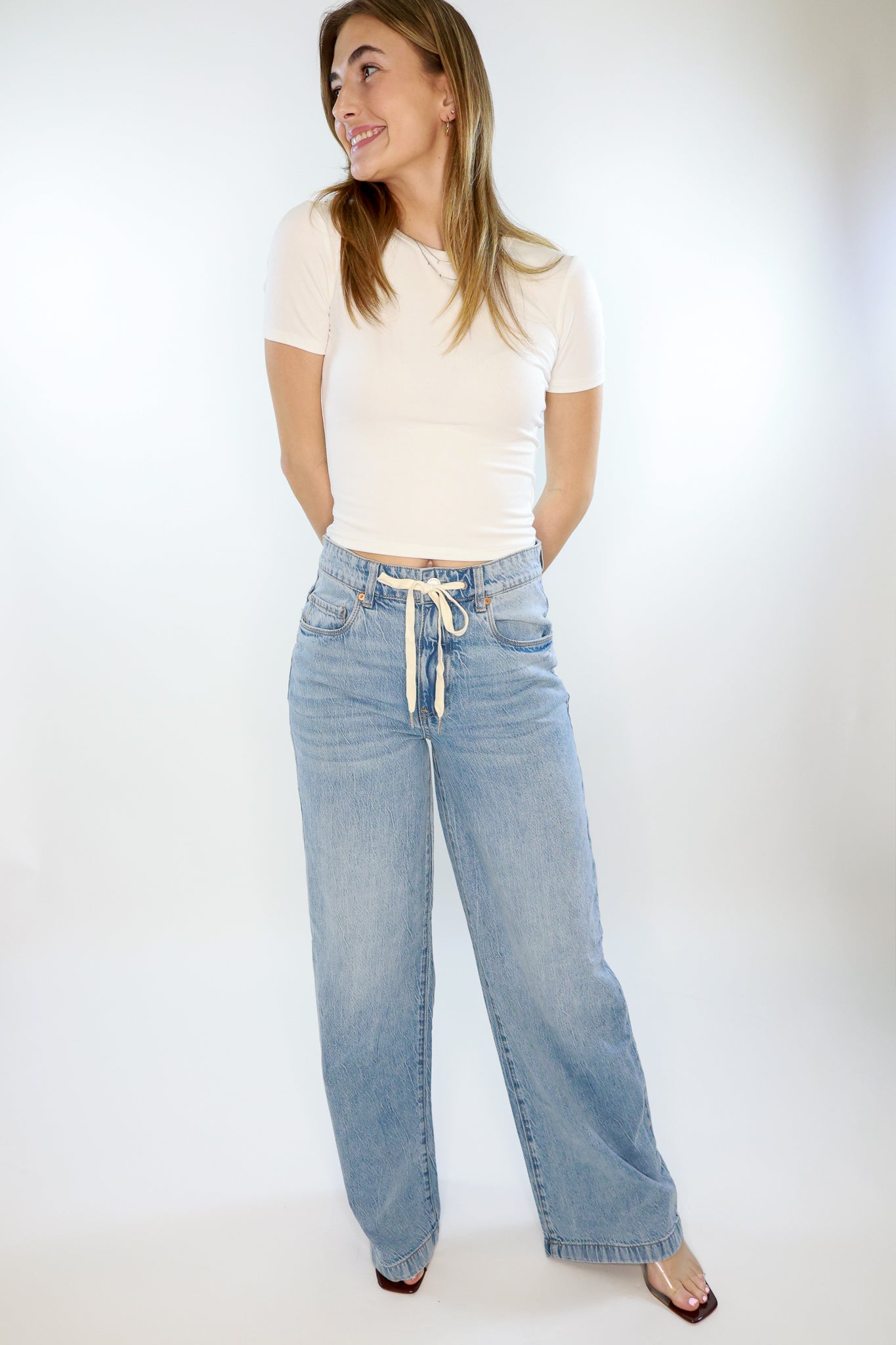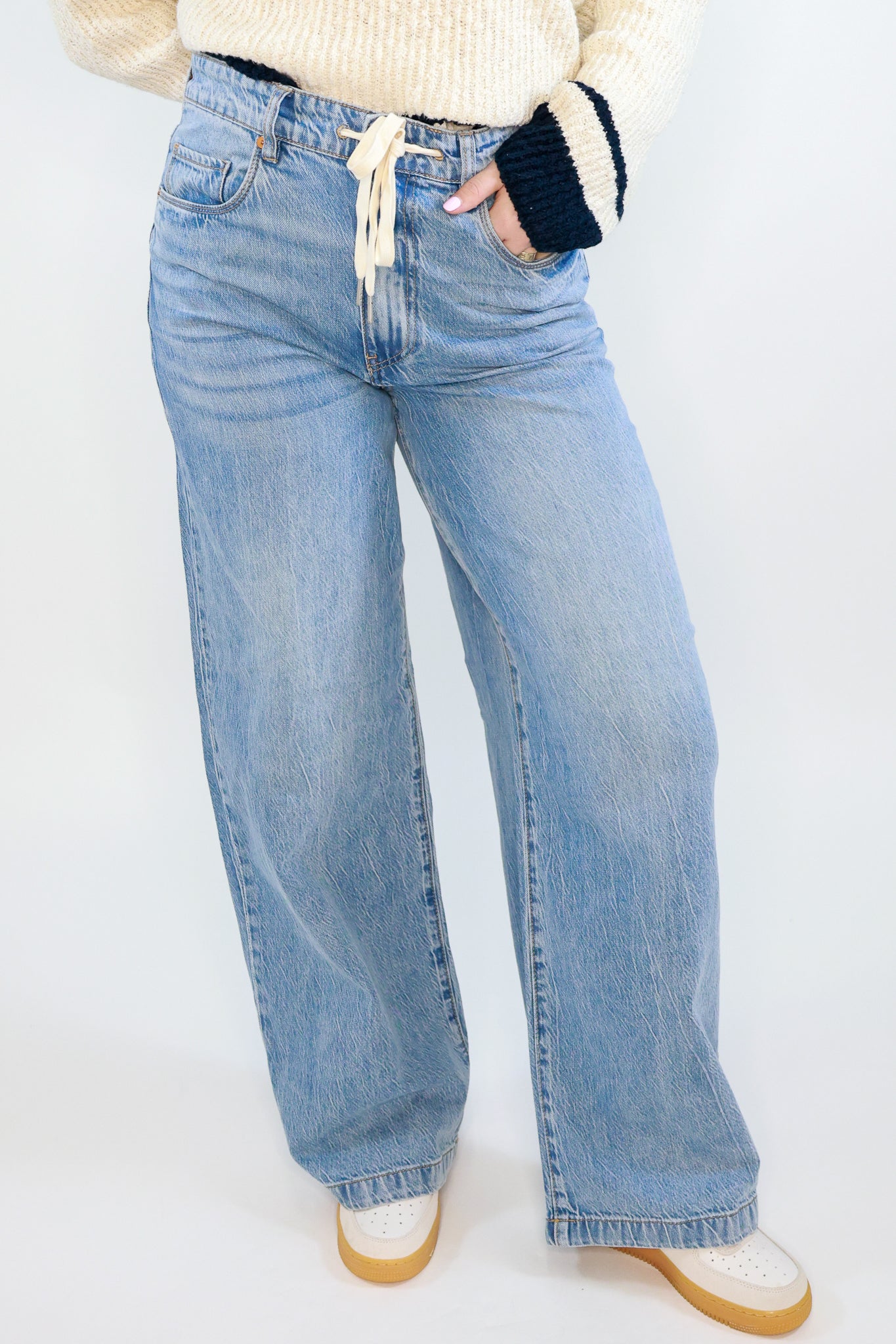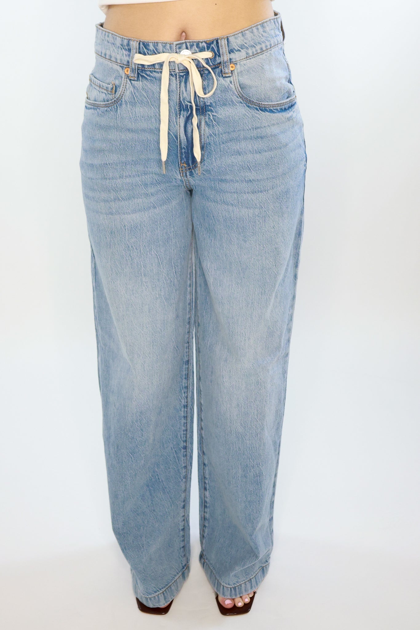 Expertly crafted with soft, medium washed denim, the Feeling Good Jean boasts a button and tie waist for a comfortable and effortless fit. Elevate your style and feel good all day long.