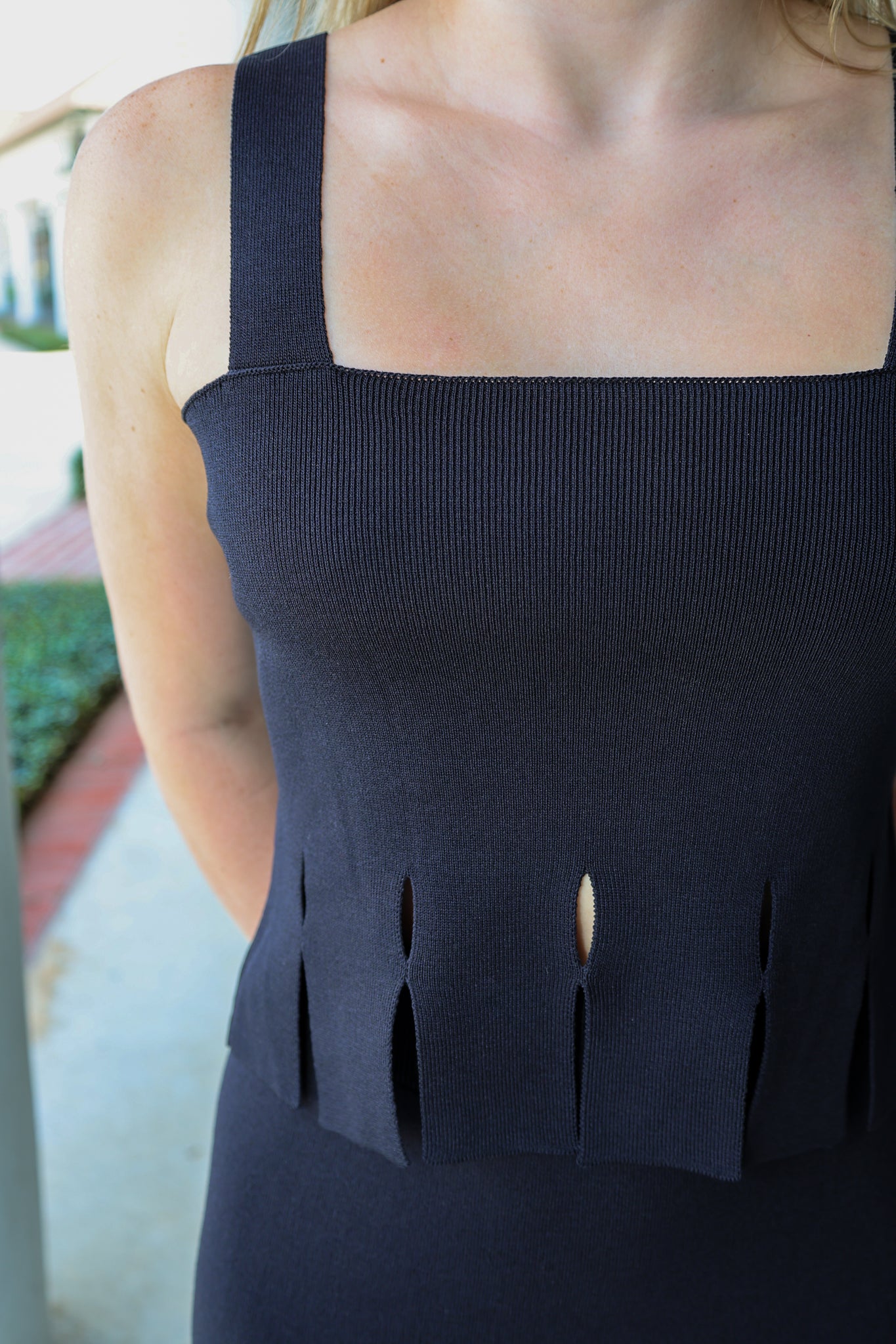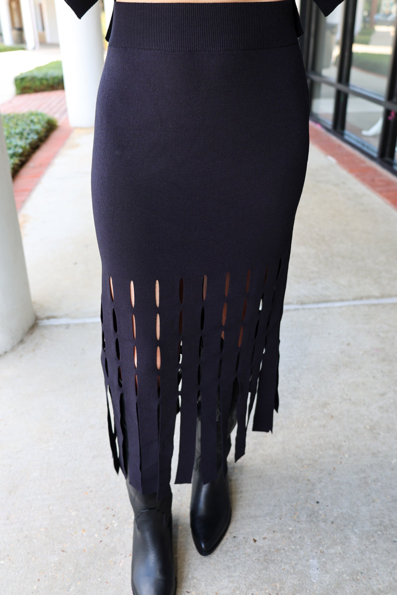 The Francesca Fringe Set is a black knit sleeveless top and midi skirt combo, styled with fringe hems on both pieces for a fun and edgy look. Perfect for chill days or nights out, this set brings a cool vibe with comfy knit fabric and trendy details that make you stand out.