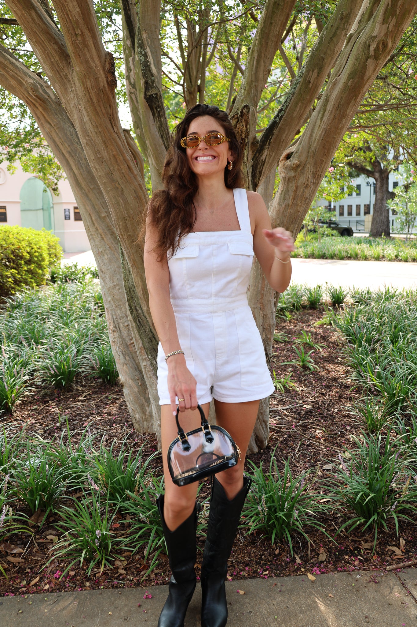 The Frida Romper is made from white denim with wide shoulder straps and an exposed back zipper for a cool, edgy look. It also has pockets, so you can keep your essentials close while staying stylish and comfy. Perfect for hanging out or going on adventures!