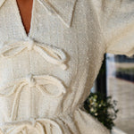 Get ready to slay in the Gabby Tweed Skirt Set! This ivory tweed skirt features puff short sleeves, a trendy front tie accent, and a chic v-neck collar. With front pockets for your essentials. Perfect for adding a stylish, vintage-inspired vibe to your wardrobe!