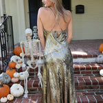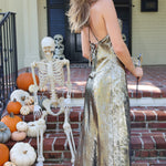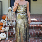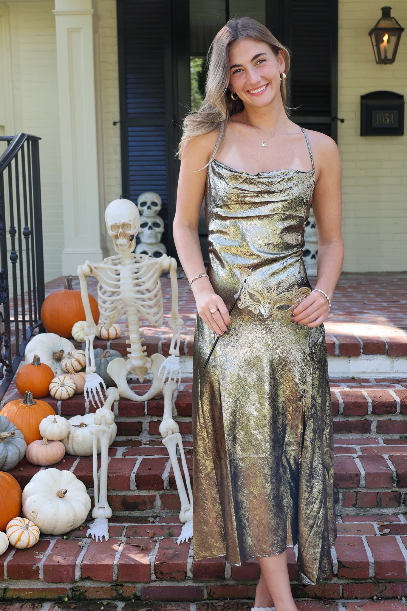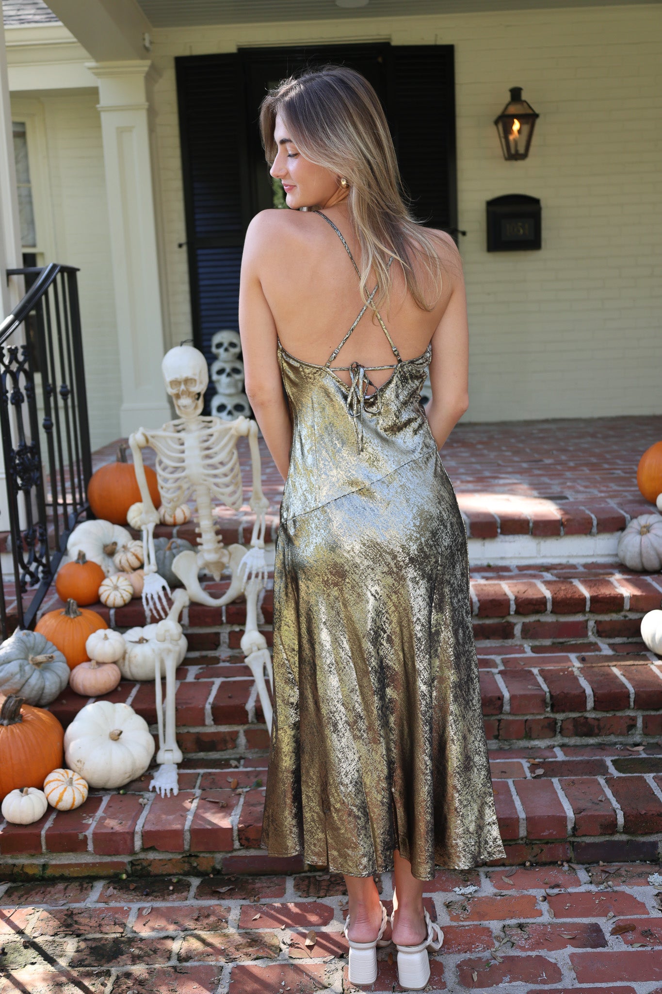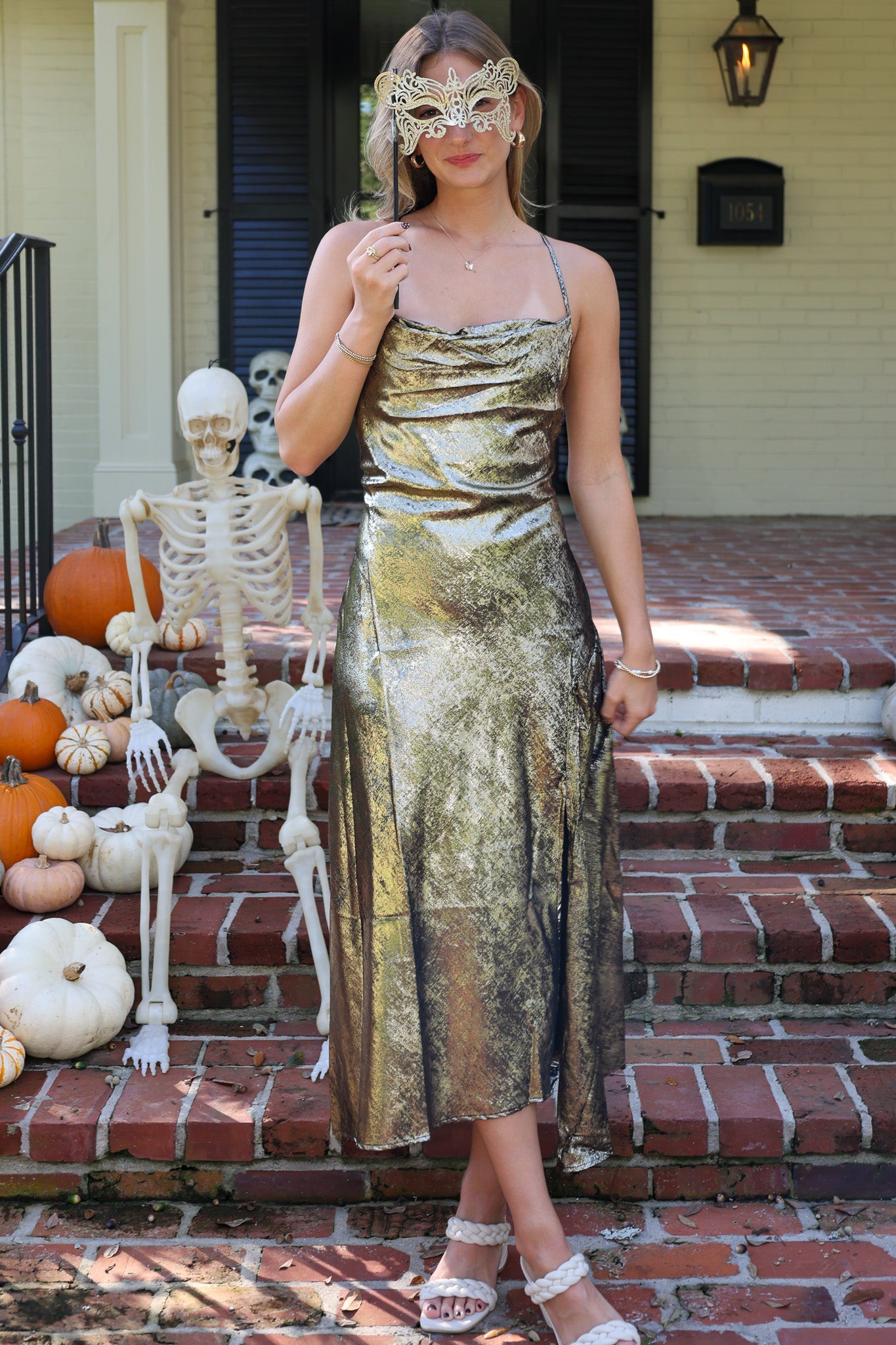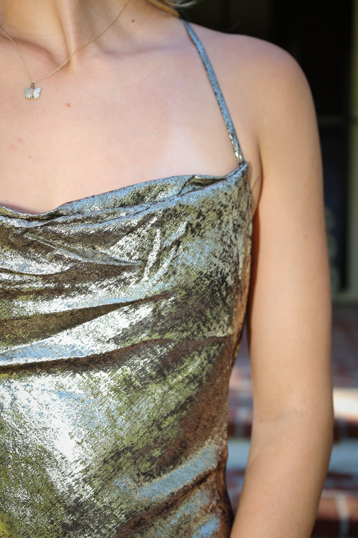 Get ready to shine in the Gaia Midi Dress! This metallic beauty features a trendy cowl neck and a daring low back that’s perfect for making a statement. The left side slit adds an edgy vibe while letting you move comfortably. Whether it's a party or a night out, this dress combines cool style with ultimate confidence.