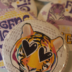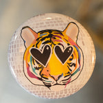 Rock your game day vibe with the Disco Tiger button! Featuring a cool tiger face with heart eyes, this badge shows off your fierce love for the team in style. Perfect for adding some fun and flair to your jacket or backpack while cheering on your squad. Stay wild, stay passionate!