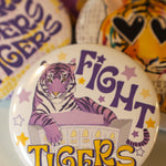 Show your team spirit with the Game Day Button – Fight! Featuring a bold purple tiger and "Fight Tigers" in purple and yellow, this button is perfect for hyping up your crew. Pin it on your backpack or jacket and rep your colors loud and proud during every game!