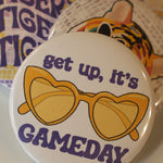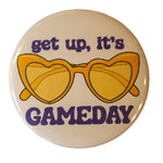 Amp up your game day energy with the Heart Sunnies button! Rocking purple and yellow vibes, it shouts "Get Up, It's Gameday" to get everyone hyped. Perfect to pin on your jacket or bag for showing off your team pride in a fun, stylish way!