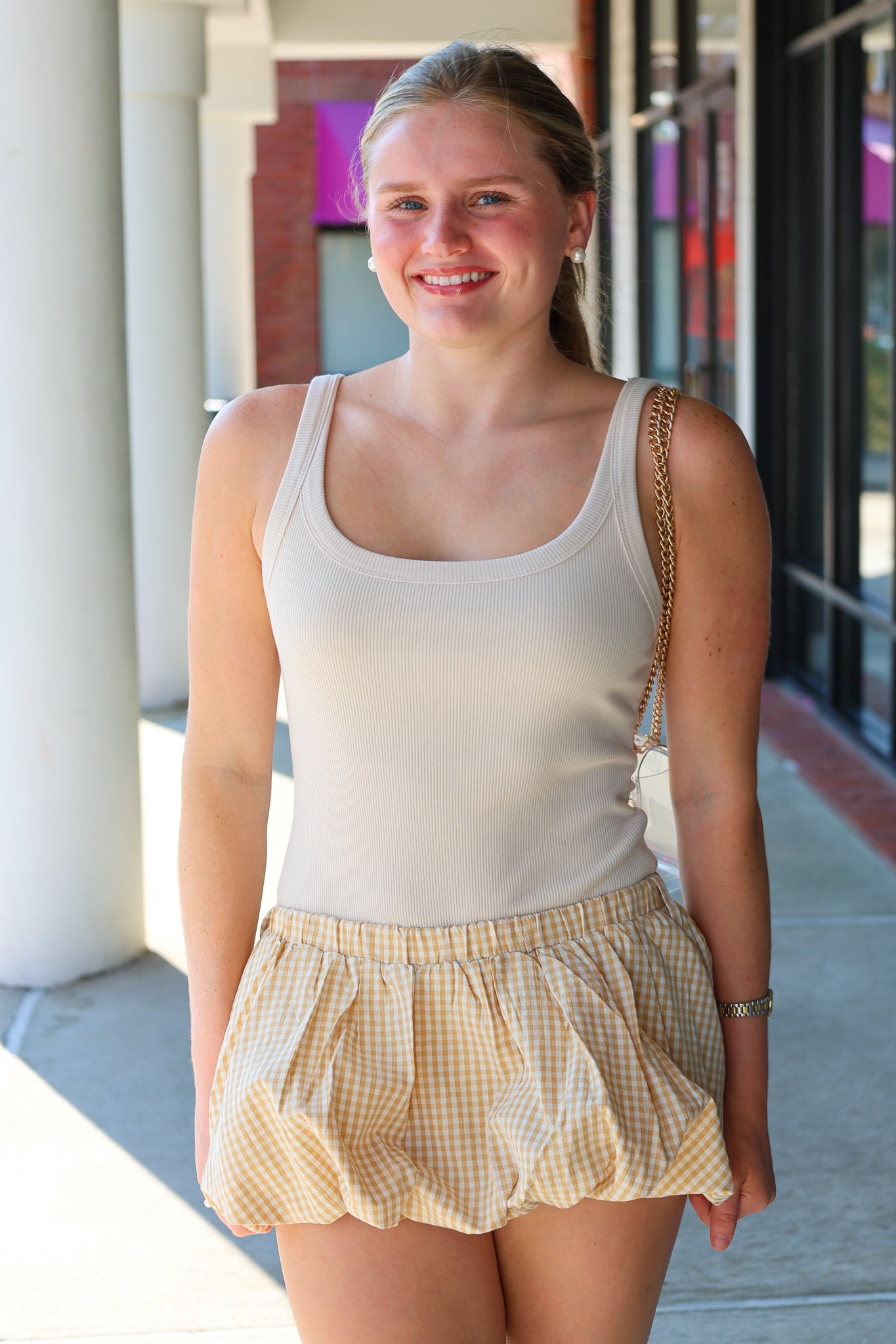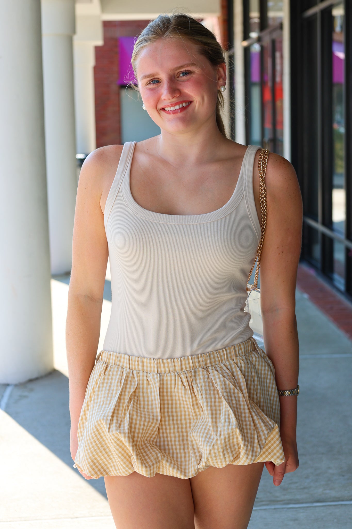 This Gemi Bubble Skirt features a fun gingham print and a micro mini length that’s perfect for showing off your style. The bubble design adds a playful, voluminous feel, while built-in boy shorts keep you comfy and confident all day. The low elastic waist makes it easy to wear and move around in. Perfect for casual hangouts or dressing up your summer look!